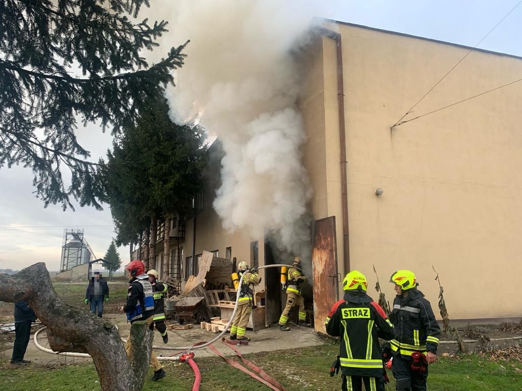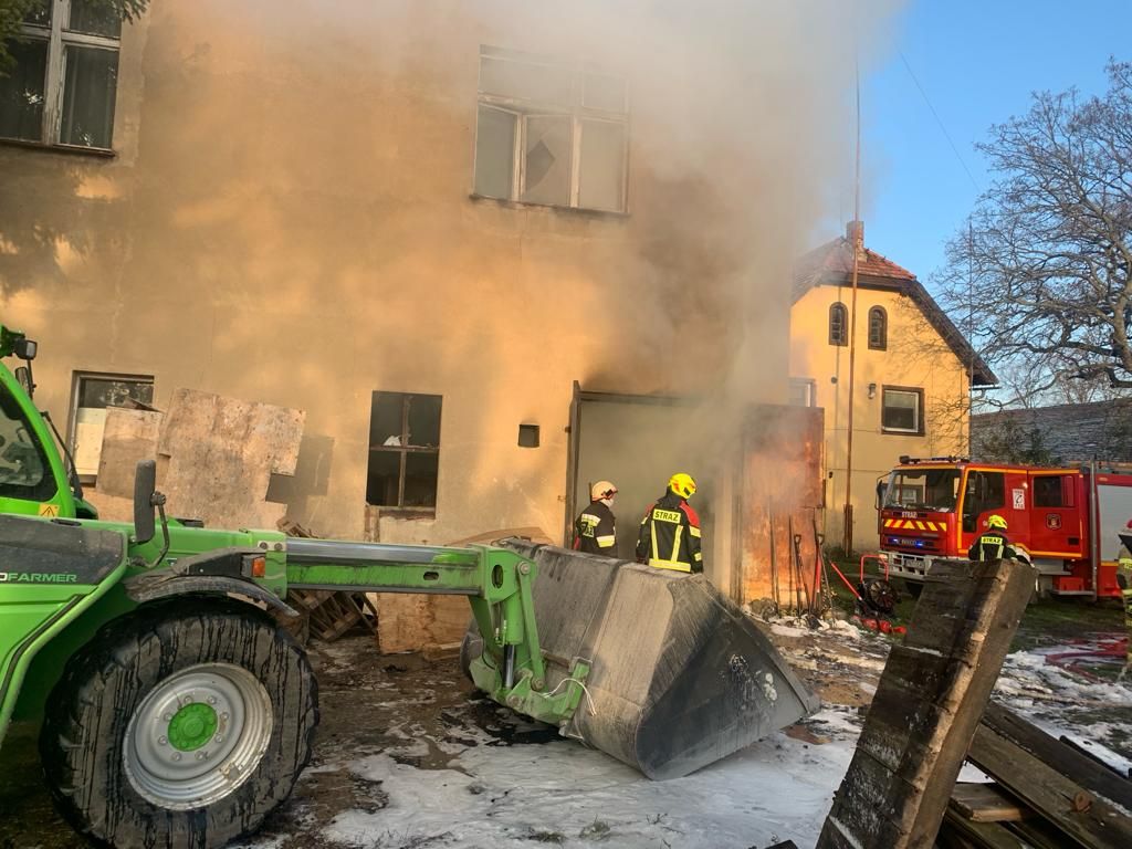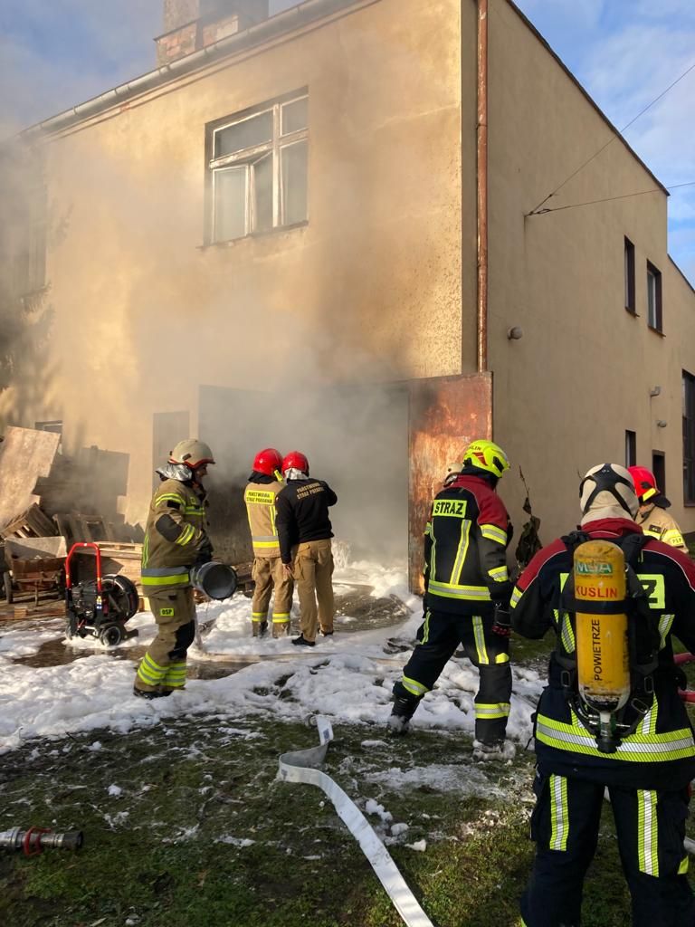 Po przybyciu zastępów straży pożarnej na miejsce zdarzenia zastano pożar warsztatu. Pożar powstał w wyniku zapalenia się materiałów palnych znajdujących się na piecu, w którym było rozpalone. W warsztacie znajdowało się ok. 100 litrów przepracowanego oleju silnikowego w beczkach, który udało się odizolować od pożaru. Na miejscu zdarzenia nikt nie wymagał pomocy medycznej.