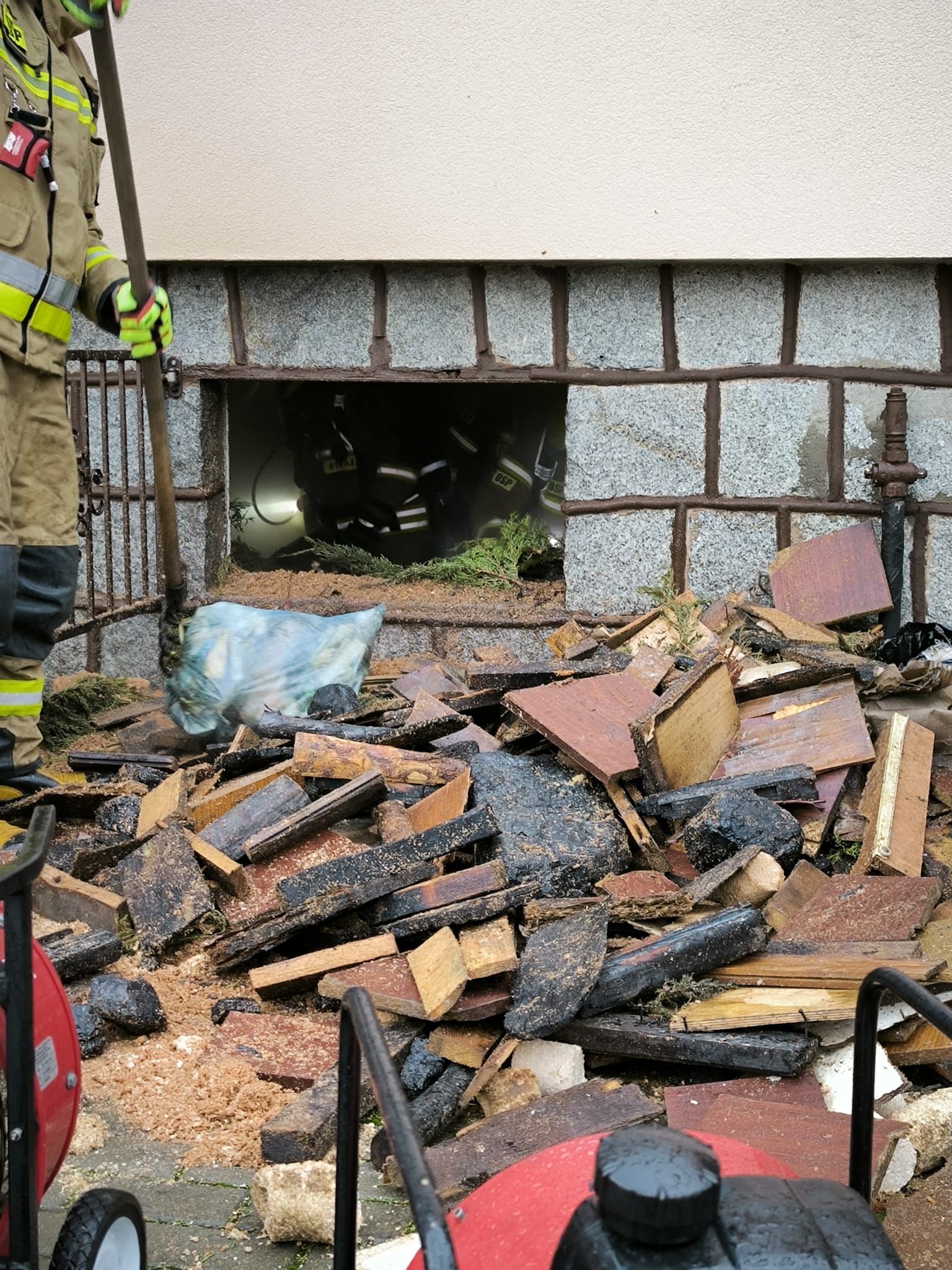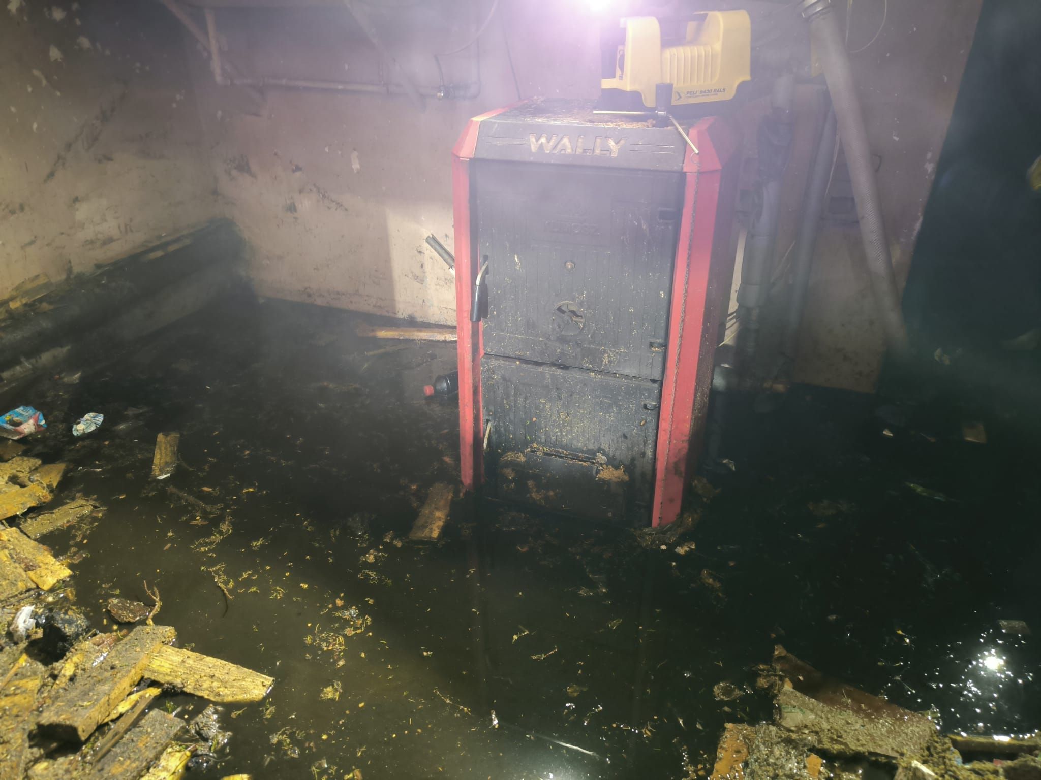 Po przybyciu pierwszych zastępów na miejsce zdarzenia zastano na zewnątrz czworo lokatorów, którzy opuścili budynek nie odnosząc przy tym żadnych obrażeń i wymagali pomocy medycznej. Ratownicy zastali duże zadymienie w piwnicy składającej się z dwóch pomieszczeń, pomiędzy którymi znajdował się piec centralnego ogrzewania oraz piec gazowy. Pomieszczenia te służyły jako skład opału oraz innych odpadów. Ze względu na duże nagromadzenie materiałów palnych oraz ich rodzaj, proces palenia przebiegał w postaci tlenia. Z uwagi na konstrukcję budynku zadysponowany na miejsce zastęp SD 30 został wycofany do bazy. Z uwagi na brak możliwości odłączenia zasilania gazowego oraz energetycznego na miejsce zdarzenia wezwano odpowiednie służby.
