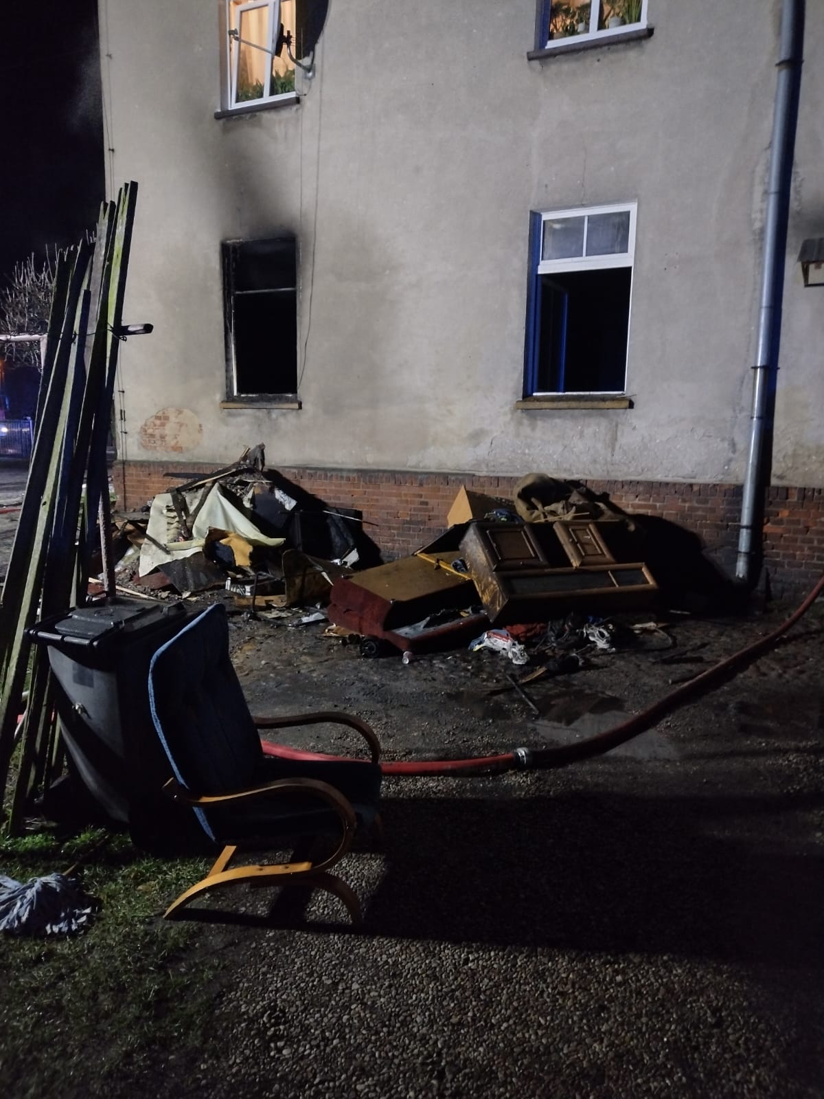 Po przybyciu na miejsce zdarzenia jednostek straży pożarnej zastano palące się mieszkanie na parterze oraz zadymioną klatkę schodową budynku wielorodzinnego. Budynek dwukondygnacyjny, w którym znajdowało się 6 mieszkań. Łącznie przebywało w nim 15 osób, 8 mieszkańców opuściło budynek przed przybyciem Straży Pożarnej.