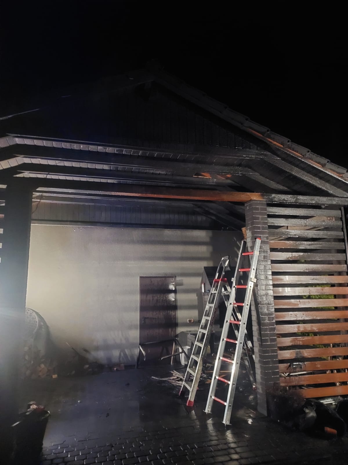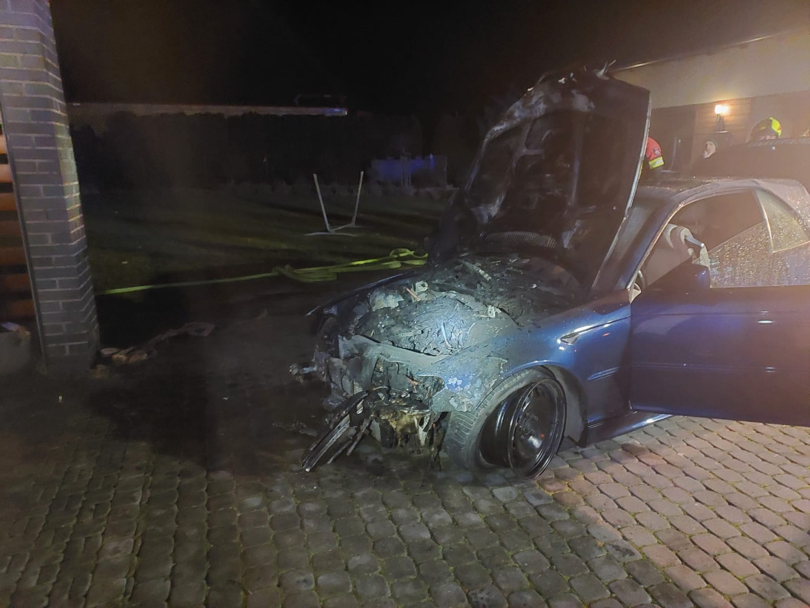 Po przybyciu na miejsce zdarzenia jednostek straży pożarnej zastano palący się przód pojazdu osobowego znajdującego się pod wiatą, która przylegała do budynku gospodarczego.