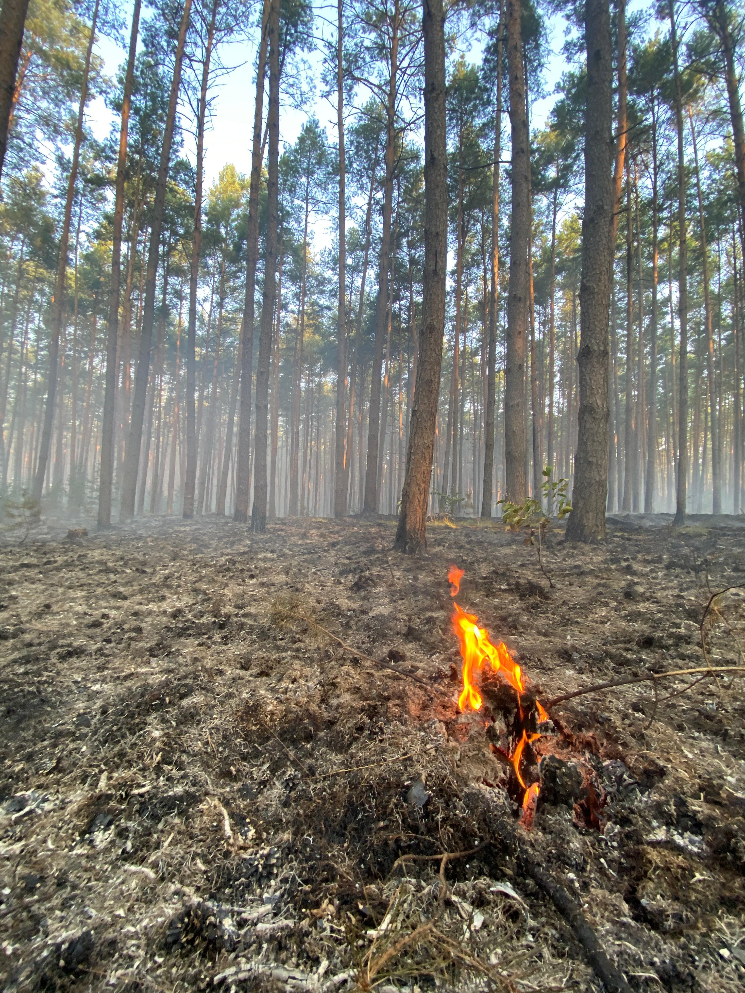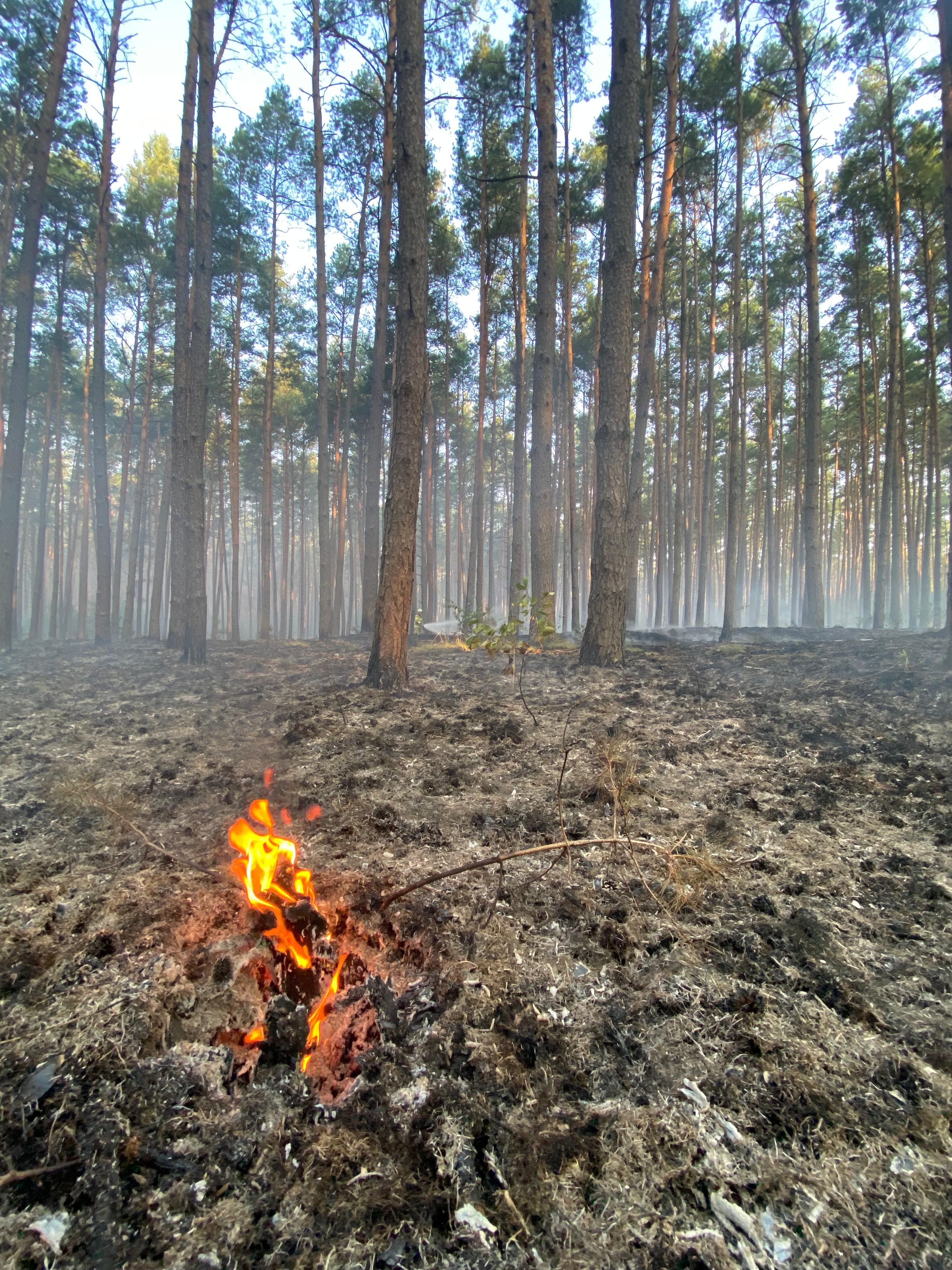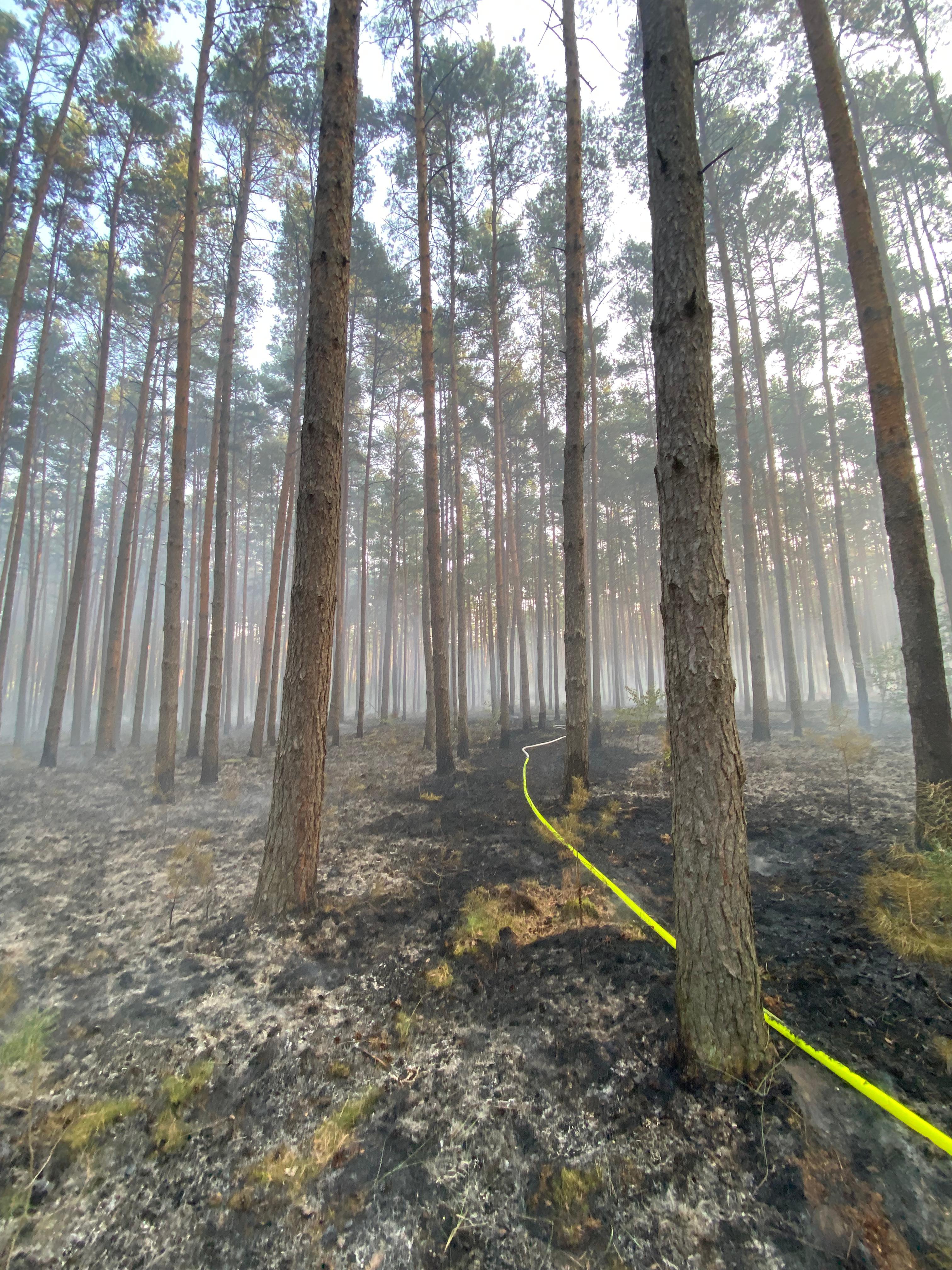 Po przybyciu zastępów straży pożarnej na miejsce zdarzenia zastano pożar ściółki w lesie sosnowym na pow. ok 1,2 ha.