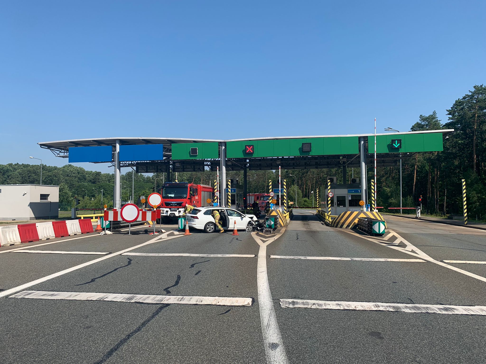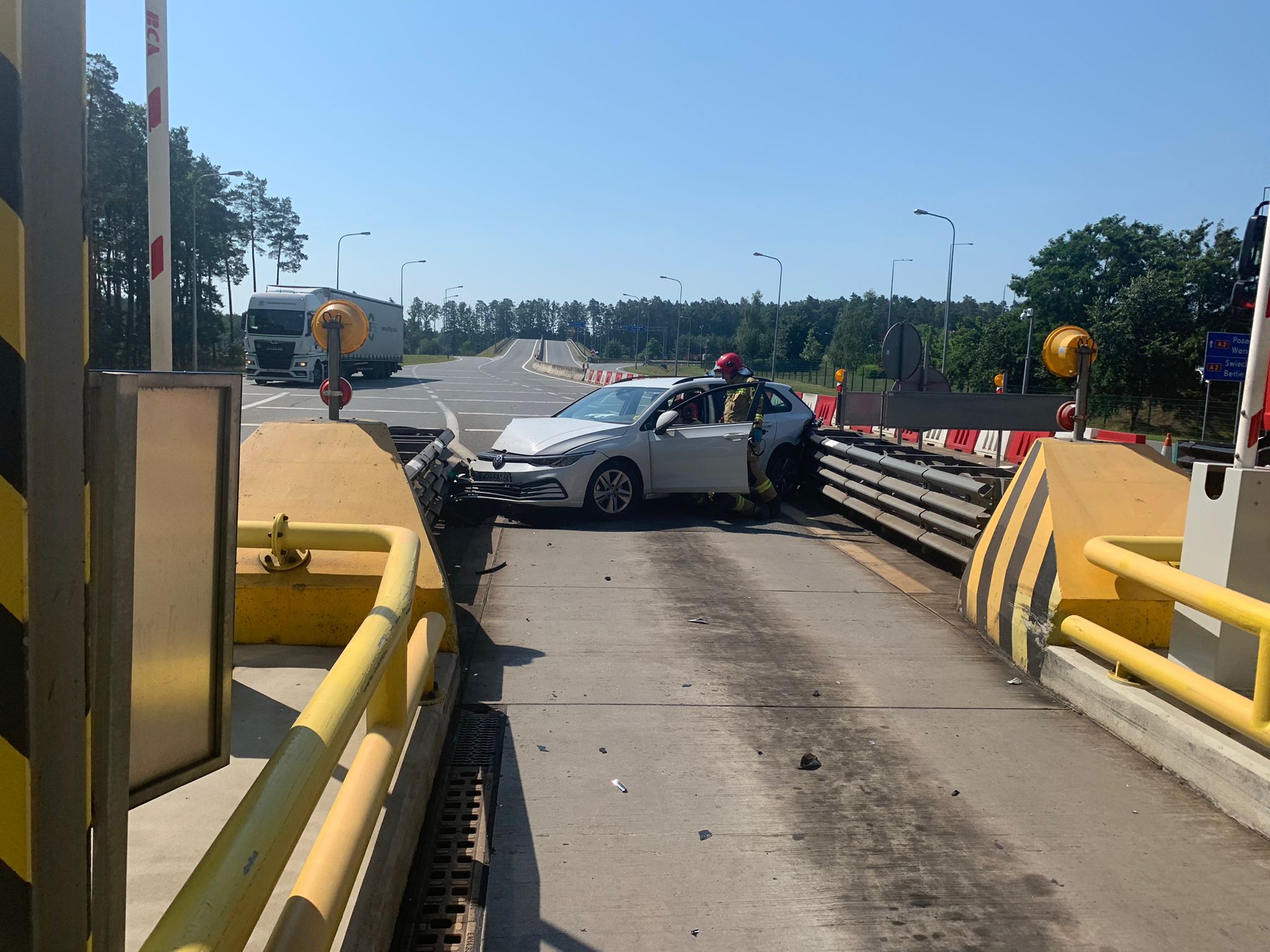 W dniu 27.06.2022 roku o godz. 10:05 do Stanowiska Kierowania Komendanta Powiatowego PSP w Nowym Tomyślu wpłynęło zgłoszenie o wypadku samochodu osobowego, który uderzył w barierki przed punktem opłat A2 w miejscowości Bolewice. Dyżurny SKKP do działań zadysponował dwa zastępy ratownictwa technicznego i samochód rozpoznawczo – ratowniczy z Jednostki Ratowniczo Gaśniczej w Nowym Tomyślu oraz zastęp Ochotniczej Straży Pożarnej z Bolewic. Po przybyciu zastępów straży pożarnej na miejsce zdarzenia zastano samochód osobowy po zderzeniu z barierami energochłonnymi przed punktem opłat autostrady A2. Kobieta kierująca pojazdem opuściła pojazd przed przybyciem Jednostek Straży Pożarnych. Działania strażaków polegały na zabezpieczeniu miejsca zdarzenia, odłączeniu akumulatora w pojeździe oraz udzieleniu kwalifikowanej pierwszej pomocy osobie poszkodowanej.