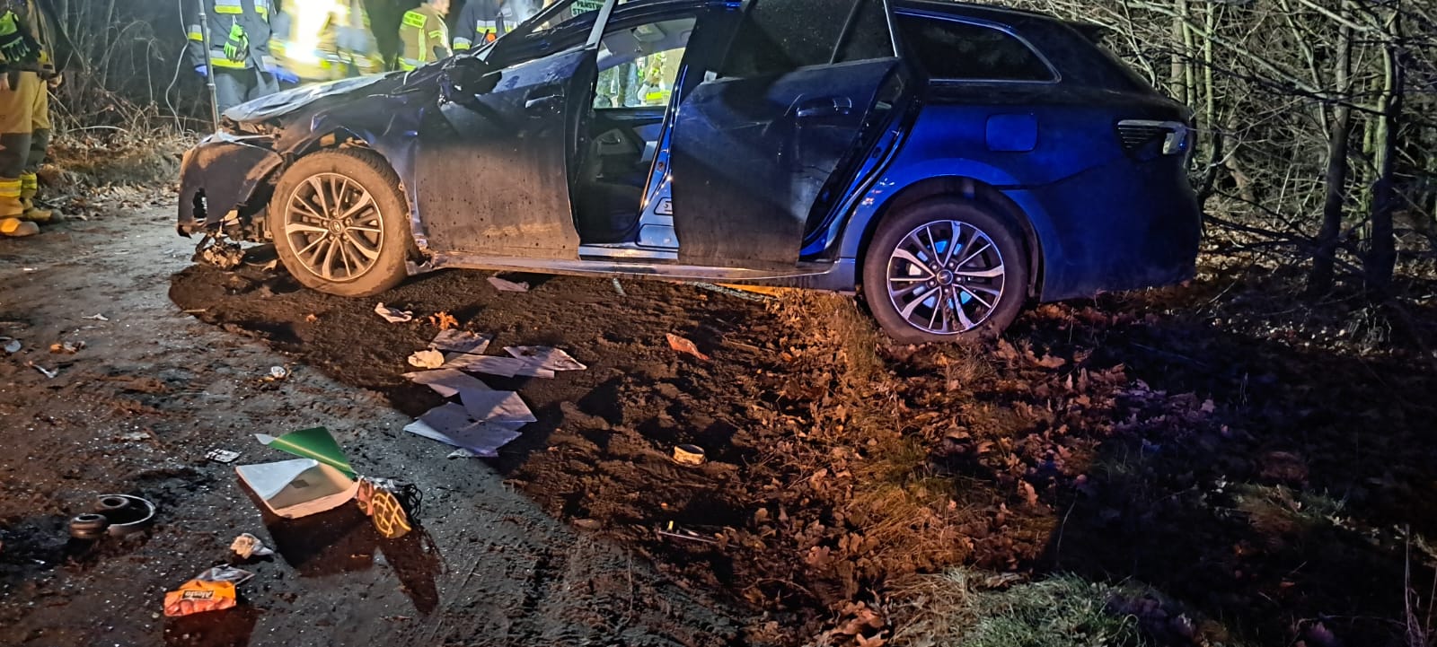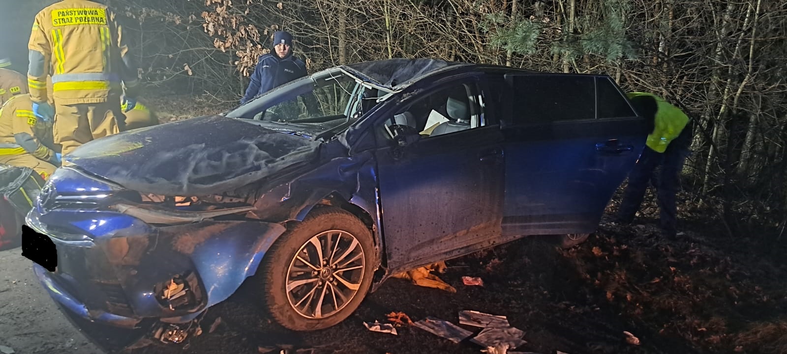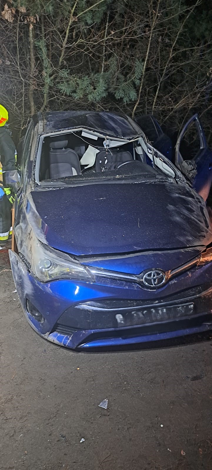 Po przybyciu zastępów straży pożarnej na miejsce zdarzenia zastano samochód osobowy stojący w poprzek gruntowej drogi. Tylna oś pojazdu znajdowała się na skarpie drogowej. Osoba poszkodowana znajdowała się częściowo pod pojazdem, ale nie była uwięziona.