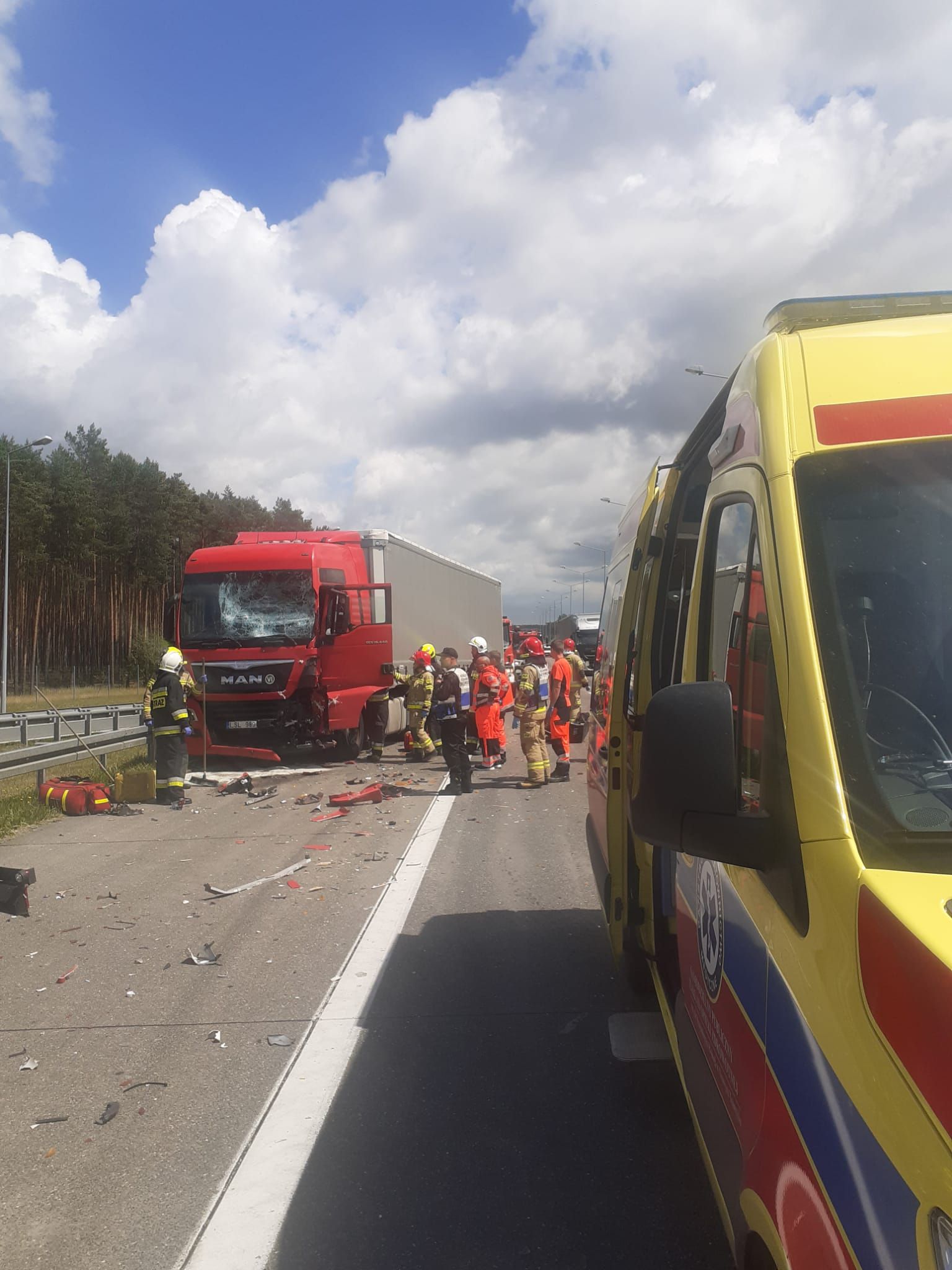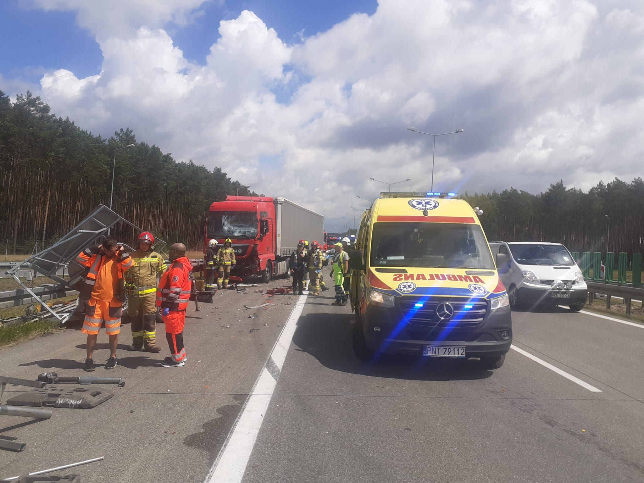W dniu 21.06.2022 roku o godz. 12:37 do Stanowiska Kierowania Komendanta Powiatowego PSP w Nowym Tomyślu wpłynęło zgłoszenie o wypadku na 108 km autostrady A2 w kierunku Świecka, gdzie TIR uderzył w przyczepę firmy prowadzącej prace na autostradzie. Dyżurny SKKP do działań zadysponował dwa zastępy ratownictwa technicznego i samochód rozpoznawczo – ratowniczy z Jednostki Ratowniczo Gaśniczej w Nowym Tomyślu oraz dwa zastępy Ochotniczej Straży Pożarnej z Bolewic i Kuślina. Po przybyciu pierwszych zastępów straży na miejsce zdarzenia zastano samochód ciężarowy stojący częściowo na pasie awaryjnym oraz częściowo na prawym pasie jezdni, który uderzył w samochód dostawczy z przyczepką firmy wykonującej prace na autostradzie. Samochód ciężarowy przewoził materiały budowlane. W wyniku zdarzenia poszkodowane zostały 2 osoby - kierujące pojazdami. Osoby nie były uwięzione w pojazdach, a ruch odbywał się pasem lewym (szybkim). Na miejscu obecne służby autostradowe, które zabezpieczały teren. Działania strażaków polegały na zabezpieczeniu miejsca zdarzenia, udzieleniu kwalifikowanej pierwszej pomocy poszkodowanym (opatrzenie rany głowy, wsparcie psychiczne), neutralizacji płynów eksploatacyjnych oraz rozłączeniu akumulatorów w pojazdach. Przybyły na miejsce lekarz zespołu Ratownictwa Medycznego po przebadaniu osób poszkodowanych podjął decyzję o pozostawieniu ich na miejscu zdarzenia. W wyniku zdarzenia przewożony materiał w naczepie tira nie uległ uszkodzeniu.