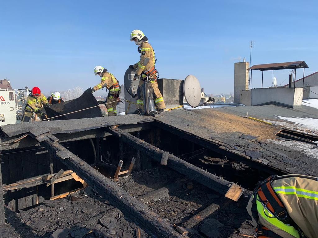 Dzień po pożarze strażacy udali się ponownie na miejsce celem zabezpieczenia spalonej oraz rozebranej konstrukcji dachu. Na te potrzeby z Powiatowego Centrum Zarządzania Kryzysowego pozyskano plandeki.