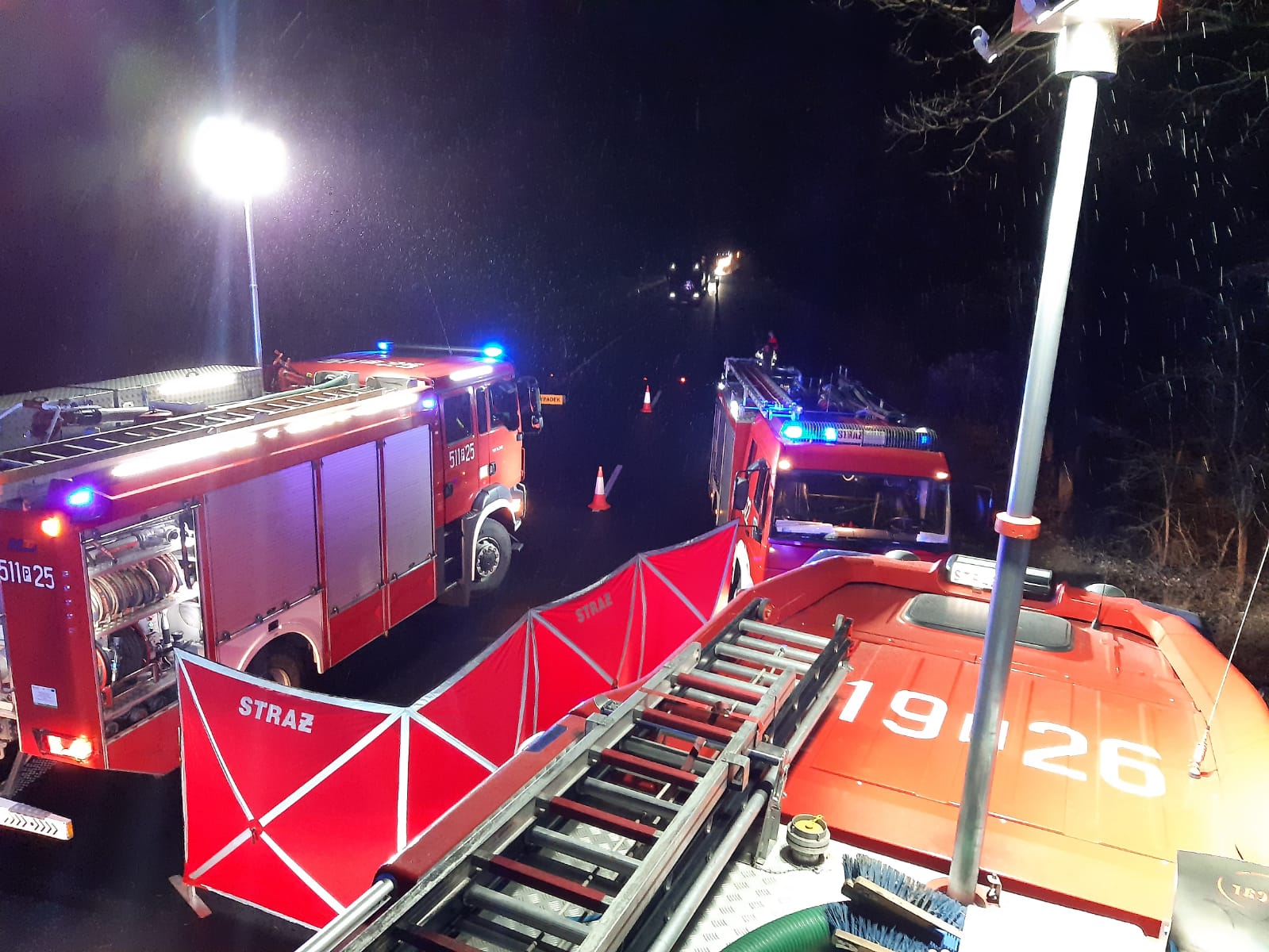Działania straży pożarnej polegały na zabezpieczeniu miejsca zdarzenia, oświetleniu terenu akcji, zamknięciu ruchu w obu kierunkach na DK92, wydobyciu uwięzionego mężczyzny przy pomocy narzędzi hydraulicznych, ewakuacji poszkodowanego na desce z pojazdu. Poszkodowanemu ustabilizowano odcinek szyjny kręgosłupa, udrożniono drogi oddechowe przy pomocy żelowej maski krtaniowej i rozpoczęto resuscytację krążeniowo oddechową (w tym tlenoterapia czynna 100% tlenu) oraz podłączono defibrylator, który po kilkukrotnych analizach nie zalecał wstrząsu. Przybyły na miejsce Zespół Ratownictwa Medycznego wraz ze strażakami kontynuował resuscytację, dzięki czemu wróciły parametry życiowe mężczyzny. Poszkodowany został przetransportowany do karetki pogotowia, tam ponownie zatrzymały się jego funkcje życiowe, w związku z czym ponownie rozpoczęto RKO. Niestety pomimo wszelkich starań o godzinie 19:00 lekarz stwierdził zgon mężczyzny. Po zakończonych czynnościach dochodzeniowych Policji wprowadzono ruch wahadłowy, wycięto uszkodzone drzewo i zabezpieczono miejsce działań autopomocy drogowej.