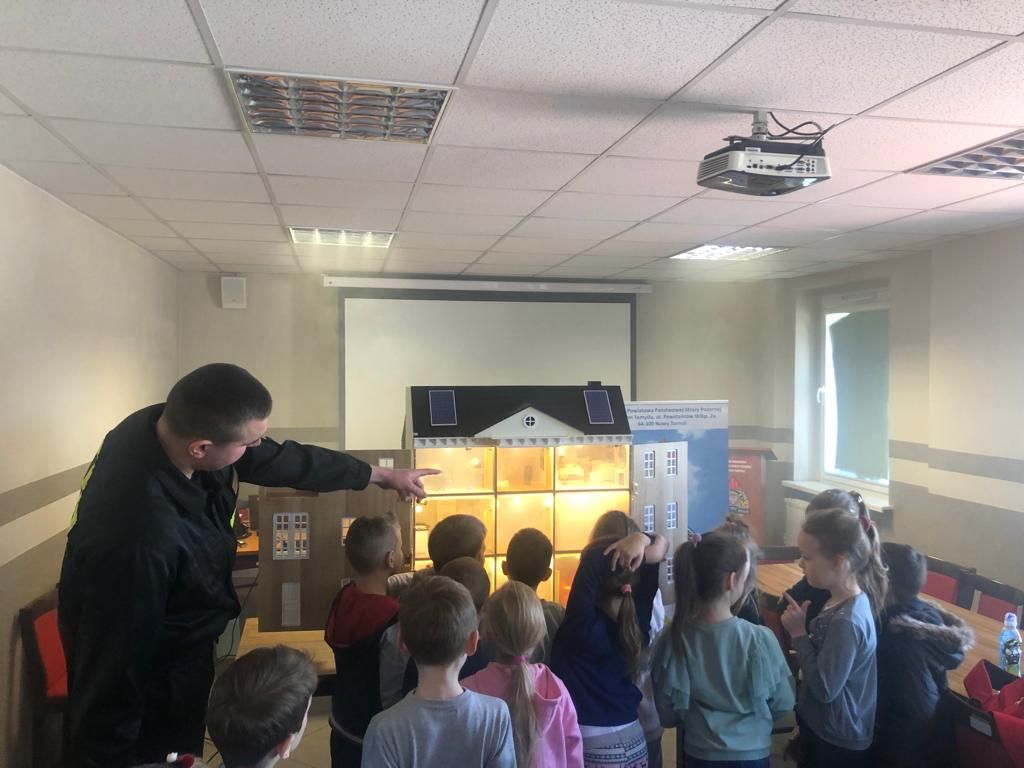 W rolę narratora i instruktora wcielił się st. sekc. Michał Kurcewicz, który jako strażak z Jednostki Ratowniczo – Gaśniczej w realny sposób przekazał możliwości wystąpienia zagrożeń w zaciszu domowym. Całość prezentacji wywołała zachwyt na twarzach dzieci, jak również Pań opiekujących się grupą.