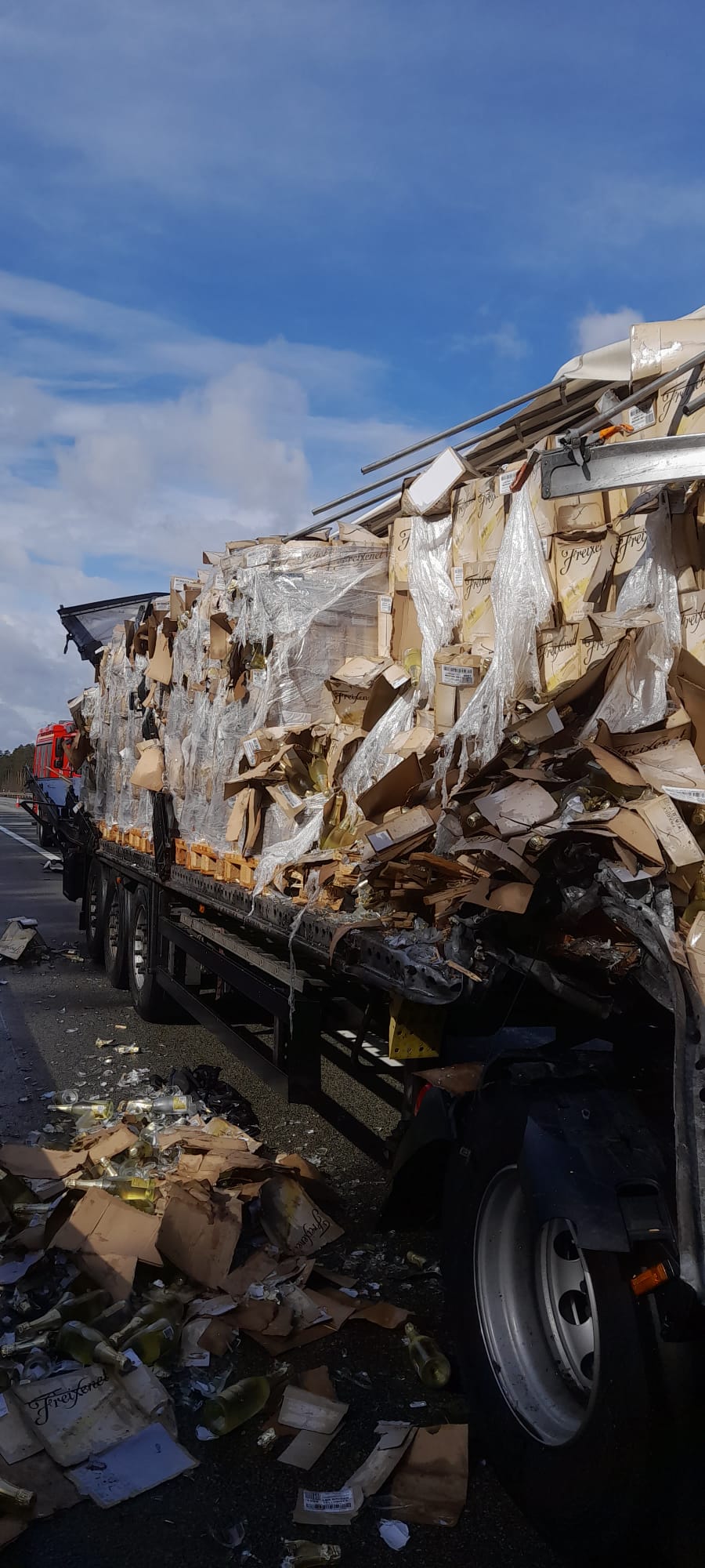 Po przybyciu zastępów Straży Pożarnej na miejsce zdarzenia zastano samochód ciężarowy z naczepą stojący na pasie awaryjnym. Dwieście metrów dalej na prawym pasie i pasie awaryjnym znajdował się samochód ciężarowy z naczepą. Na odcinku między pojazdami (prawy pas i pas awaryjny) znajdowały się pozostałości po kolizji oraz rozsypane butelki i kartony przewożonego szampana. Nieprzejezdny odcinek drogi zabezpieczony przez służby autostradowe będące na miejscu zdarzenia. Ruch odbywał się lewym pasem autostrady. Dwoje kierowców opuściło pojazdy przed przybyciem Straży Pożarnej.