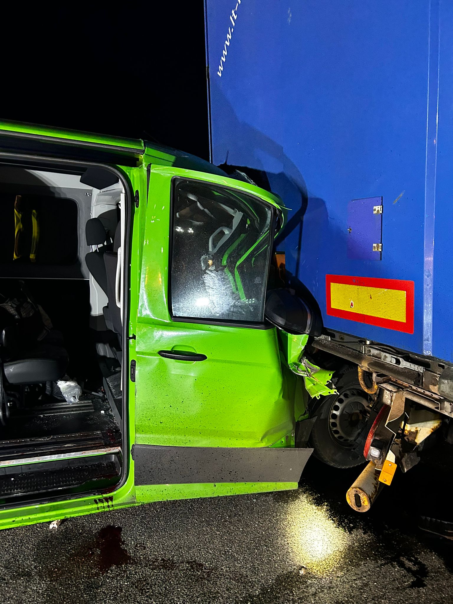 Po przybyciu jednostek ochrony przeciwpożarowej na miejsce zdarzenia zastano samochód osobowy (bus osobowy) wbity w naczepę samochodu ciężarowego. Busem podróżowały 4 osoby (1 mężczyzna i 3 kobiety). Wszyscy uczestnicy zdarzenia byli przytomni, lecz kierowca busa został uwięziony w karoserii uszkodzonego pojazdu. Samochodem ciężarowym przewożącym rury stalowe podróżował tylko kierowca, który nie wymagał pomocy medycznej.