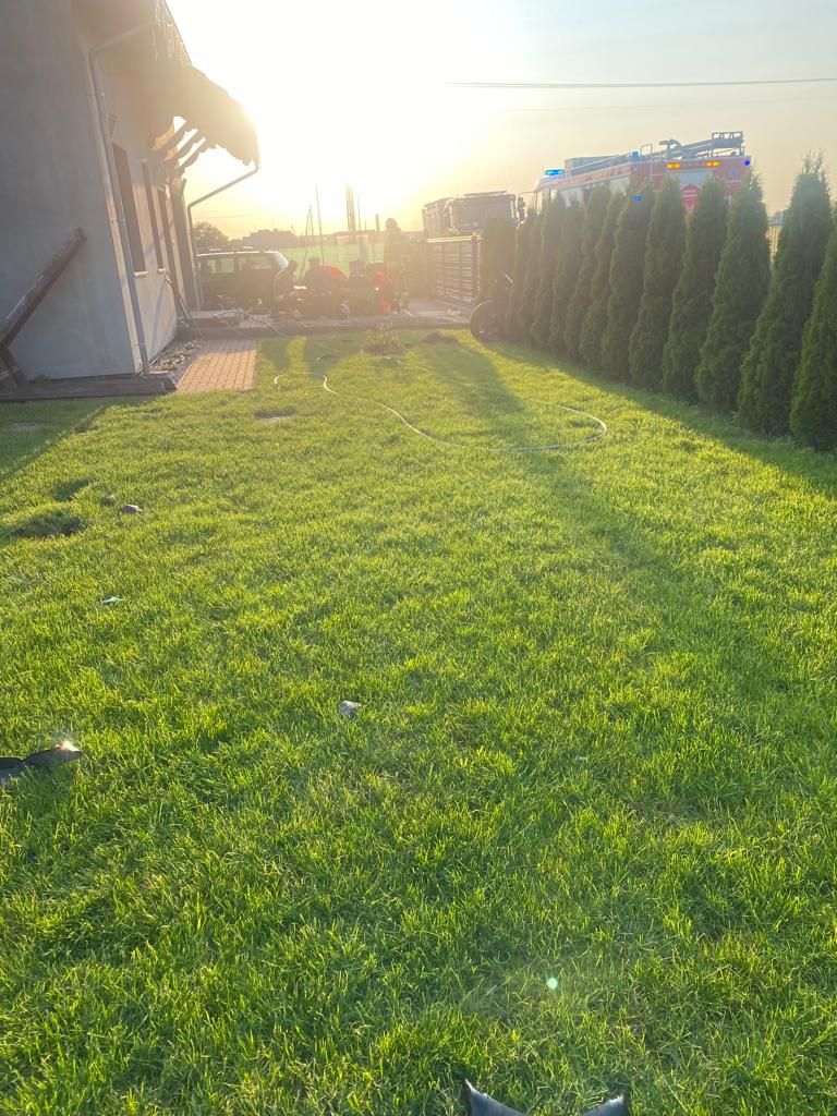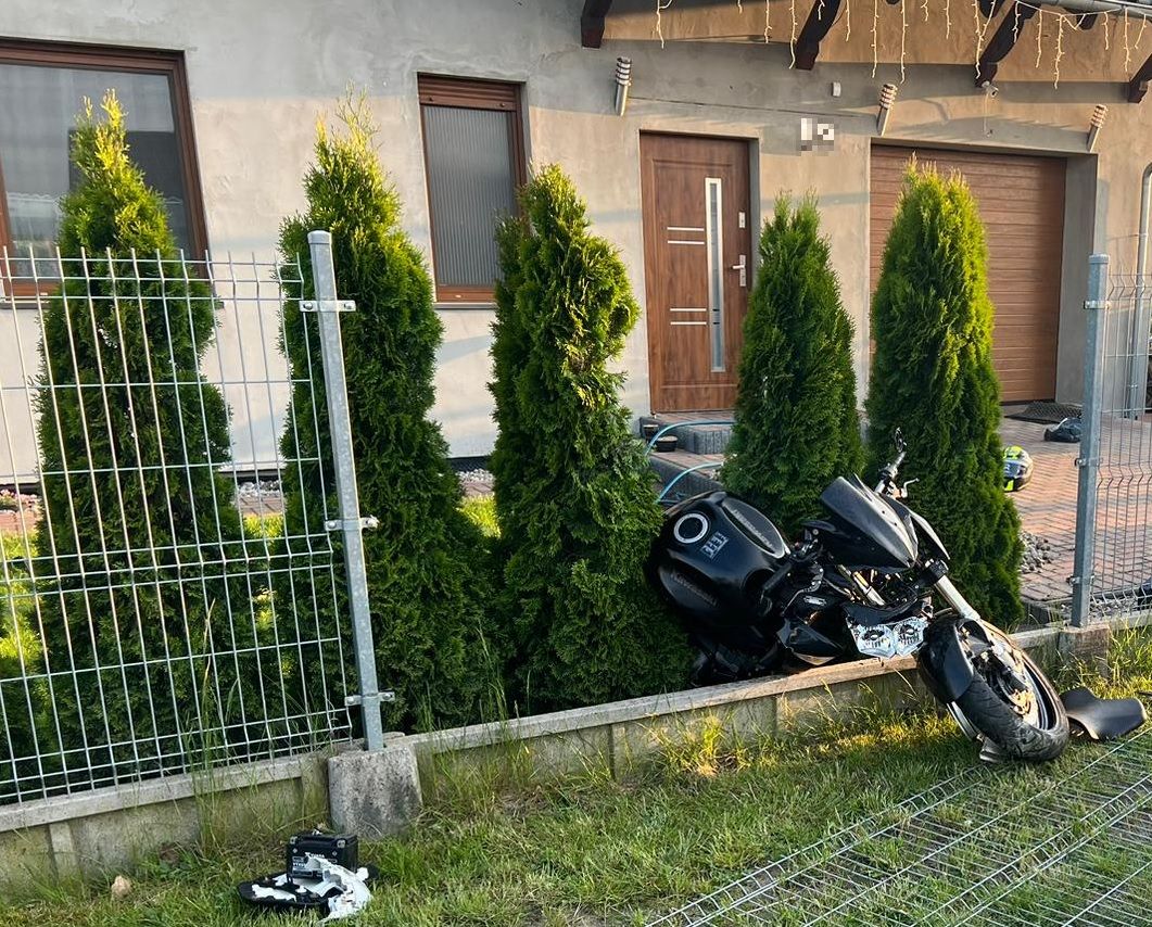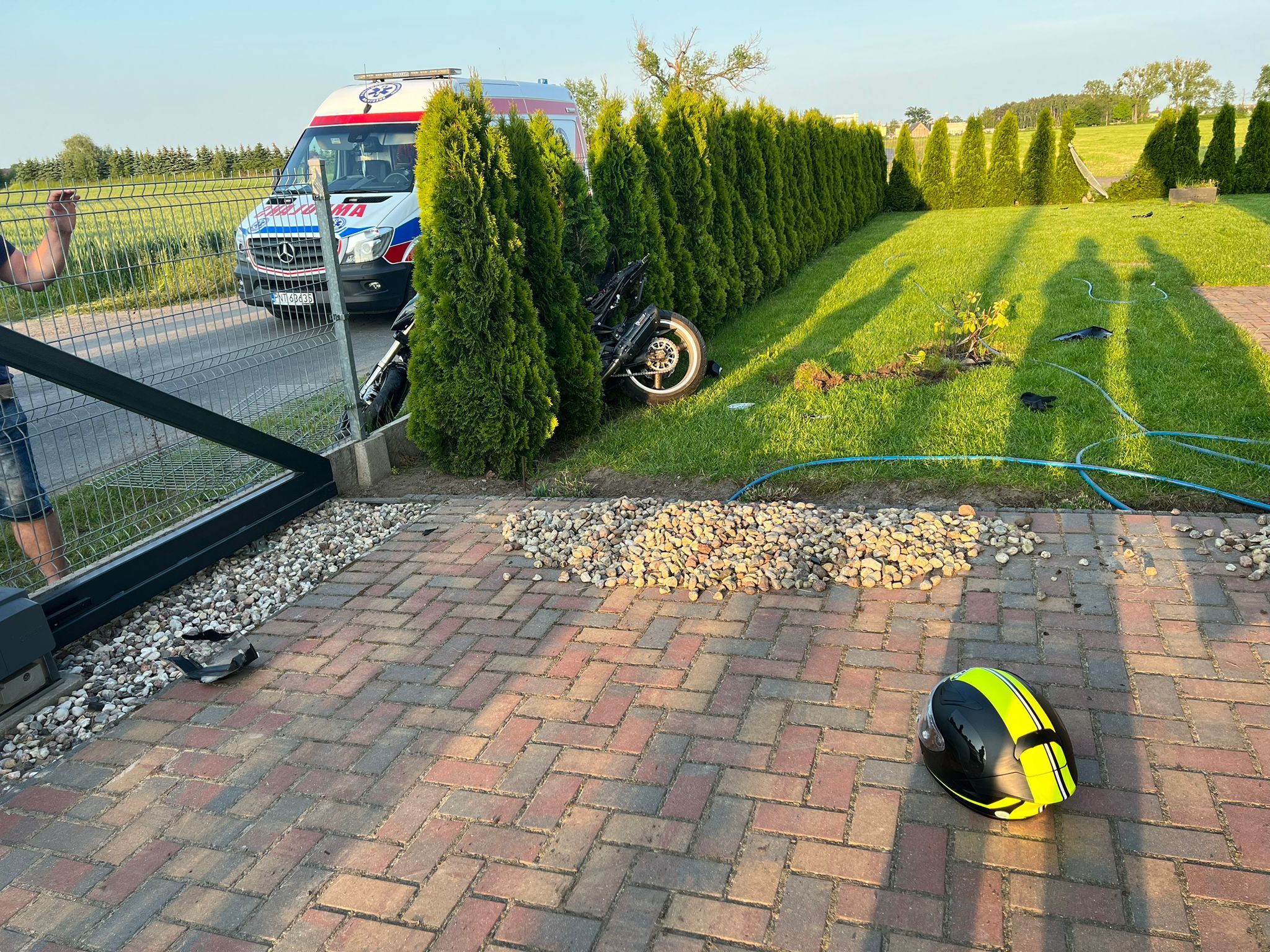 Po przyjeździe pierwszego zastępu na miejsce zdarzenia zastano rozbity motocykl oraz poszkodowanego mężczyznę leżącego na terenie posesji. Poszkodowany przytomny, pod wpływem zdarzenia, uskarżający się na ból prawej nogi.
