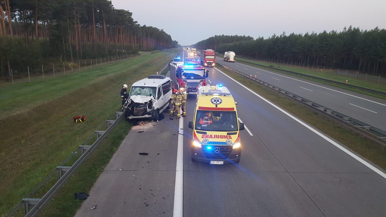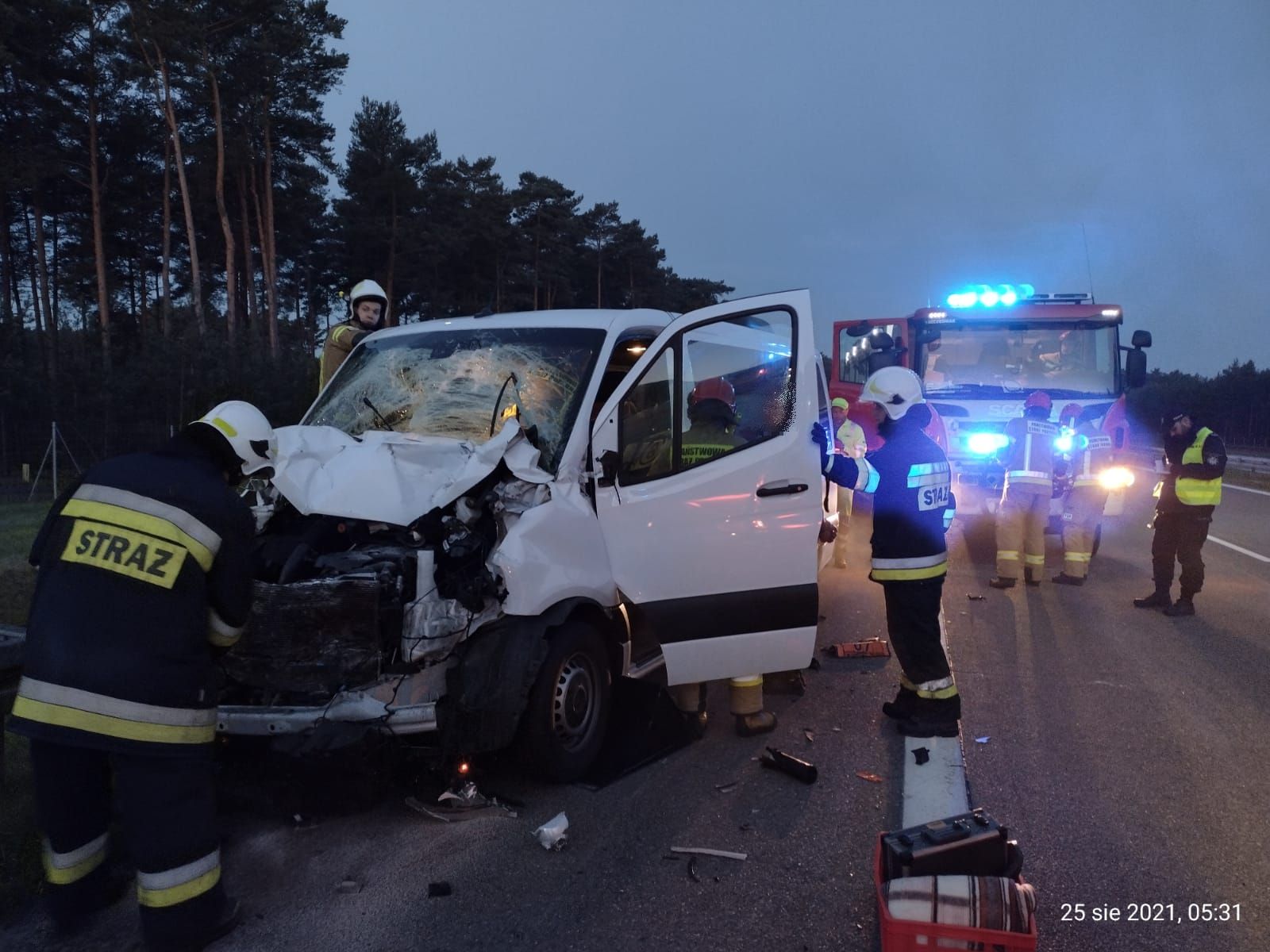 W dniu 25 sierpnia 2021 roku o godz. 4:56 do Stanowiska Kierowania Komendanta Powiatowego PSP w Nowym Tomyślu wpłynęło zgłoszenie o wypadku samochodu osobowego typu bus, który uderzył w tył naczepy samochodu ciężarowego na 104km autostrady A2 w kierunku na Warszawę. Dyżurny SKKP do działań zadysponował dwa zastępy ratownictwa technicznego z JRG Nowy Tomyśl oraz jednostkę OSP Miedzichowo. Po przyjeździe na miejsca zdarzenia zastano samochód Mercedes Sprinter z rozbitym przodem stojący na pasie awaryjnym autostrady A2. Pojazdem podróżowały łącznie 4 osoby w tym dziecko. Trzy osoby znajdowały się wewnątrz pojazdu, ale nie były uwięzione, natomiast kierowca znajdował się poza pojazdem. W odległości ok. 300 metrów dalej na tej samej nitce autostrady na pasie awaryjnym znajdował się samochód ciężarowy z naczepą/silosem przewożący ładunek ADR – 24,6 t pyłu węglowego. Kierowca samochodu ciężarowego nie odniósł obrażeń i nie wymagał udzielenia pomocy medycznej. Silos do przewozu pyłu węglowego nie był uszkodzony, a przewożona substancja nie wydostała się na zewnątrz. Działania strażaków polegały na zabezpieczeniu miejsca zdarzenia, odłączeniu akumulatora w busie, przeprowadzono badanie urazowe poszkodowanych (brak widocznych obrażeń) - wsparcie psychiczne do czasu przybycia na miejsce Zespołu Ratownictwa Medycznego. Przybyły na miejsce lekarz podjął decyzję o przetransportowaniu 3 osób na badania do szpitala w Nowym Tomyślu, w związku z powyższym na miejsce przybyły kolejne dwa Zespoły Ratownictwa Medycznego.