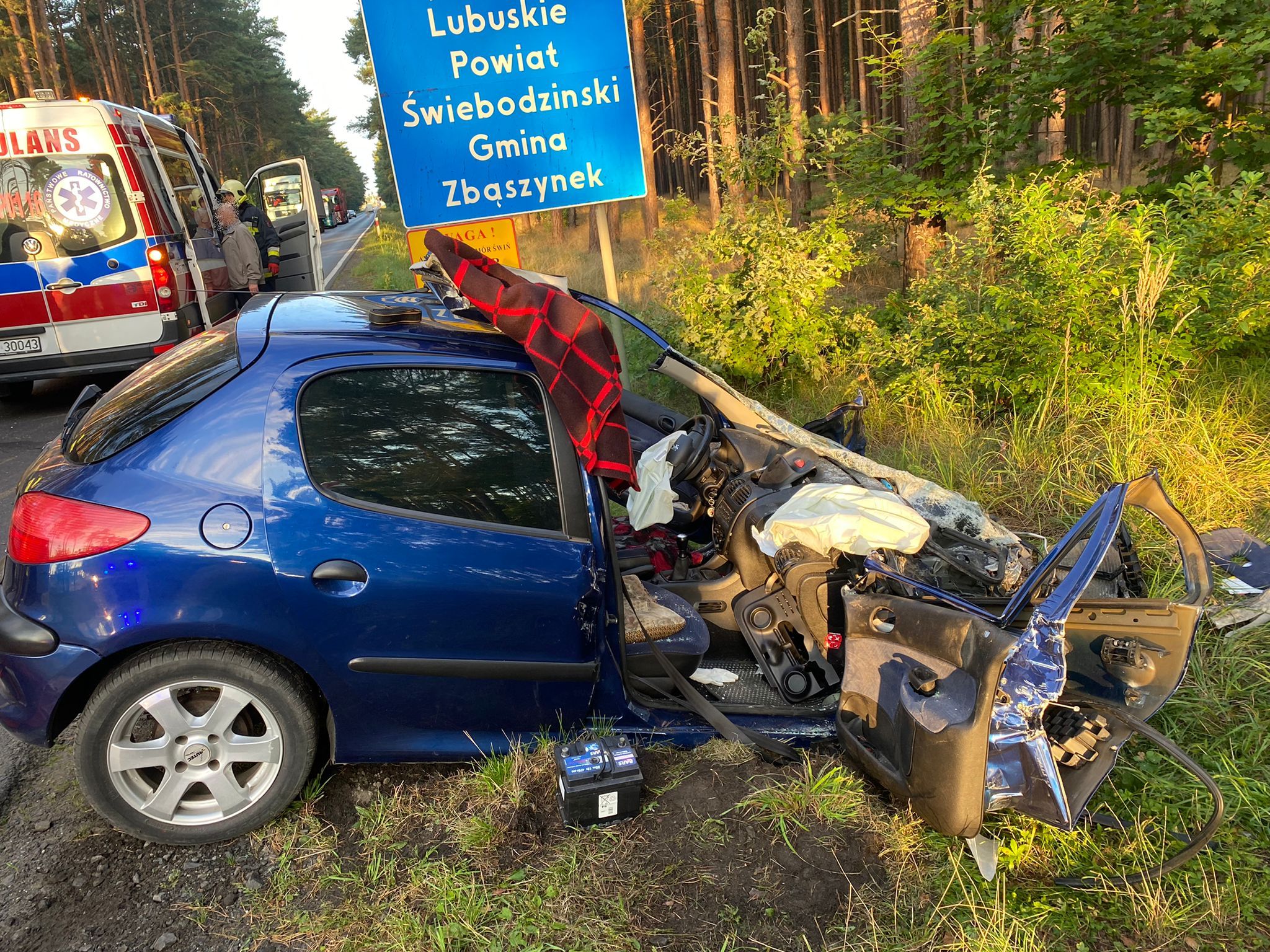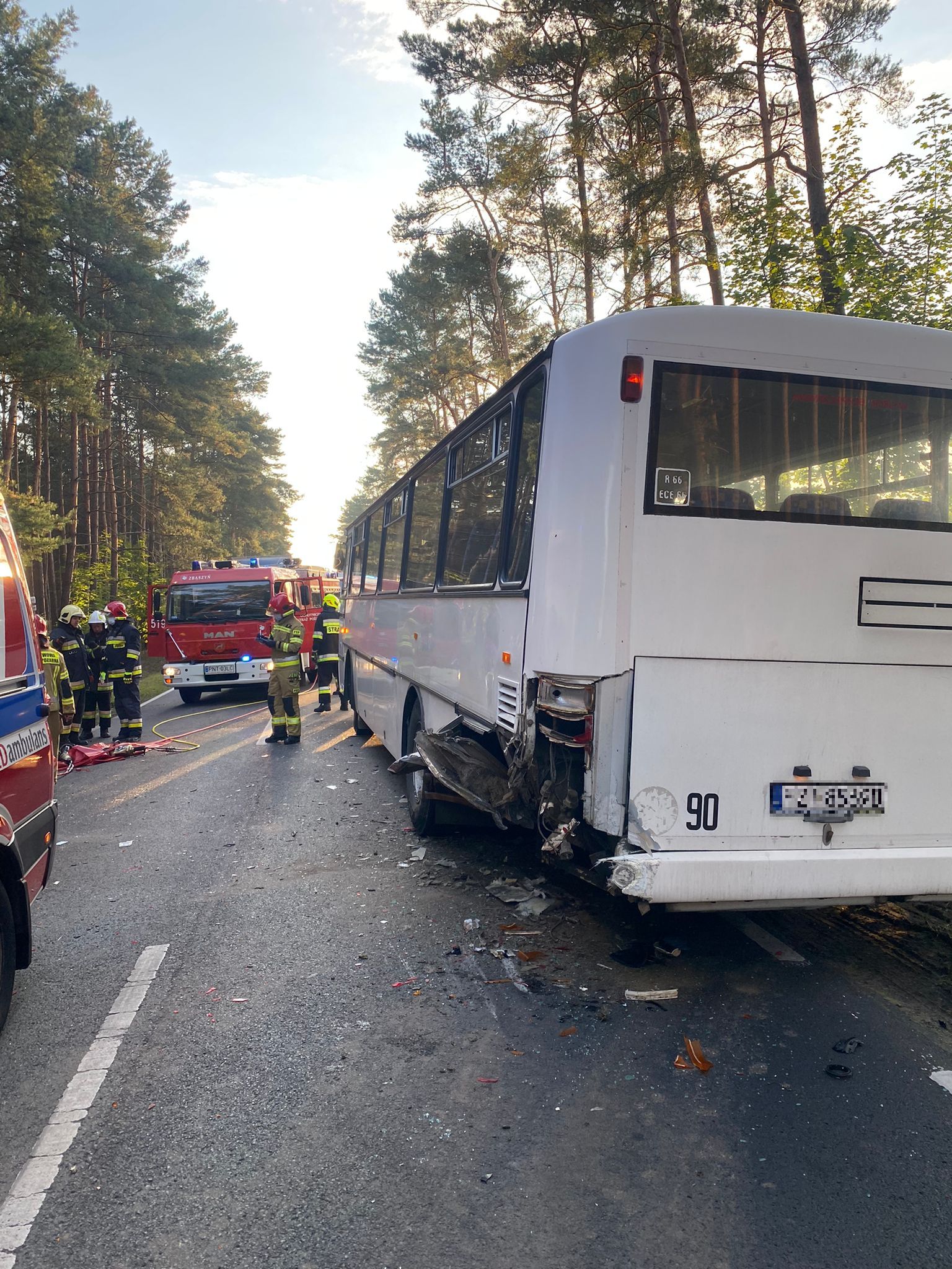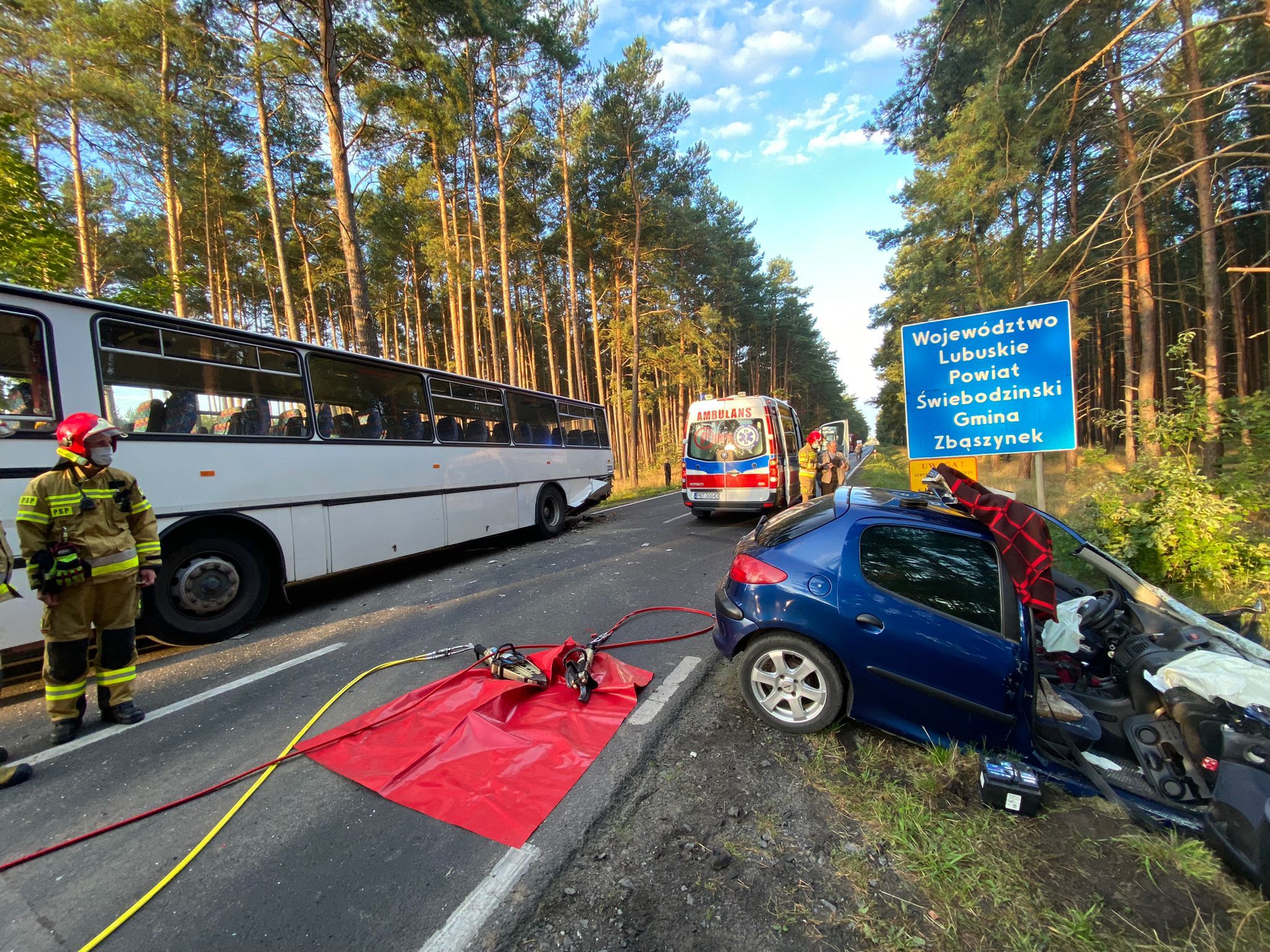 W dniu 2 września 2021 roku o godz. 6:31 do Stanowiska Kierowania Komendanta Powiatowego PSP w Nowym Tomyślu wpłynęło zgłoszenie o wypadku samochodu osobowego i autobusu pomiędzy Nądnią i Chlastawą. Dyżurny SKKP do działań zadysponował dwa zastępy ratownictwa technicznego z JRG Nowy Tomyśl oraz jednostkę OSP Zbąszyń i Nądnie. Po dojeździe pierwszych zastępów straży na miejsce zdarzenia droga była całkowicie zablokowana, a Zespół Ratownictwa Medycznego prowadził już swoje działania. Samochód osobowy Peugeot z uszkodzonym przodem znajdował się poza jezdnią w rowie. Osobówką podróżowały łącznie trzy osoby: dwie osoby przytomne i chodzące znajdowały się poza pojazdem natomiast pasażerka podróżująca z przodu (również przytomna) była uwięziona wewnątrz pojazdu. Na jezdni stał autobus z uszkodzonym tyłem - pojazdem tym podróżował tylko kierowca, który nie odniósł obrażeń i nie wymagał udzielenia pomocy medycznej. Działania strażaków polegały na zabezpieczeniu miejsca zdarzenia, odłączeniu akumulatora, wykonaniu dostępu do osoby poszkodowanej przy pomocy narzędzi hydraulicznych oraz pomocy w transporcie osoby poszkodowanej do karetki. Ratownicy Zespołu Ratownictwa Medycznego po przebadaniu uczestników zdarzenia drogowego podjęli decyzję o przewiezieniu 2 osób podróżujących Peugeotem do szpitala w Nowym Tomyślu.