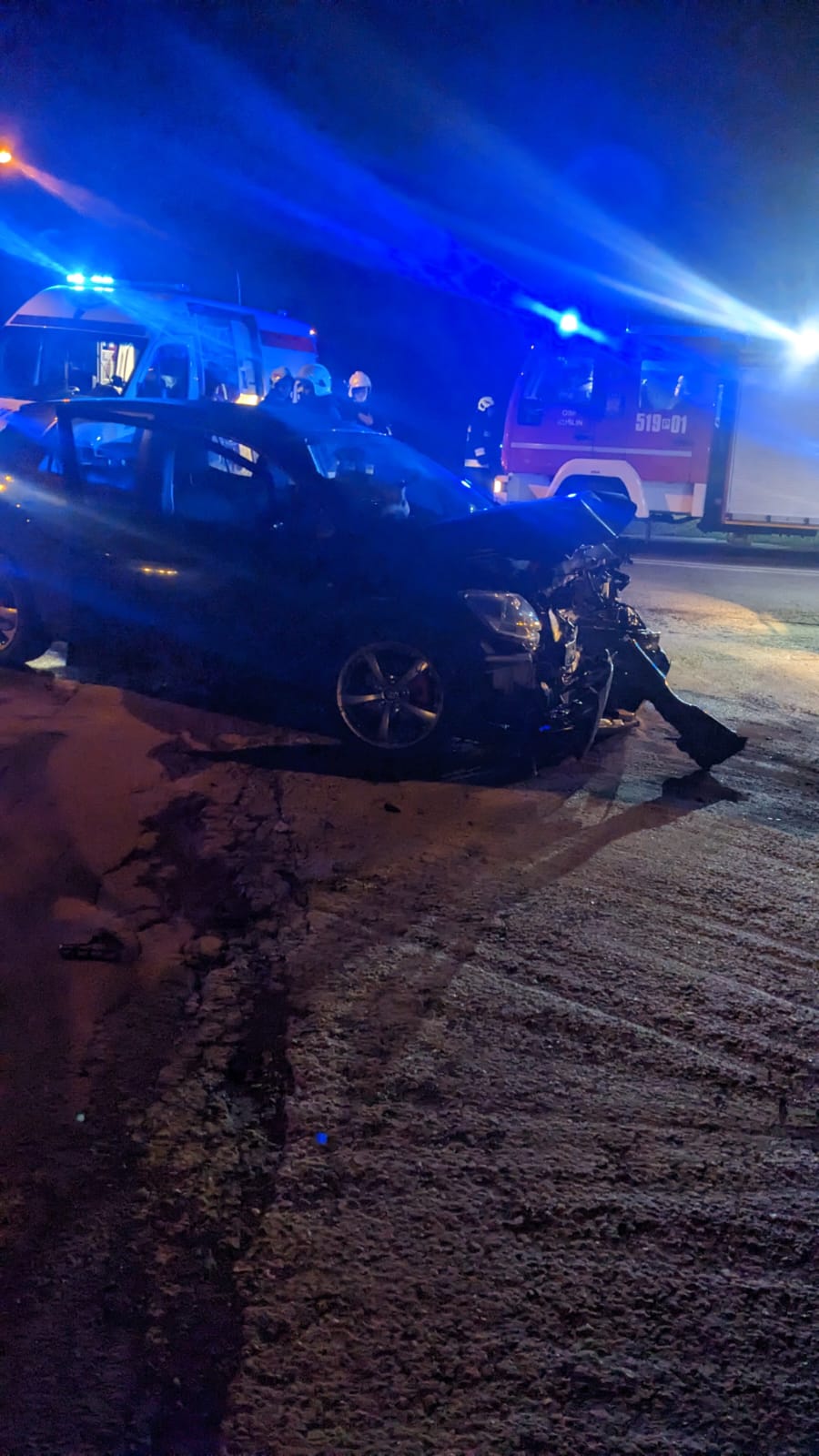 Po przybyciu pierwszych zastępów na miejsce zdarzenia zastano dwa samochody osobowe po zderzeniu, jeden znajdował się na środku skrzyżowania, natomiast drugi na poboczu drogi. Pojazdami podróżowało łącznie 8 osób które znajdowały się poza pojazdami, 3 osoby wymagały pomocy medycznej (jedna osoba nieprzytomna z zachowanymi funkcjami życiowymi, wyciągnięta z pojazdu przed przybyciem Straży Pożarnej przez świadków zdarzenia).