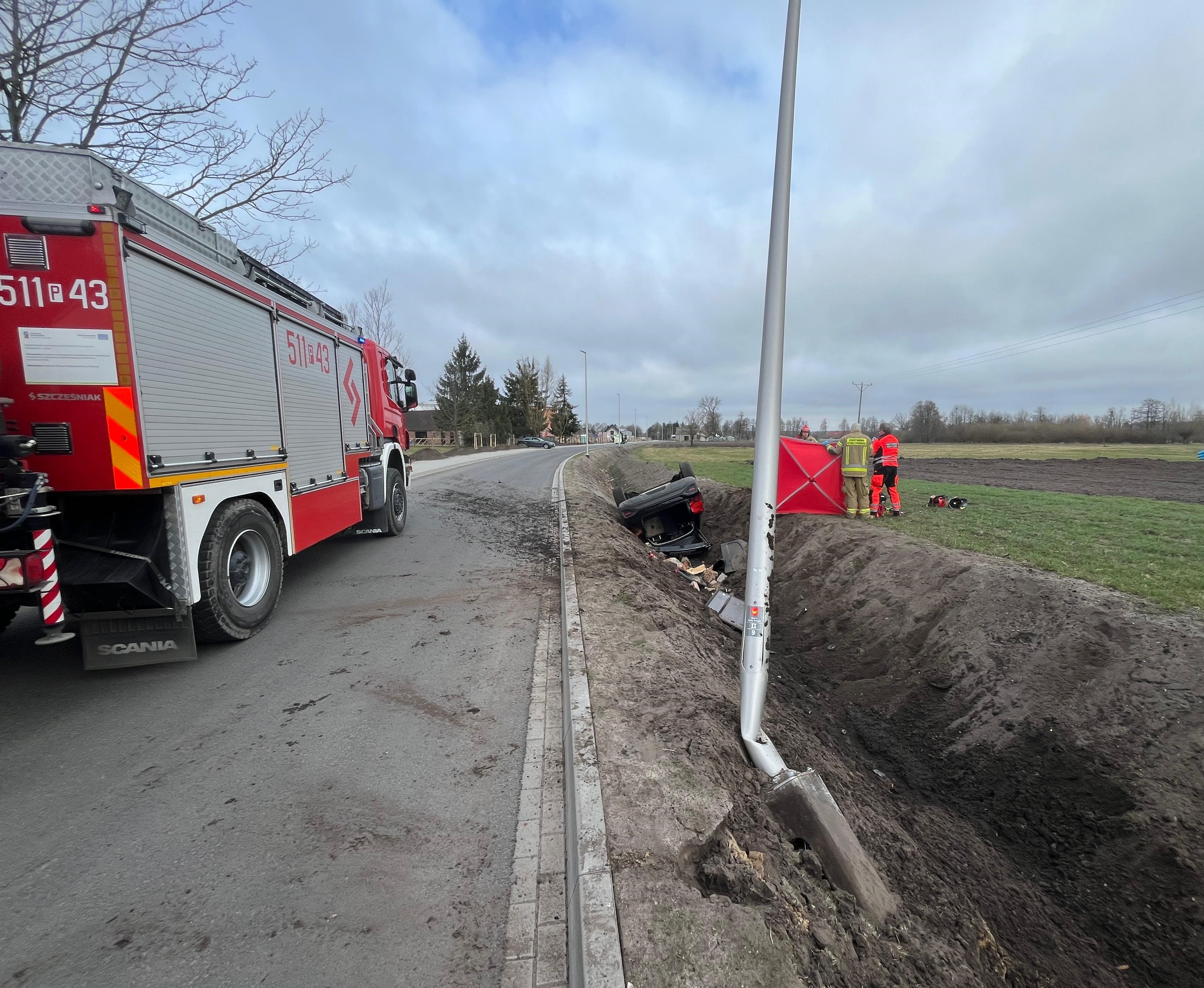 Po przybyciu zastępów straży pożarnej na miejsce zdarzenia zastano samochód osobowy znajdujący się na dachu w rowie. Wewnątrz pojazdu znajdował się nieprzytomny mężczyzna.