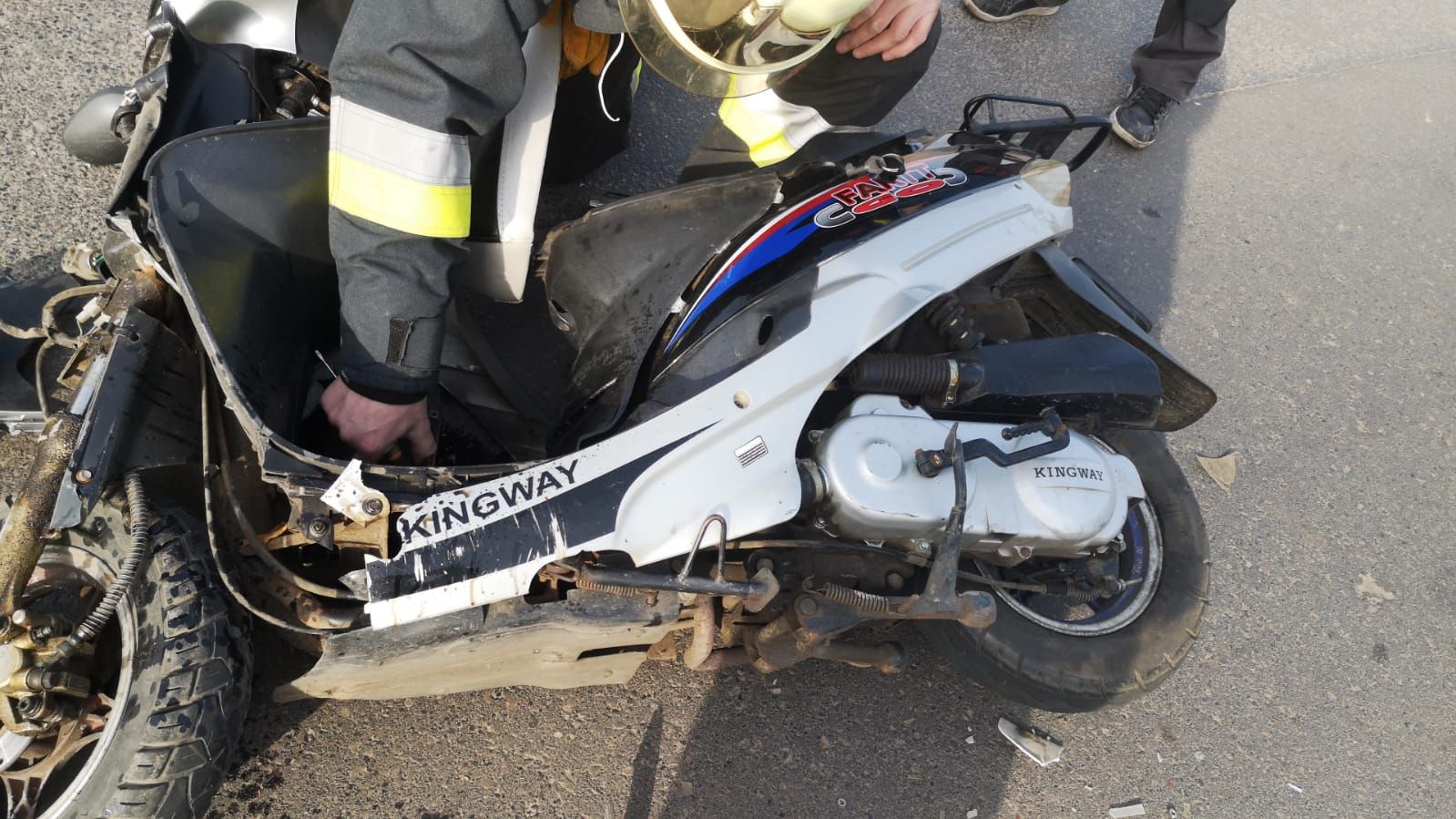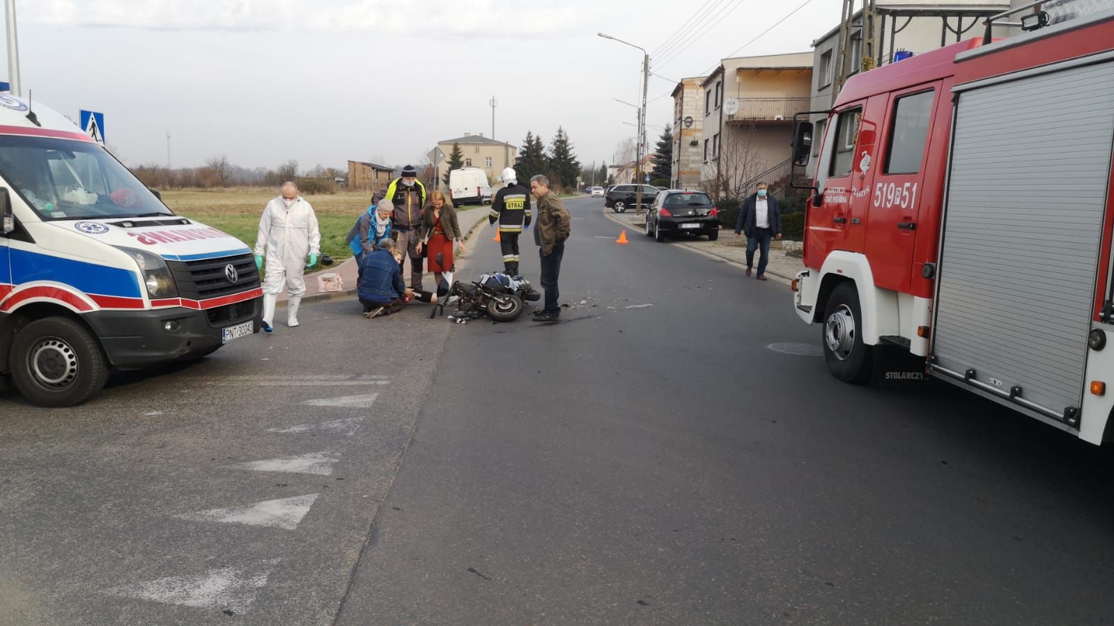 W dniu 1 kwietnia 2021 roku o godz. 8:52 do Stanowiska Kierowania Komendanta Powiatowego PSP w Nowym Tomyślu wpłynęło zgłoszenie o zdarzeniu, w którym uczestniczył motorower i samochód osobowy oraz przekazano informację, że w wyniku zdarzenia jest jedna osoba poszkodowana. Na miejsce zdarzenia zadysponowano dwa zastępy z Jednostki Ratowniczo – Gaśniczej z Nowego Tomyśla oraz dwa zastępy OSP Zbąszyń. Po przybyciu na miejsce zdarzenia pierwszych zastępów z jednostki OSP Zbąszyń działania prowadził już Zespół Ratownictwa Medycznego, który jadąc do innego zgłoszenia najechał na wypadek. Zastano również samochód osobowy oraz motorower leżący na jezdni. Osoba poszkodowana, która podróżowała jednośladem, siedziała na jezdni i uskarżała się na ból kończyn dolnych. Kierowca samochodu osobowego opuścił pojazd przed przybyciem straży pożarnej. Po otrzymaniu informacji od OSP Zbąszyń, że na miejscu działa już ZRM i sytuacja jest opanowana, dyżurny Stanowiska Kierowania w Nowym Tomyślu podjął decyzję o zawróceniu do bazy zastępów z JRG. Działania strażaków polegały na zabezpieczeniu miejsca zdarzenia, kierowaniu ruchem, udzieleniu Kwalifikowanej Pierwszej Pomocy osobie poszkodowanej (kontrola ABC, wsparcie psychiczne), odłączeniu akumulatora w motorowerze oraz sorpcji plamy oleju powstałej w wyniku zdarzenia. ZRM, który najechał na zdarzenie, przebadał poszkodowaną i po stwierdzeniu braku zagrożenia życia pozostawił kobietę pod opieką strażaków, a następnie udał się do realizacji swojego pierwotnego zgłoszenia. Przybyły na miejsce zdarzenia drugi ZRM ponownie przebadał kobietę i podjął decyzję o przetransportowaniu do szpitala w Nowym Tomyślu. Kobieta podróżująca samochodem osobowym nie wymagała udzielenia KPP. Dochodzenie w sprawie ustalenia przyczyn i okoliczności powstania zdarzenia prowadzi Komenda Powiatowa Policji w Nowym Tomyślu.