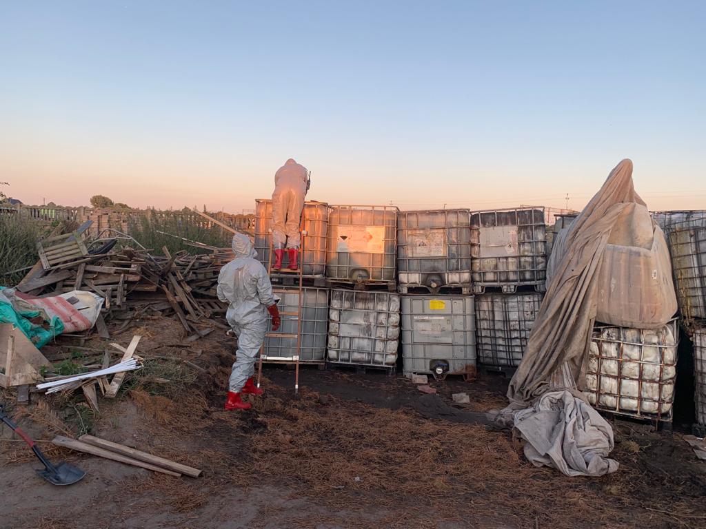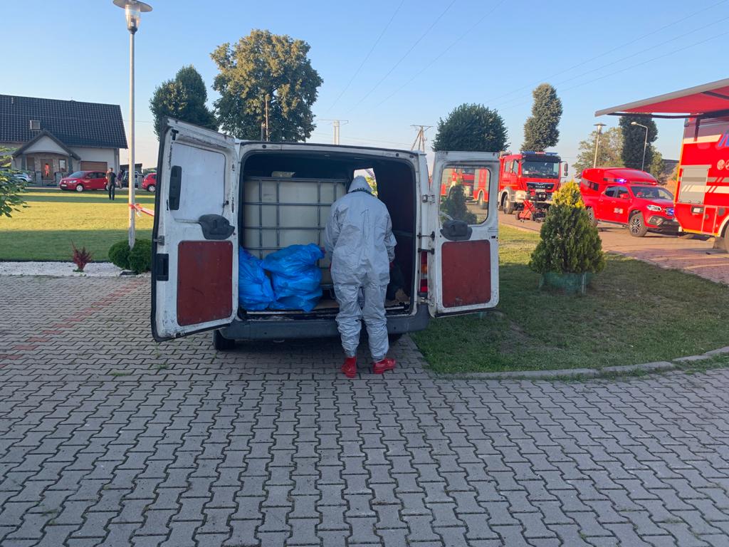 Po przybyciu zastępów na miejsce zdarzenia zastano dwie naczepy od tira, jedna pokryta plandeką zamknięta w której znajdowały się pojemniki z nieznana substancja, druga wywrotka otwarta zanieczyszczona substancją chemiczną. Na terenie działki znajdowały się również liczne ilości beczek 200 litrowych oraz pojemniki DPPL 1000 litrów wypełnione substancja, przykryte plandekami i siatką maskującą. Widoczne z nich wycieki oraz zanieczyszczenia. Po rozpoznaniu sytuacji na miejscu zdarzenia teren zabezpieczono oraz wyznaczono strefę niebezpieczną. Kierujący Działaniem Ratowniczym podjął decyzje o zadysponowaniu Specjalistycznej Grupy Ratownictwa Chemiczno – Ekologicznego JRG 6 Poznań – Krzesiny, która po przybyciu na miejsce zdarzenia i przeprowadzeniu szczegółowego rozpoznania zabezpieczyła teren akcji, pobrała próbki substancji i dokonała analizy pobranych próbek pod kątem ich właściwości. Na miejscu obecny był również przedstawiciel Wydziału Inspeckji Ochrony Środowiska z Poznania.