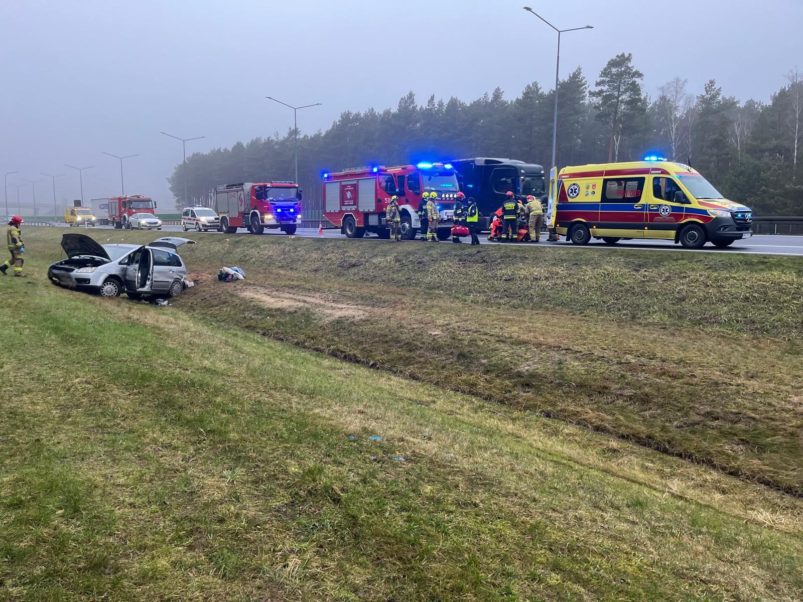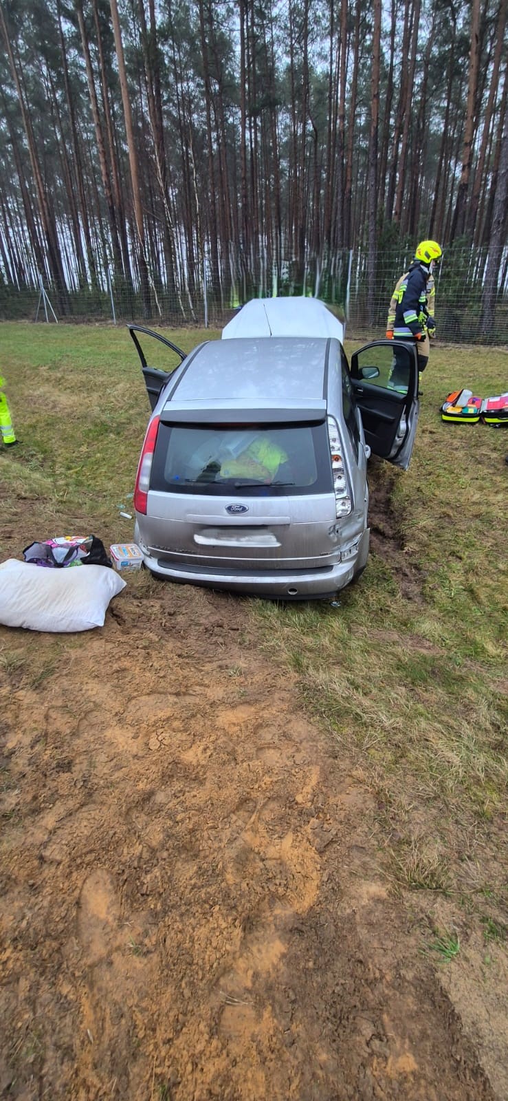 Po przybyciu zastępów straży pożarnej na miejsce zdarzenia zastano samochód osoby znajdujący się na pasie zieleni, kierowca przebywał w pojeździe.