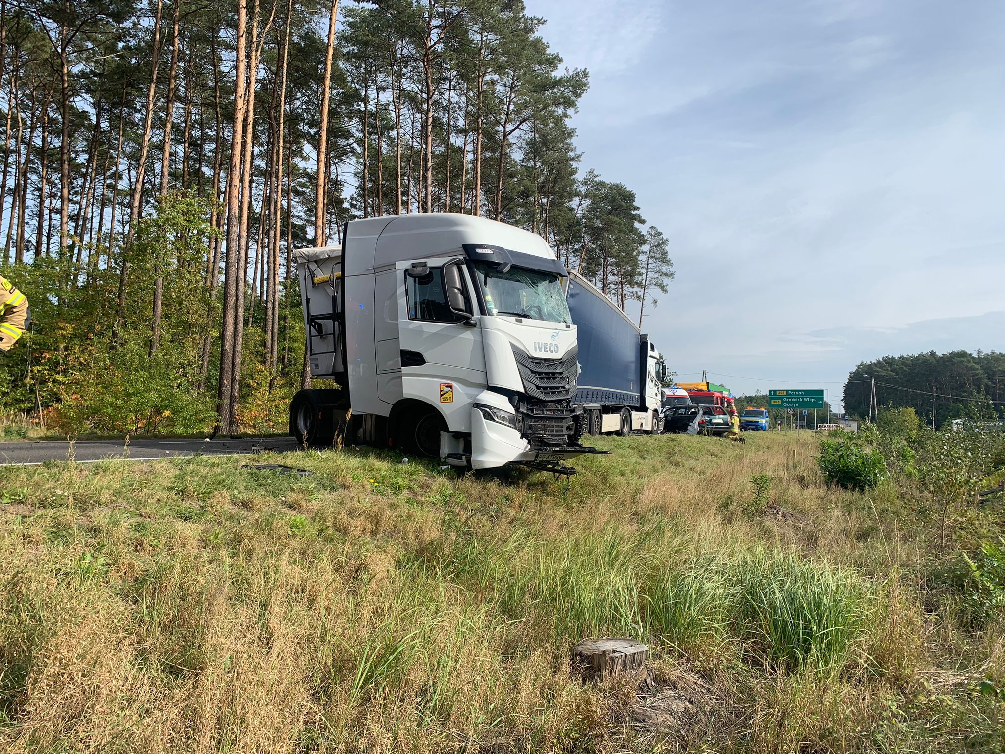 Po przybyciu pierwszych zastępów na miejsce zdarzenia zastano dwa ciągniki siodłowe z naczepami oraz samochód osobowy po zderzeniu.