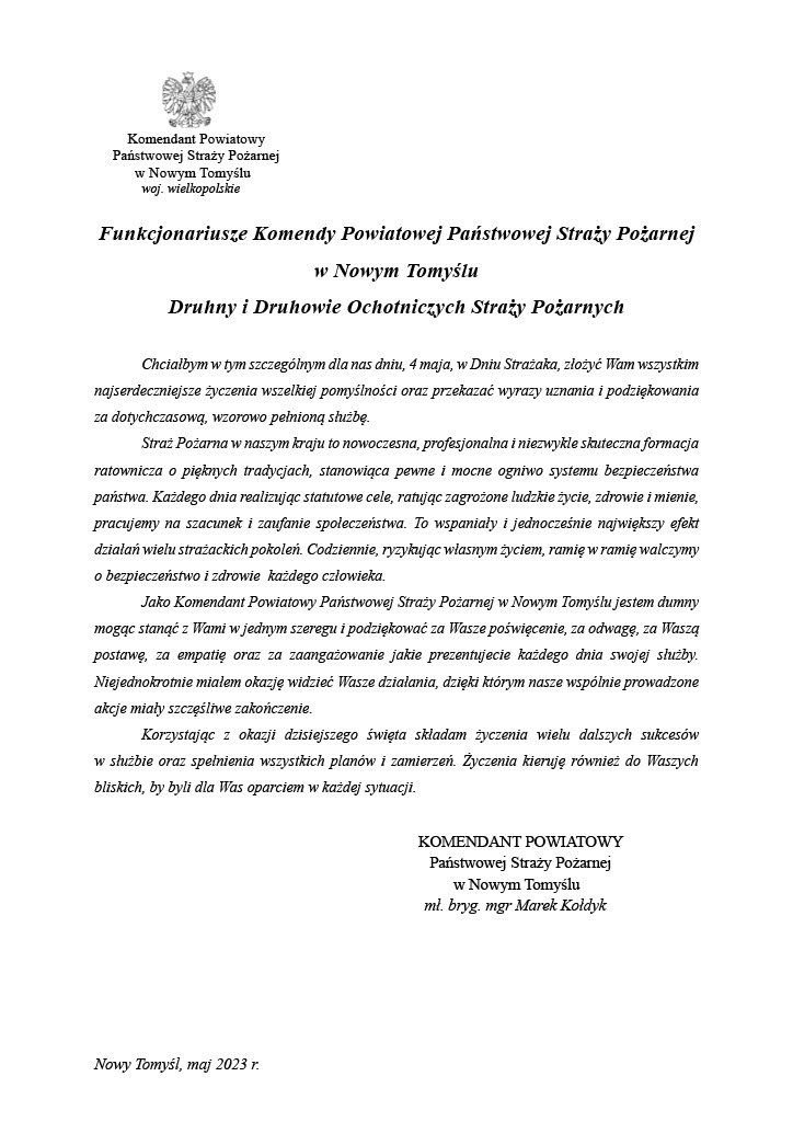Życzenia Komendanta Powiatowego PSP z okazji Dnia Strażaka 2023 04.05.2023 Zdjęcia (1) Pokaż zdjęcie 1 z galerii.