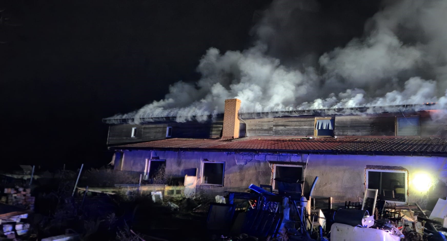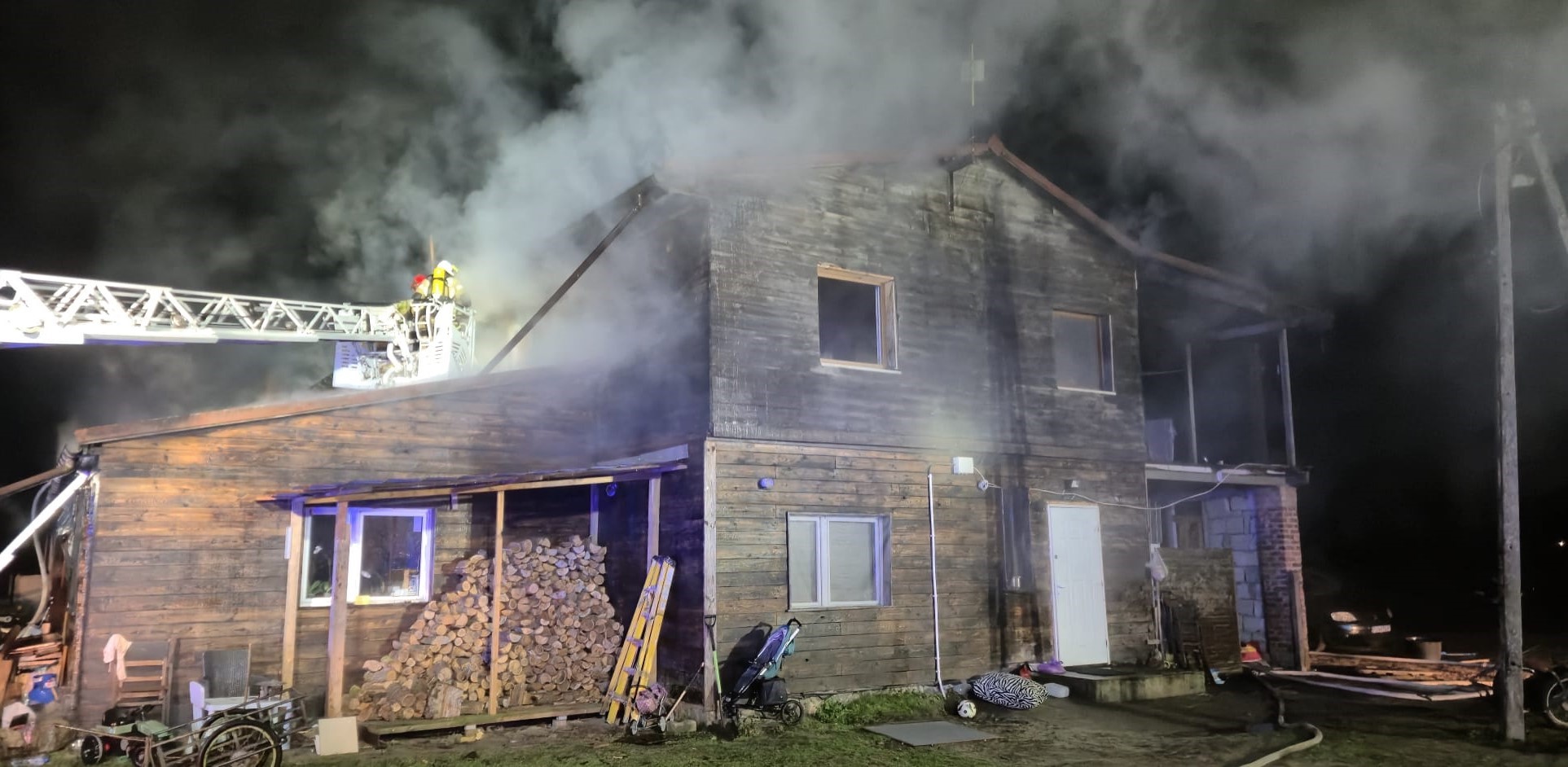 Po dojeździe na miejsce zdarzenia stwierdzono rozwinięty pożar budynku mieszkalno - inwentarskiego. Mieszkańcy ewakuowali się z budynku przed przybyciem służb oraz dodatkowo wyprowadzili z przylegającej stajni konie.