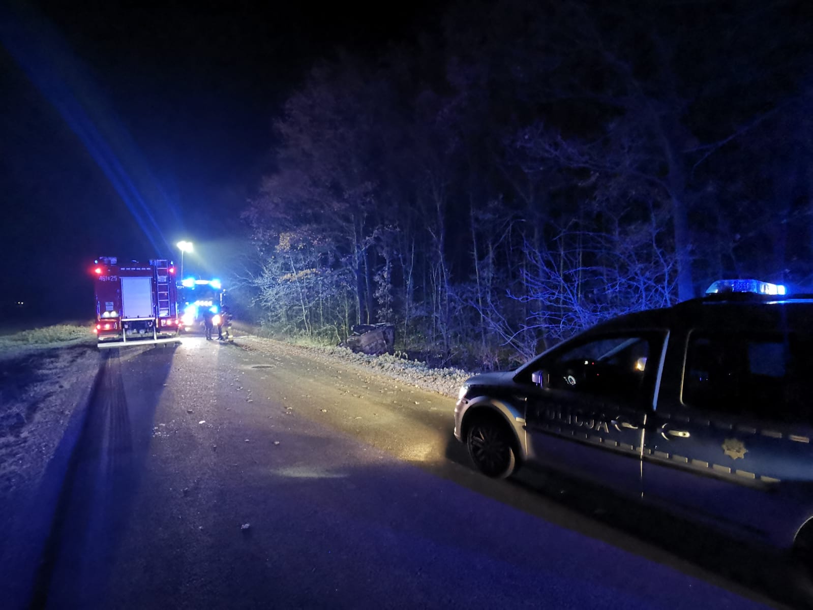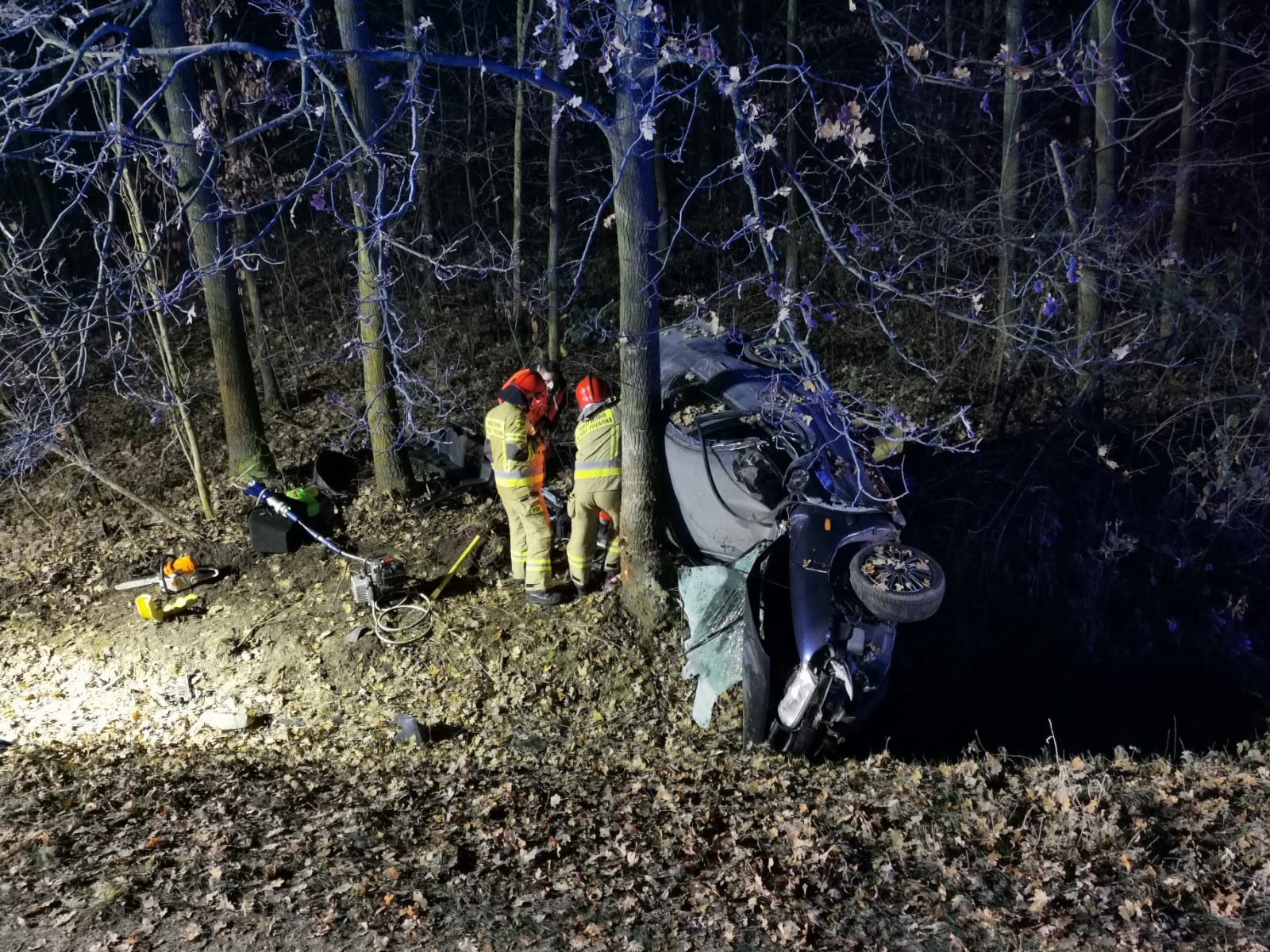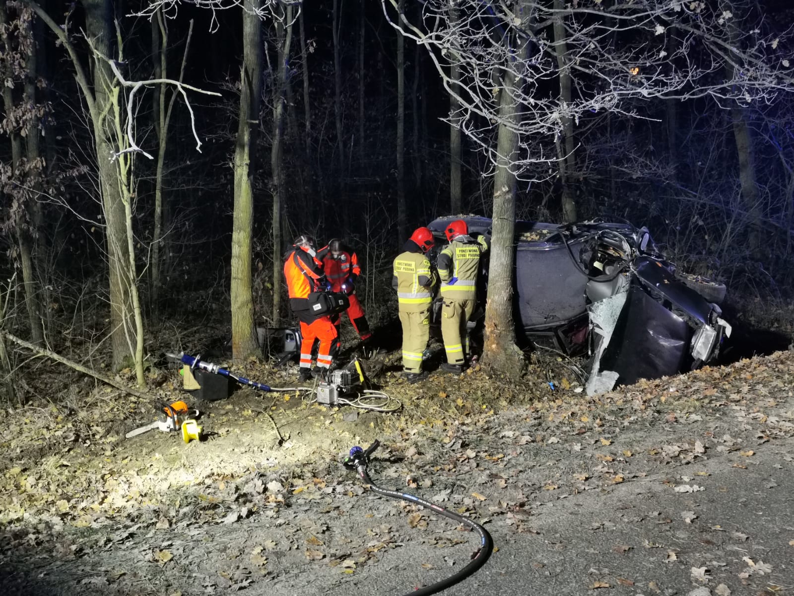 Do zdarzenia zadysponowano 2 zastępy z JRG PSP nr 1 Nysa oraz zastęp OSP Korfantów. Po alarmowym przybyciu na miejsce zdarzenia zabezpieczono teren działań. W wyniku przeprowadzonego rozpoznania potwierdzono treść zgłoszenia. Samochód osobowy Mitsubishi Carisma znajdował się w przydrożnym rowie, przyparty dachem do drzewa. Pojazdem podróżował tylko kierujący pojazdem. Działania JOP polegały na rozwinięciu linii szybkiego natarcia, odłączeniu akumulatora oraz przy pomocy sprzętu hydraulicznego usunięto klapę bagażnika w pojeździe w celu ułatwienia dostępu ratownikom medycznym do osoby poszkodowanej. W wyniku przeprowadzonego badania, lekarz stwierdził zgon poszkodowanego. Dalsze działania JOP polegały na zabezpieczeniu miejsca zdarzenia oraz oświetleniu terenu działań, do czasu zakończenia czynności dochodzeniowo-śledczych prowadzonych przez Policję.