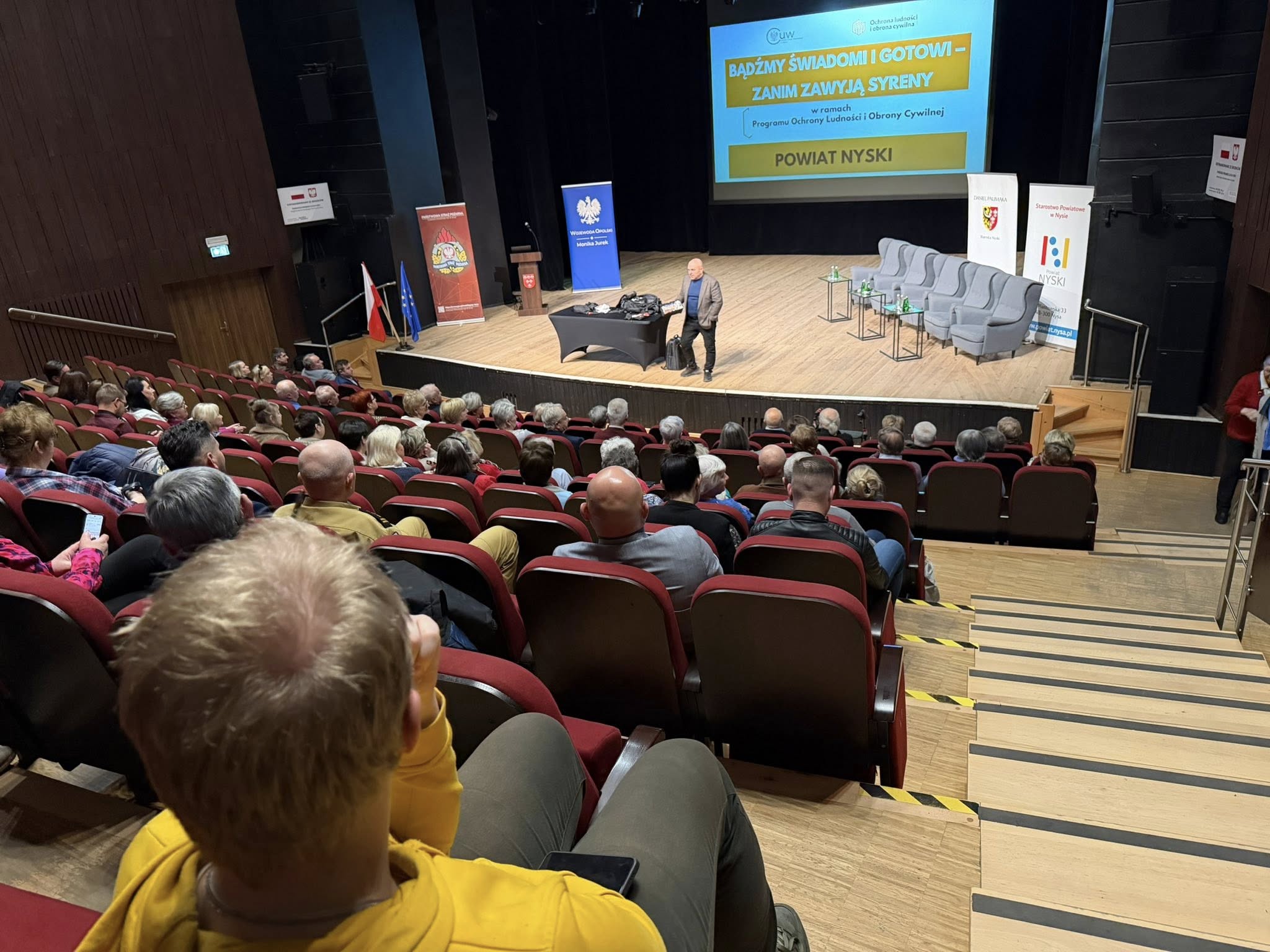 W Nyskim Domu Kultury odbyło się spotkanie poświęcona obronie cywilnej i przygotowaniu na sytuacje kryzysowe. Mieszkańcy regionu dowiedzieli się, jak chronić siebie i bliskich, zanim nadejdzie zagrożenie. Jednym z prelegentów podczas spotkania z mieszkańcami powiatu nyskiego był Komendant Powiatowy PSP w Nysie st. bryg. Paweł Gotkowski.