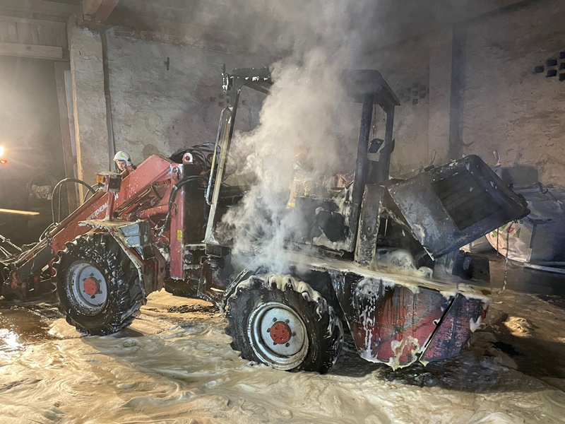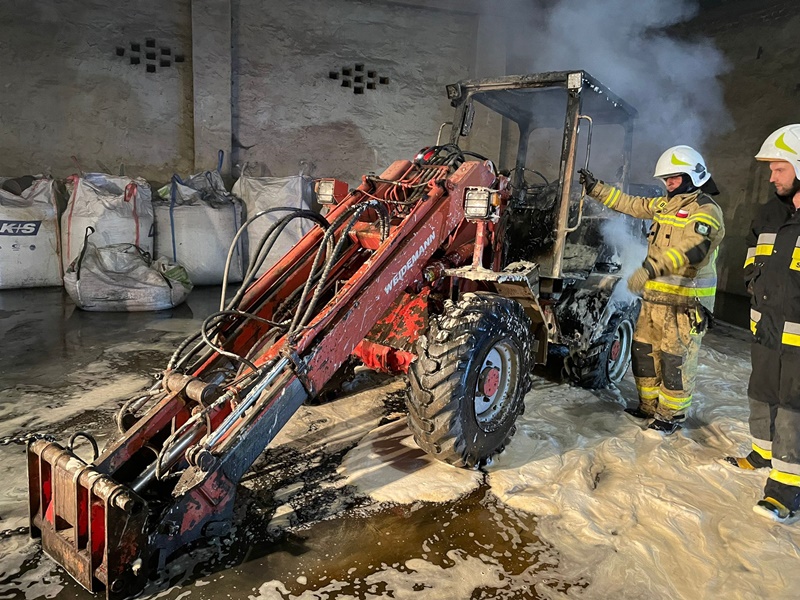 Po alarmowym przybyciu na miejsce zdarzenia, zabezpieczono teren działań. W wyniku przeprowadzonego rozpoznania ustalono, że doszło do pożaru ładowarki teleskopowej wewnątrz budynku magazynowego – stodoły.