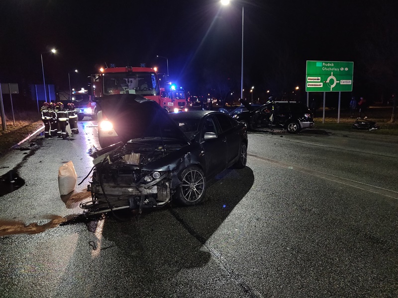 Do zdarzenia zadysponowano 3 zastępy z JRG PSP nr 1 Nysa. Po alarmowym przybyciu na miejsce zdarzenia zabezpieczono teren działań. W wyniku przeprowadzonego rozpoznania ustalono, że doszło do zderzenia 3 samochodów osobowych, którymi łącznie podróżowały 4 osoby dorosłe, w tym jedna uwięziona w pojeździe Mitsubishi, droga zablokowana, na miejscu Policja oraz ZRM. Działania zastępów PSP polegały na: oświetleniu terenu działań, wydobyciu osoby poszkodowanej z wnętrza uszkodzonego pojazdu na prośbę ZRM, odłączeniu zasilania w uszkodzonych pojazdach, zakręceniu zaworu LPG w Mitsubishi, zabezpieczeniu studzienki kanalizacyjnej obwałowaniem z sorbentu, pomocy Policji w kierowaniu ruchem.