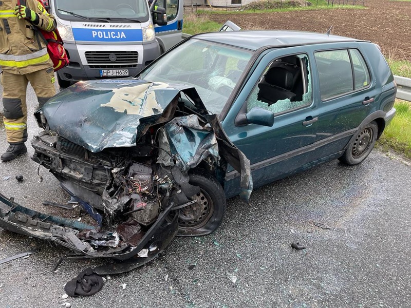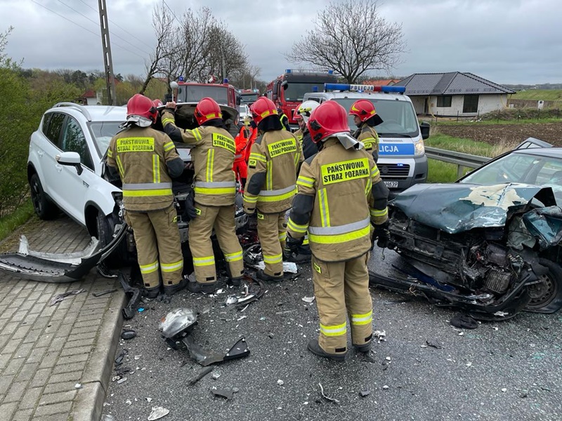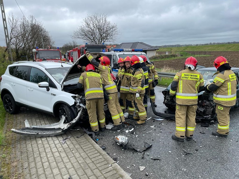 Do zdarzenia zadysponowano 4 zastępy z JRG PSP nr 1 Nysa oraz zastęp OSP Wójcice. Po alarmowym przybyciu na miejsce zdarzenia zabezpieczono teren działań. W wyniku przeprowadzonego rozpoznania ustalono, że doszło do zderzenia dwóch samochodów osobowych (Ford Kuga, VW Golf). Kierowcy obu pojazdów podróżowali sami oraz samodzielnie opuścili uszkodzone pojazdy. Przybyły na miejsce zespół ZRM po przebadaniu kierujących podjął decyzję o zabraniu ich do szpitala w celu dalszej obserwacji. Droga nieprzejezdna w obu kierunkach. Dalsze działania zastępów JOP polegały na: odłączeniu akumulatorów w obu pojazdach, ograniczeniu rozprzestrzeniania się płynów eksploatacyjnych z uszkodzonych pojazdów.