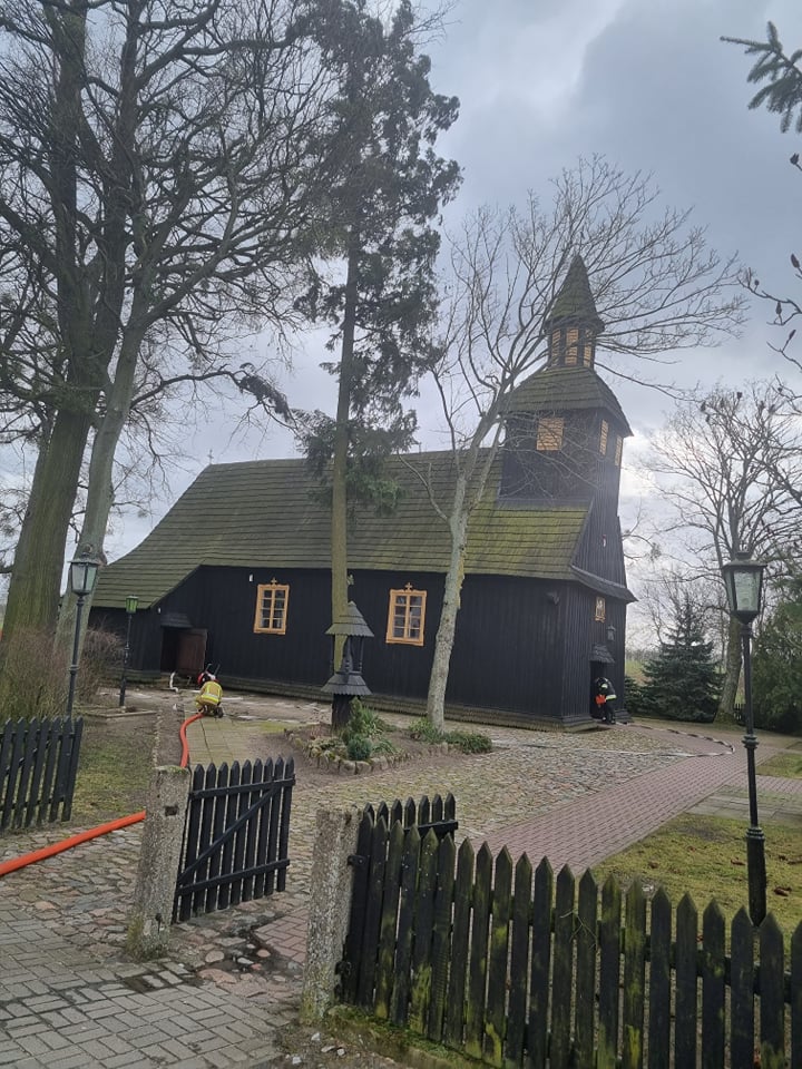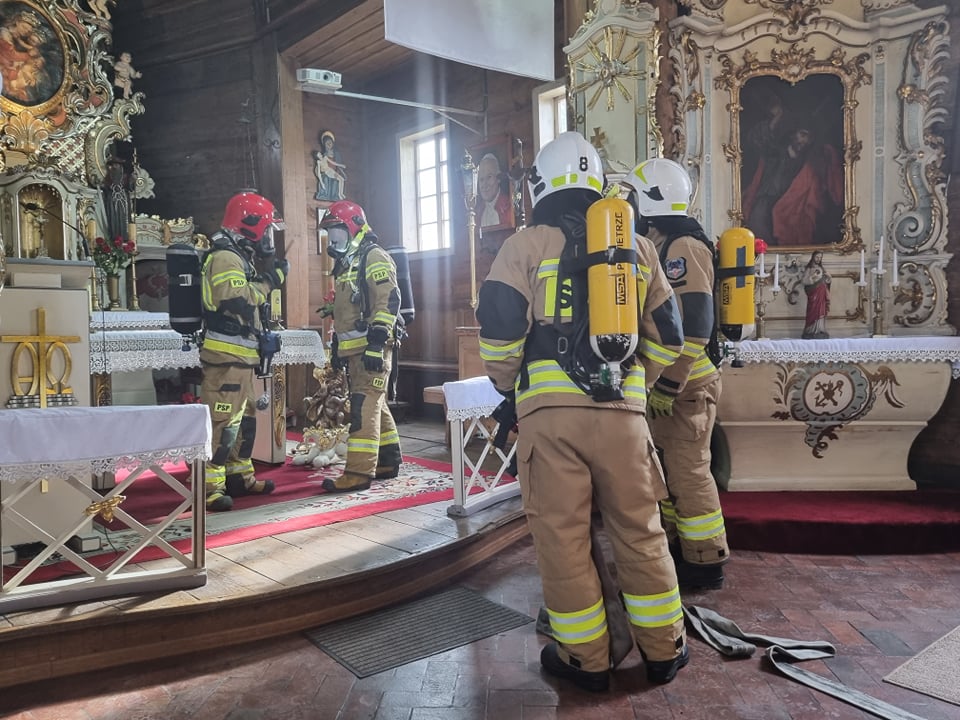 - sprawdzenie współdziałania funkcjonariuszy PSP i druhów OSP podczas podawania środków gaśniczych w natarciu (pożar pomieszczenia zakrystii), obronie (pozostała część obiektu);