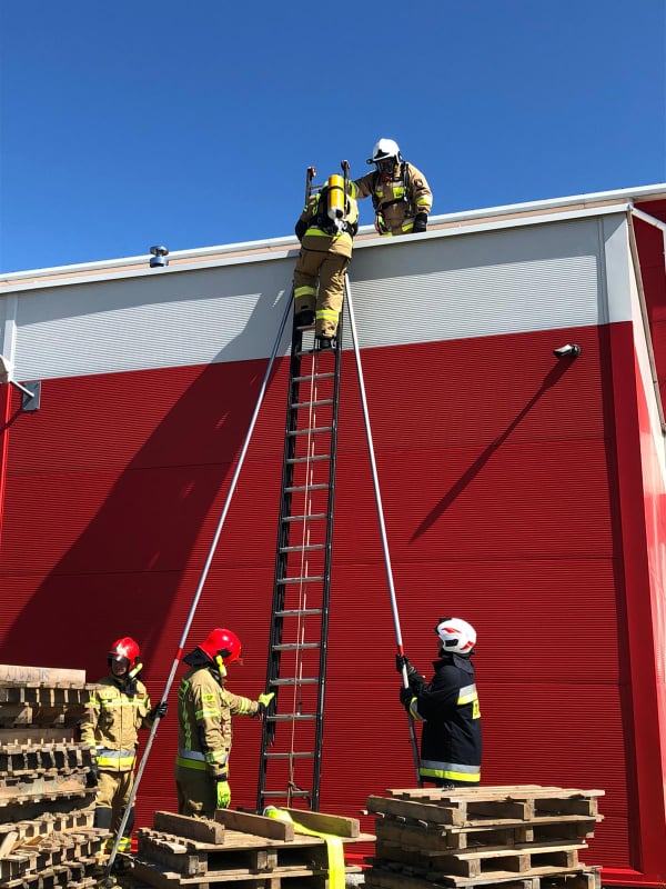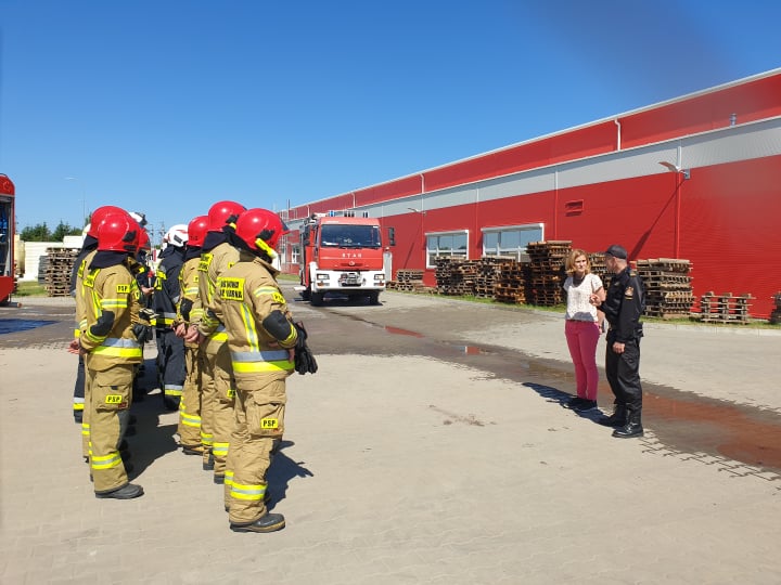- sprawdzenie współdziałania funkcjonariuszy PSP i druhów OSP podczas podawania środków gaśniczych w natarciu (pożar przy rampie załadunkowej), obronie (obiekty produkcyjno – magazynowe) oraz prowadzenia działań ratowniczo-gaśniczych na wysokości z wykorzystaniem drabin przystawnych,