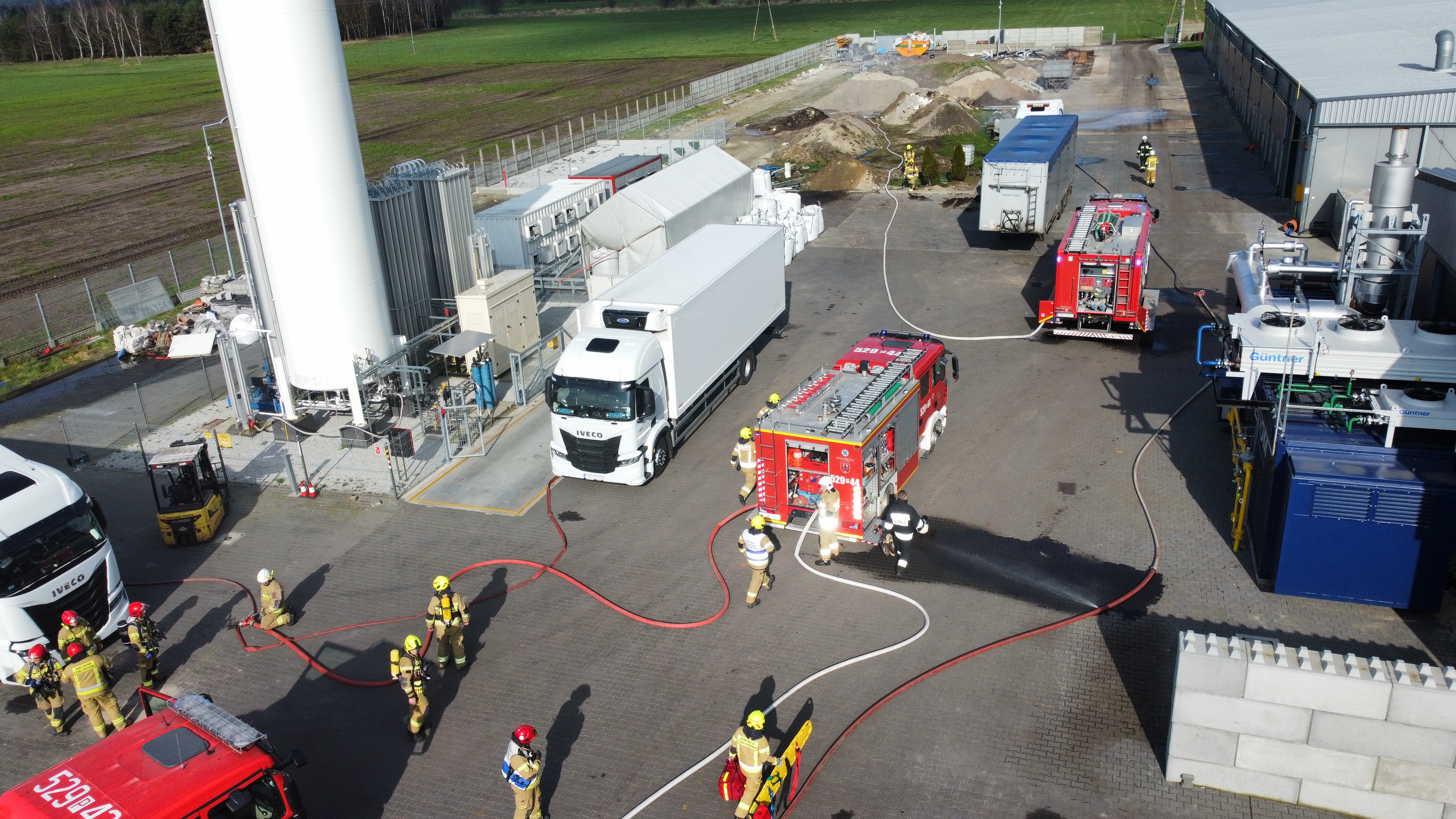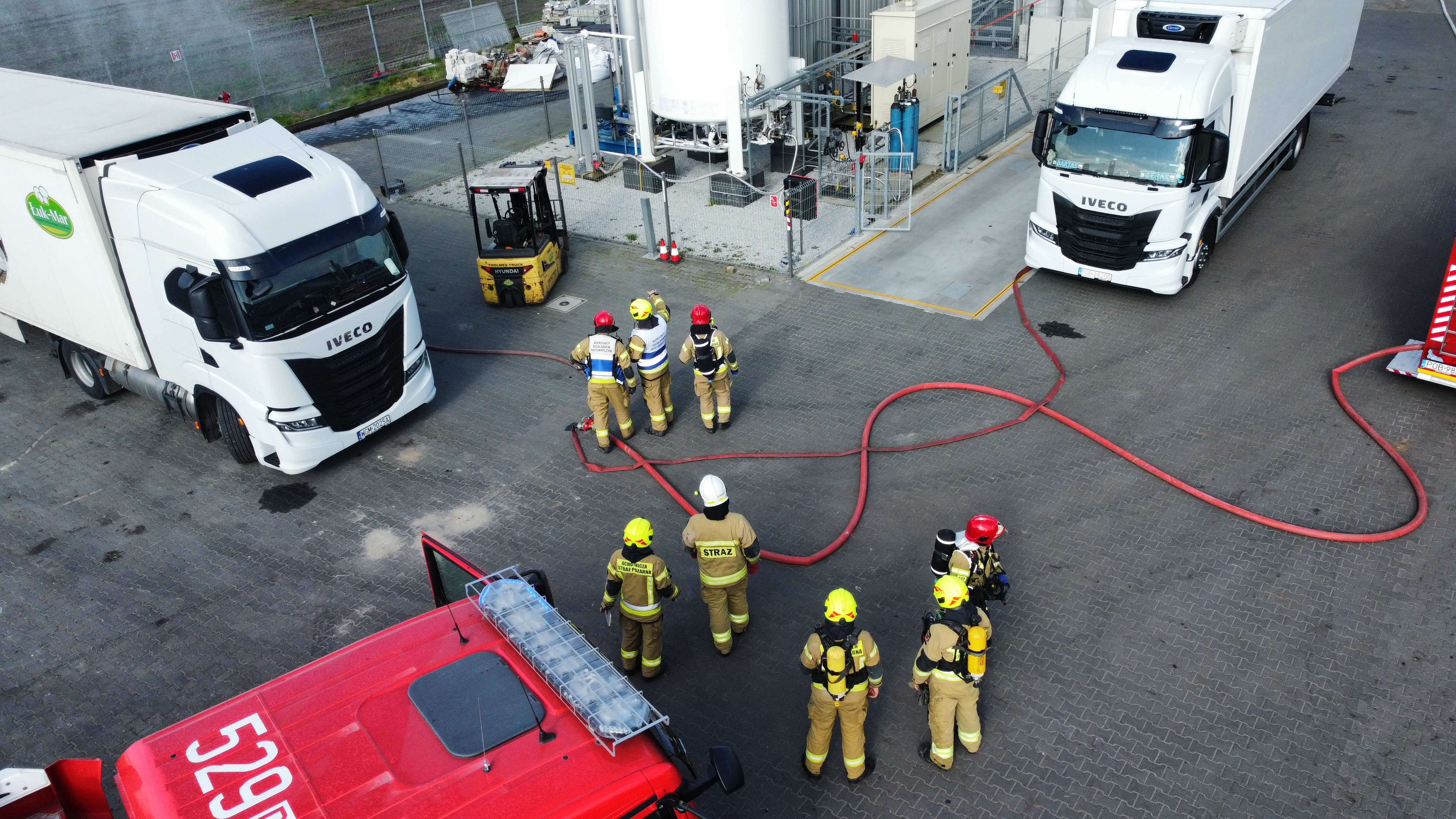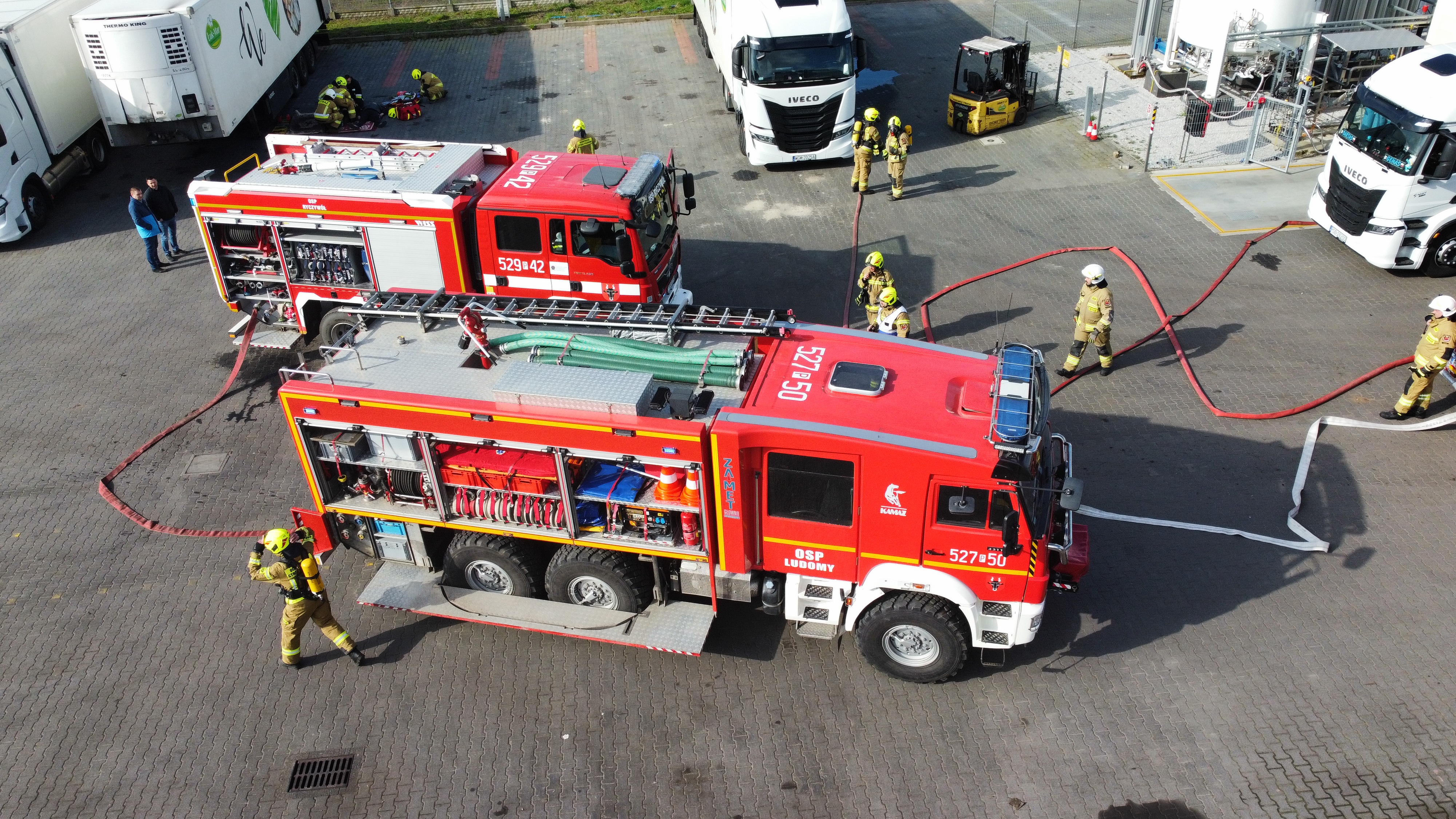 - sprawdzenie współdziałania funkcjonariuszy PSP i druhów OSP podczas podawania środków gaśniczych w natarciu (zbiorniki LNG), obronie (pozostałe budynki sąsiadujące);