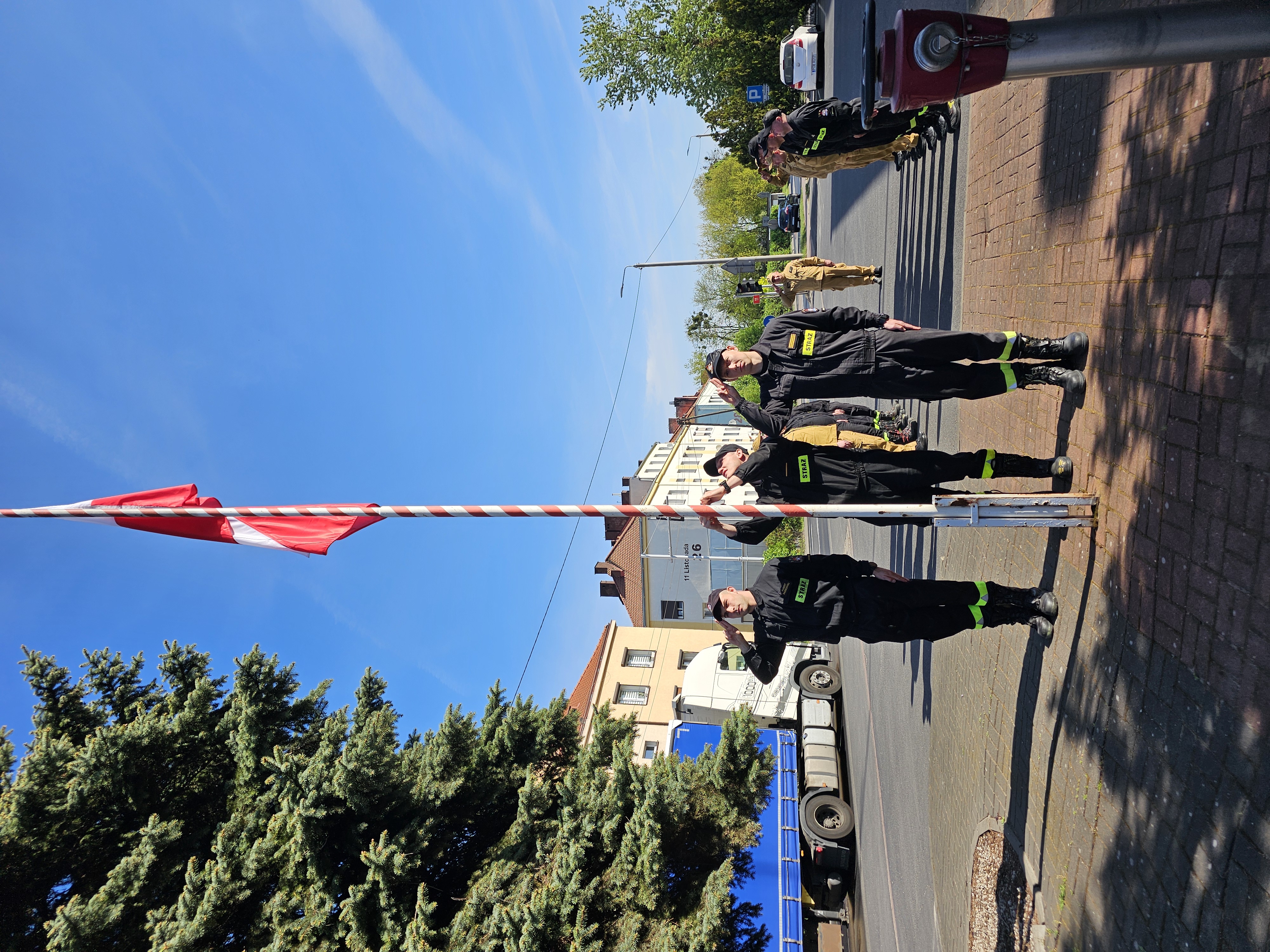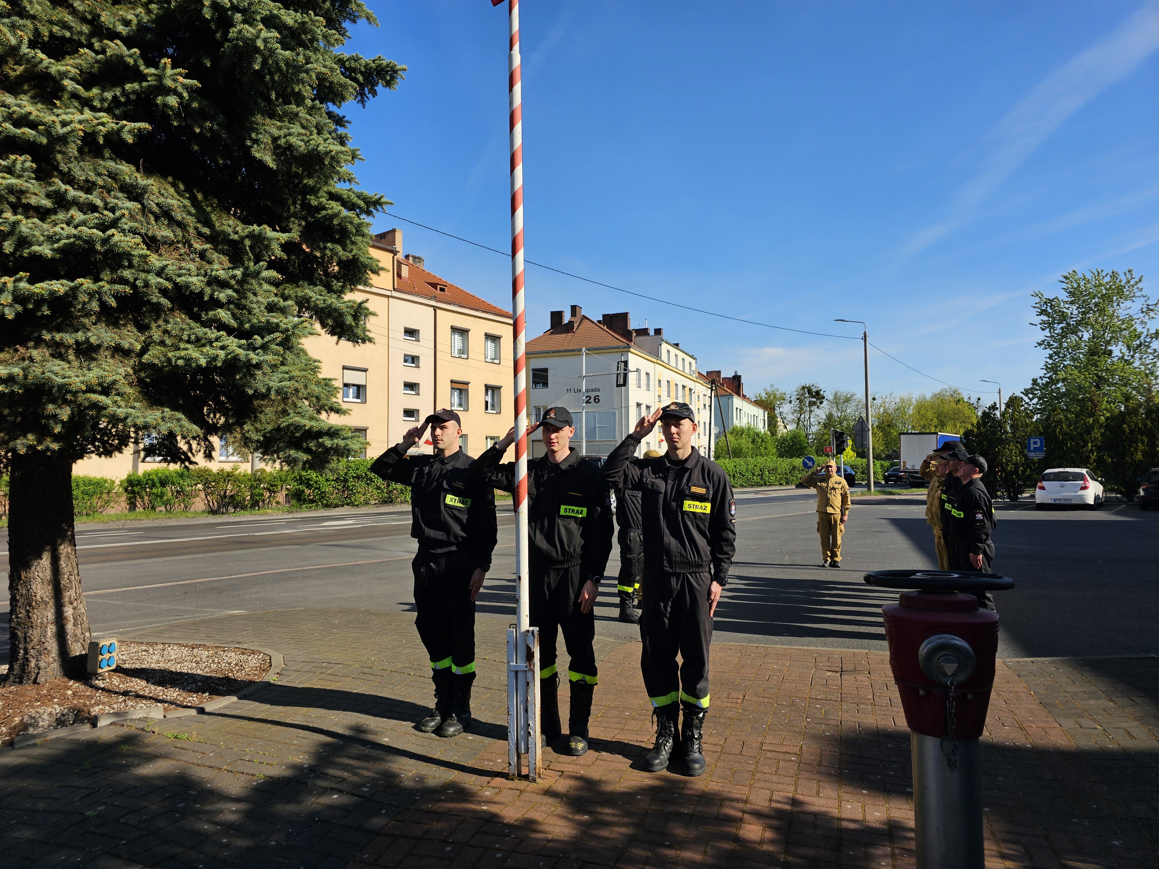 Strażacy, jak co roku w drugi dzień maja, podczas uroczystej zmiany służbowej wywiesili na maszcie znajdującym się przed budynkiem Komendy białą czerwoną flagę.