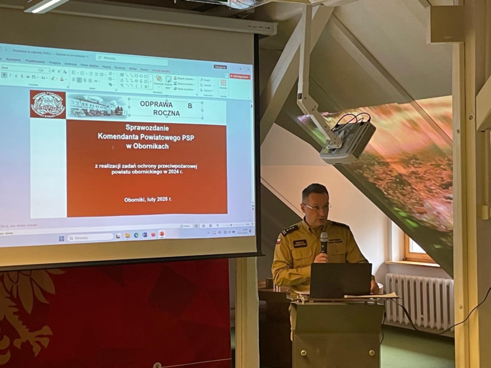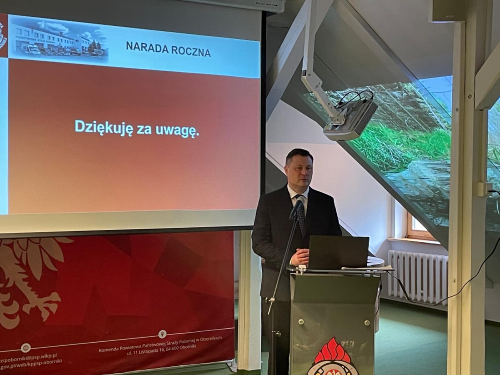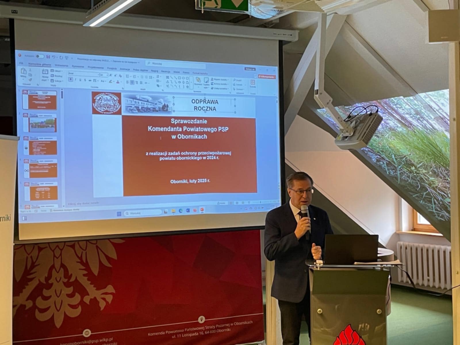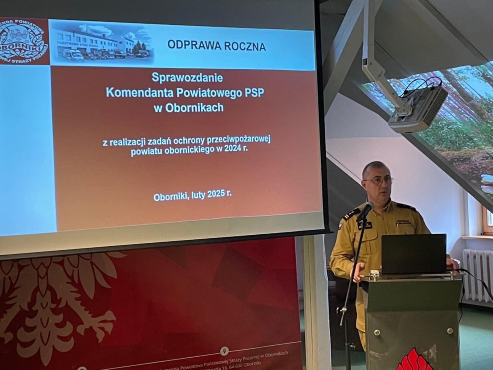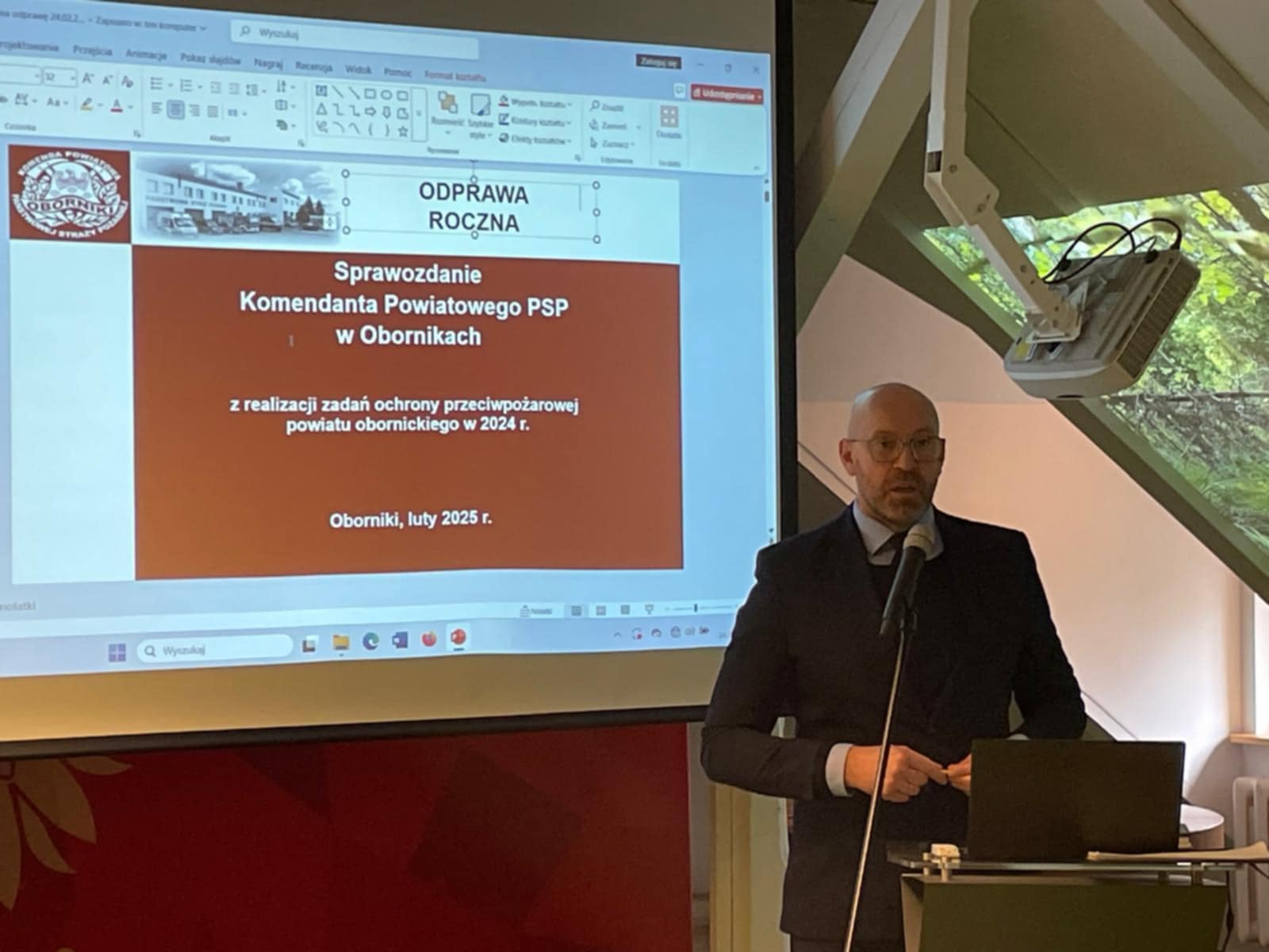 bryg. Tomasz Daszkiewicz przedstawił w formie prezentacji multimedialnej informacje dotyczące działalności Komendy Powiatowej Państwowej Straży Pożarnej w Obornikach w roku 2024 oraz nakreślił główne kierunki działań i cele wyznaczone dla obornickiej Komendy na rok bieżacy. Skierował także słowa podziękowania dla Władz samorządowych, dziękując za całoroczną współpracę oraz otrzymane wsparcie finansowe.