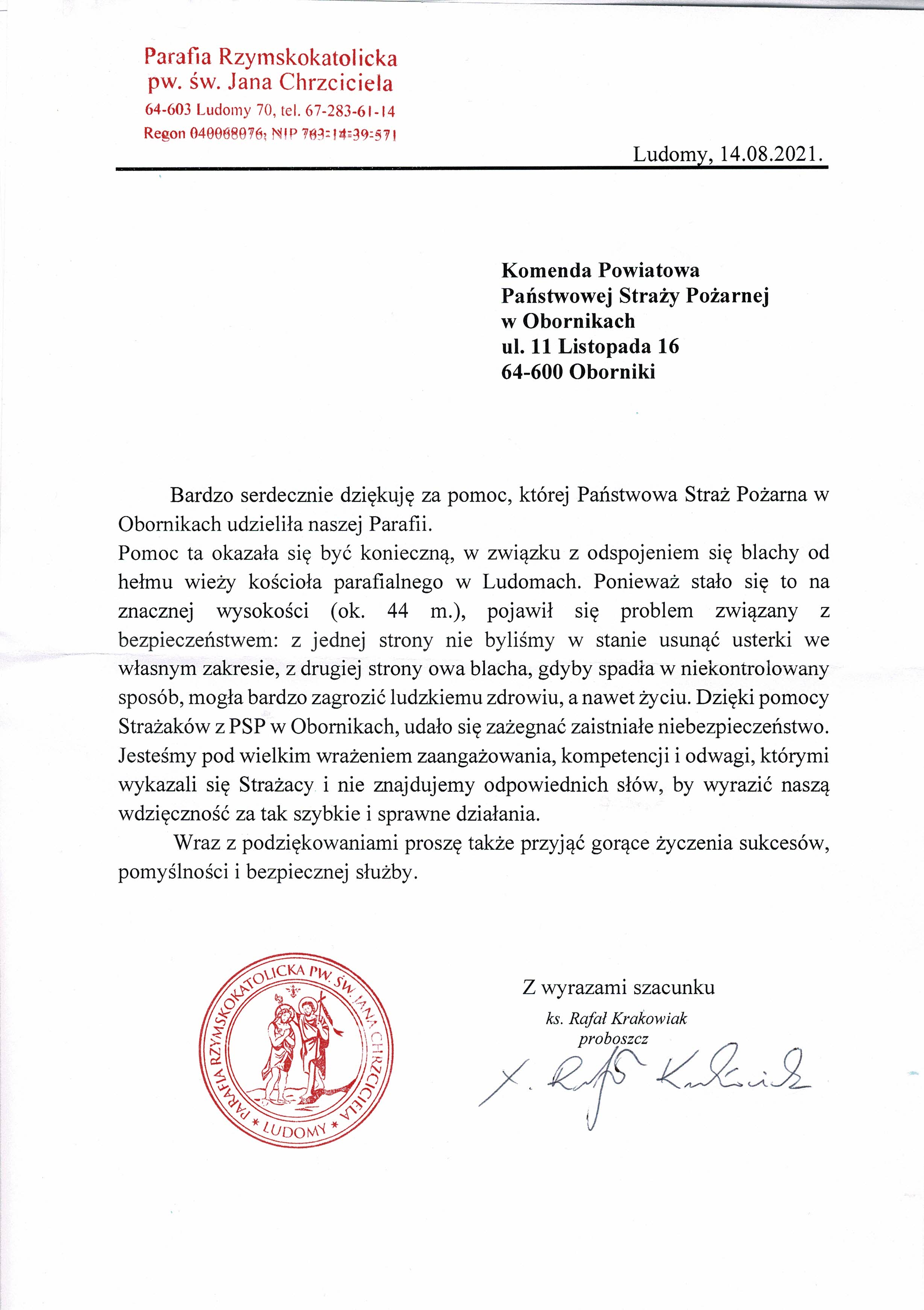 W dniu 20 sierpnia 2021 r. do Komendy Powiatowej Państwowej Straży Pożarnej w Obornikach wpłynęły szczególne podziękowania od ks. Rafała Krakowiaka - Proboszcza Parafii pw. Św. Jana Chrzciciela w Ludomach za pomoc w usunięciu niebezpiecznego elementu poszycia dachu wieży kościelnej.