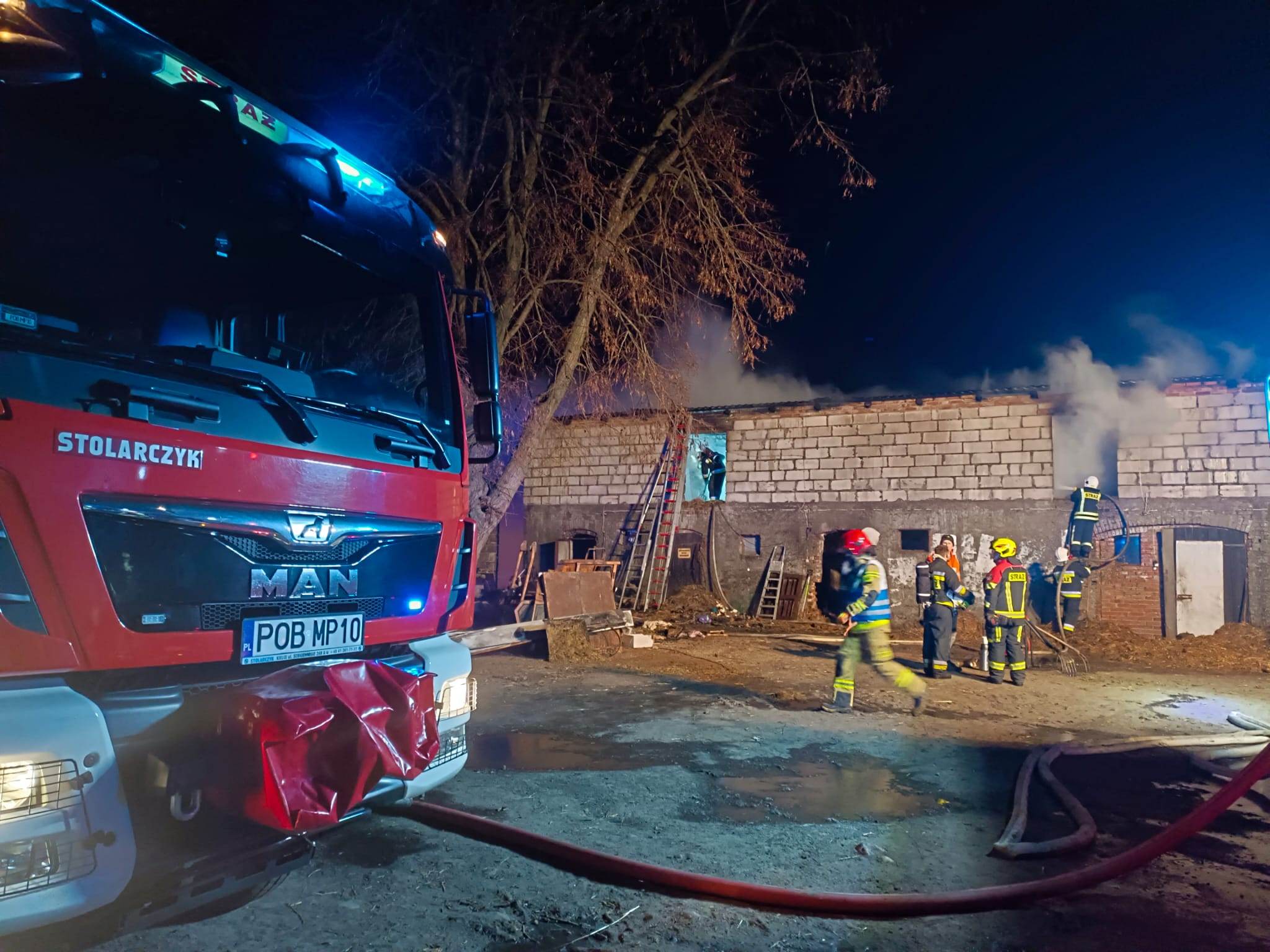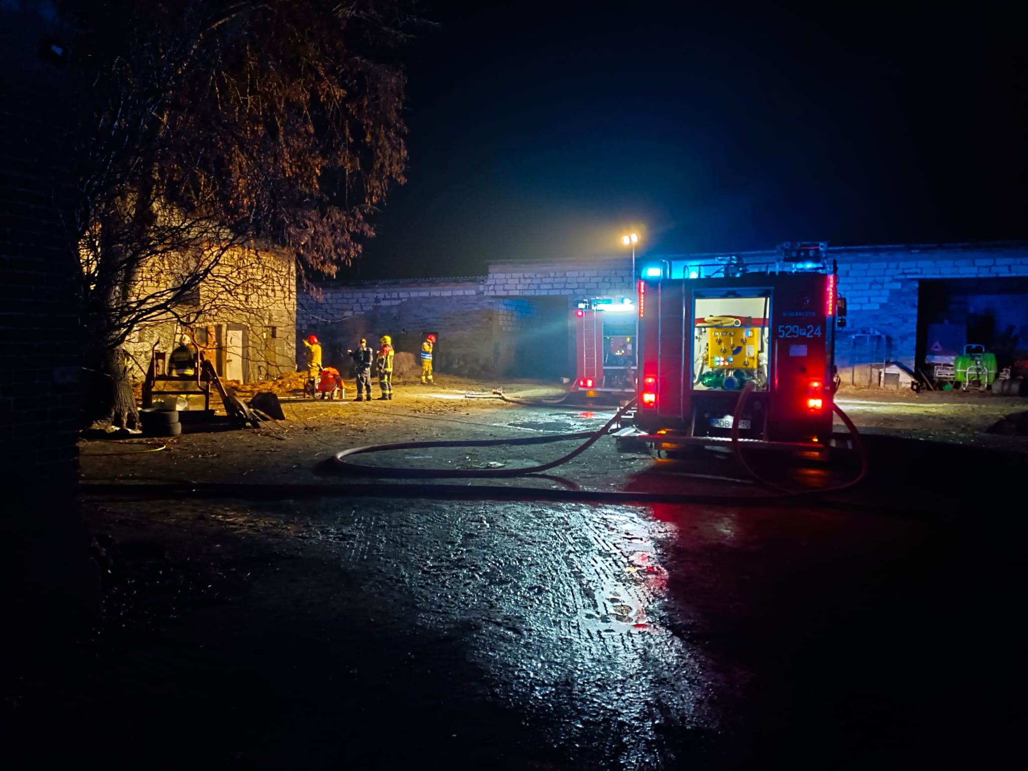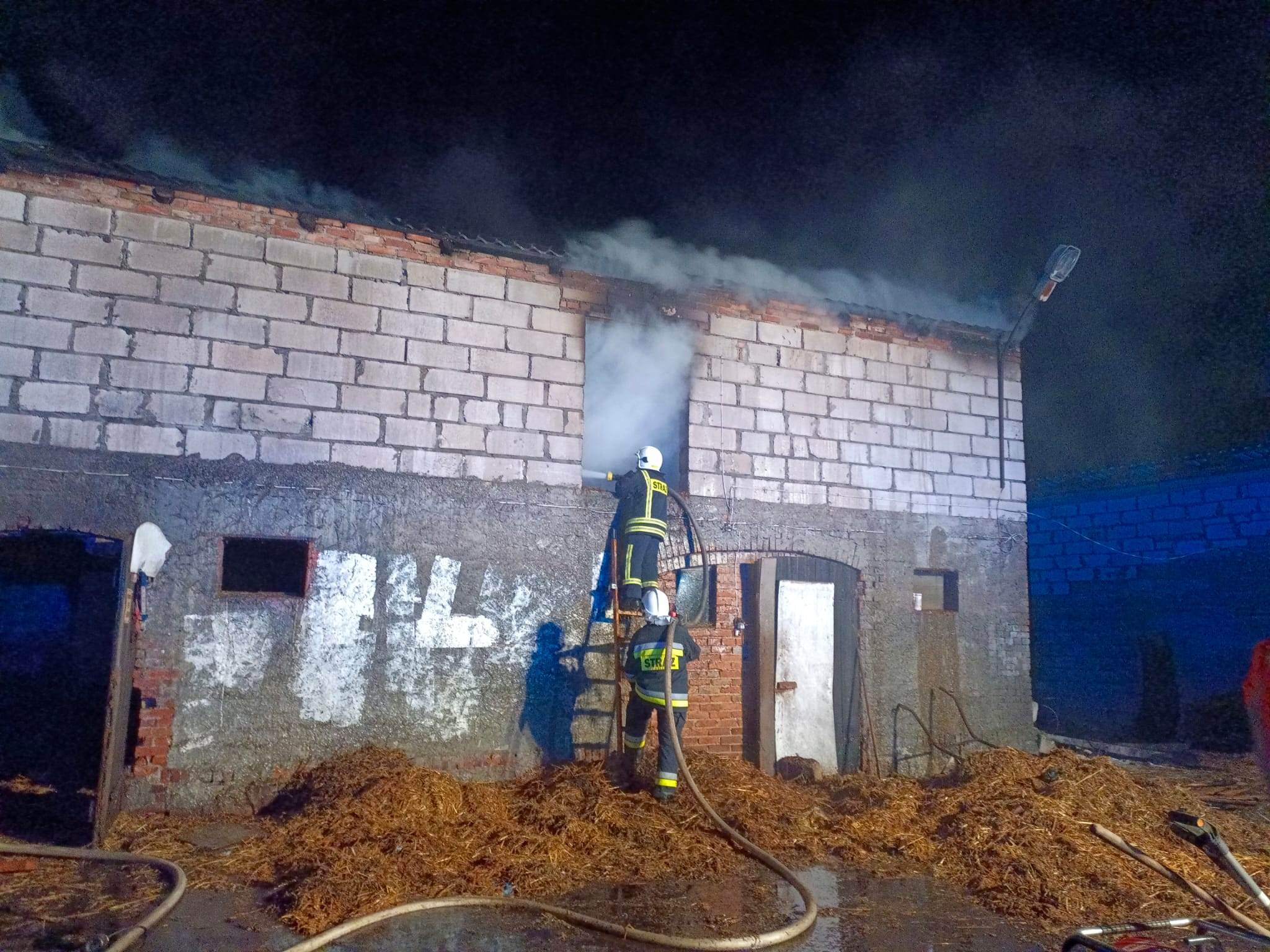 Działania strażaków polegały na zabezpieczeniu miejsca zdarzenia, odłączeniu prądu w budynku oraz podanie trzech prądów wody w natarciu na palące się poddasze oraz więźbę dachową. Następnie działania JOP polegały na prowadzeniu wentylacji nadciśnieniowej, oświetleniu terenu akcji, pracach rozbiórkowych nadpalonych elementów więźby dachowej oraz usunięciu tlącej się słomy z poddasza. Po ugaszeniu pożaru oraz usunięciu słomy budynek sprawdzono kamerą termowizyjną w celu wykluczenia ukrytych zarzewi ognia – brak zagrożenia.