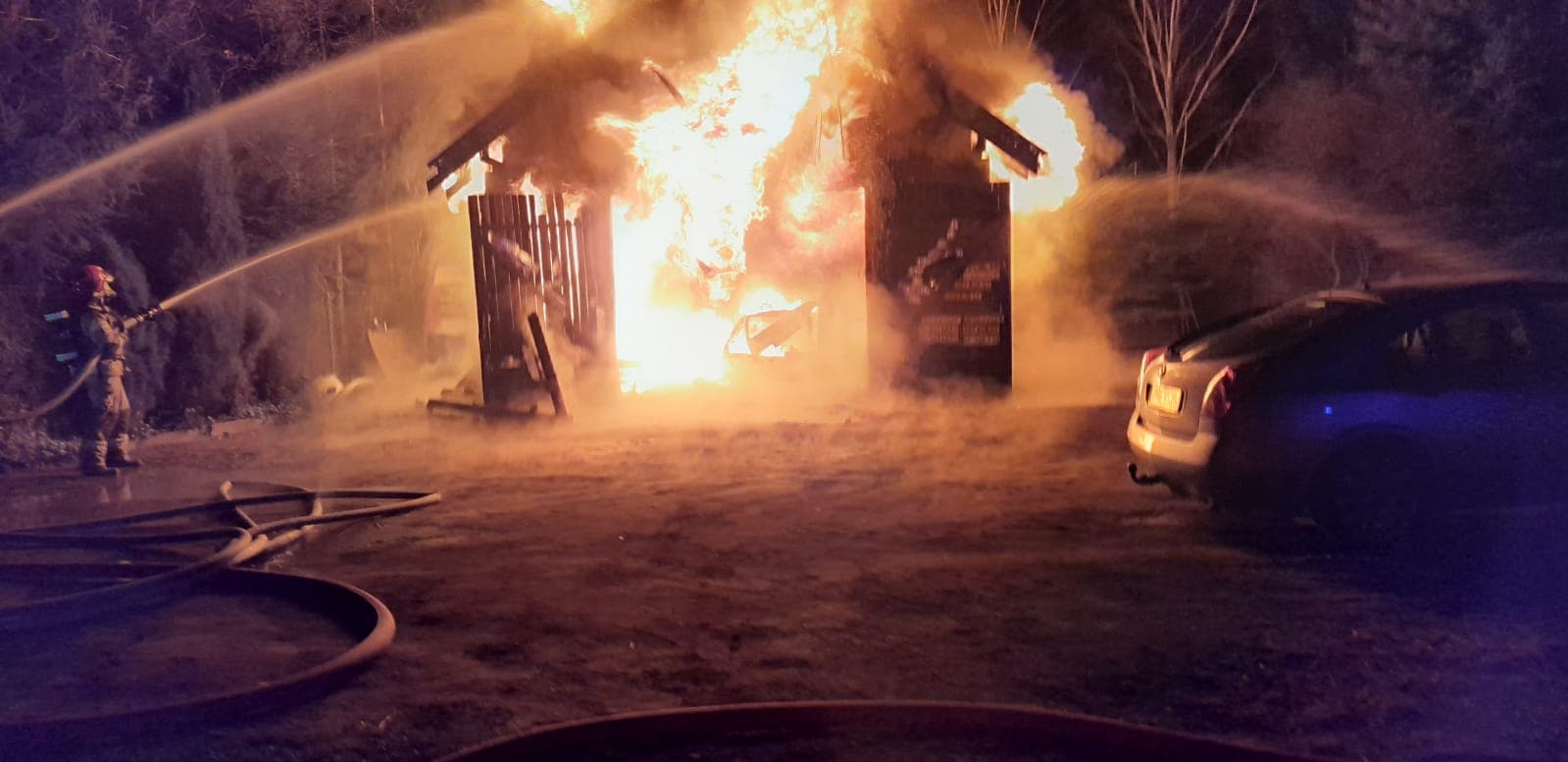 Po dojeździe na miejsce zdarzenia KDR stwierdził, że budynek garażu objęty jest całkowicie ogniem. W środku znajdował się samochód osobowy marki FIAT Cinquecento i trzy butle z gazem technicznym: tlenem, acetylenem oraz dwutlenekiem węgla. Bezpośrednio przy jego ścianie znajdował się samochód dostawczy marki FORD Transit. Zagrożony był także pobliski budynek mieszkalny oraz stojące w pobliżu samochody osobowe.