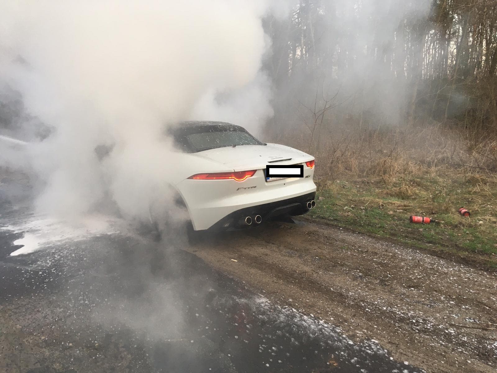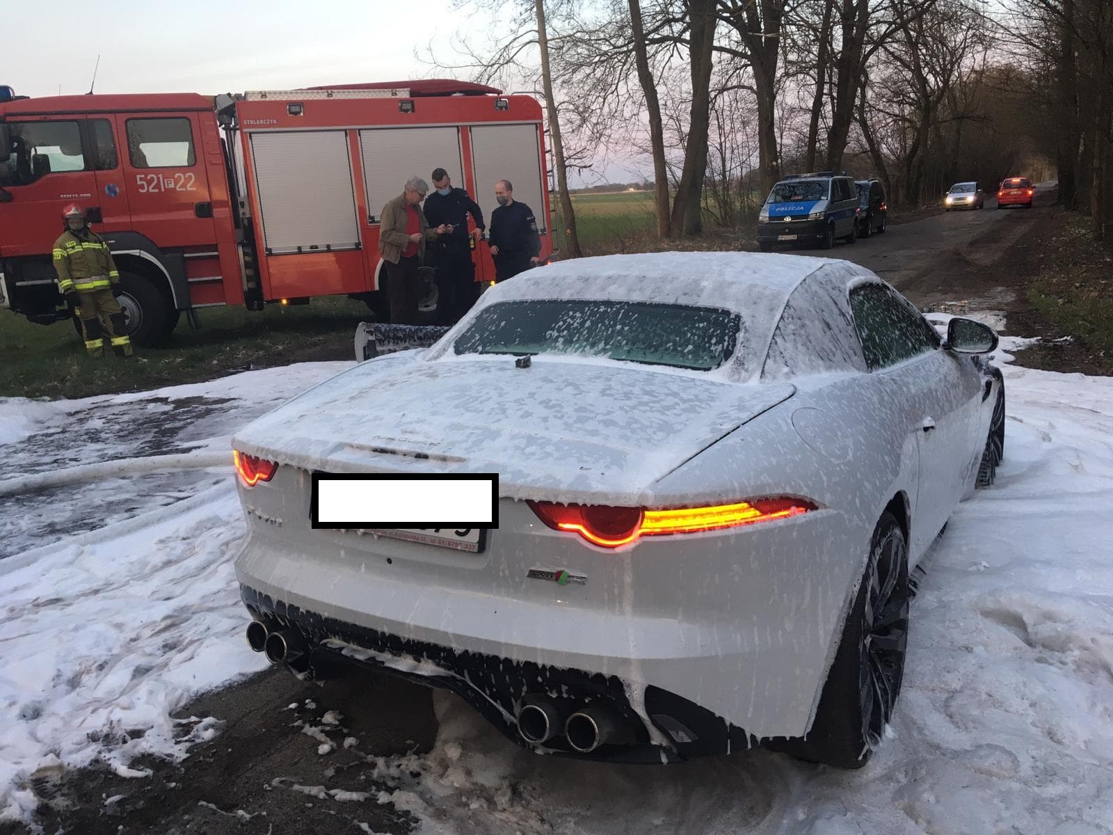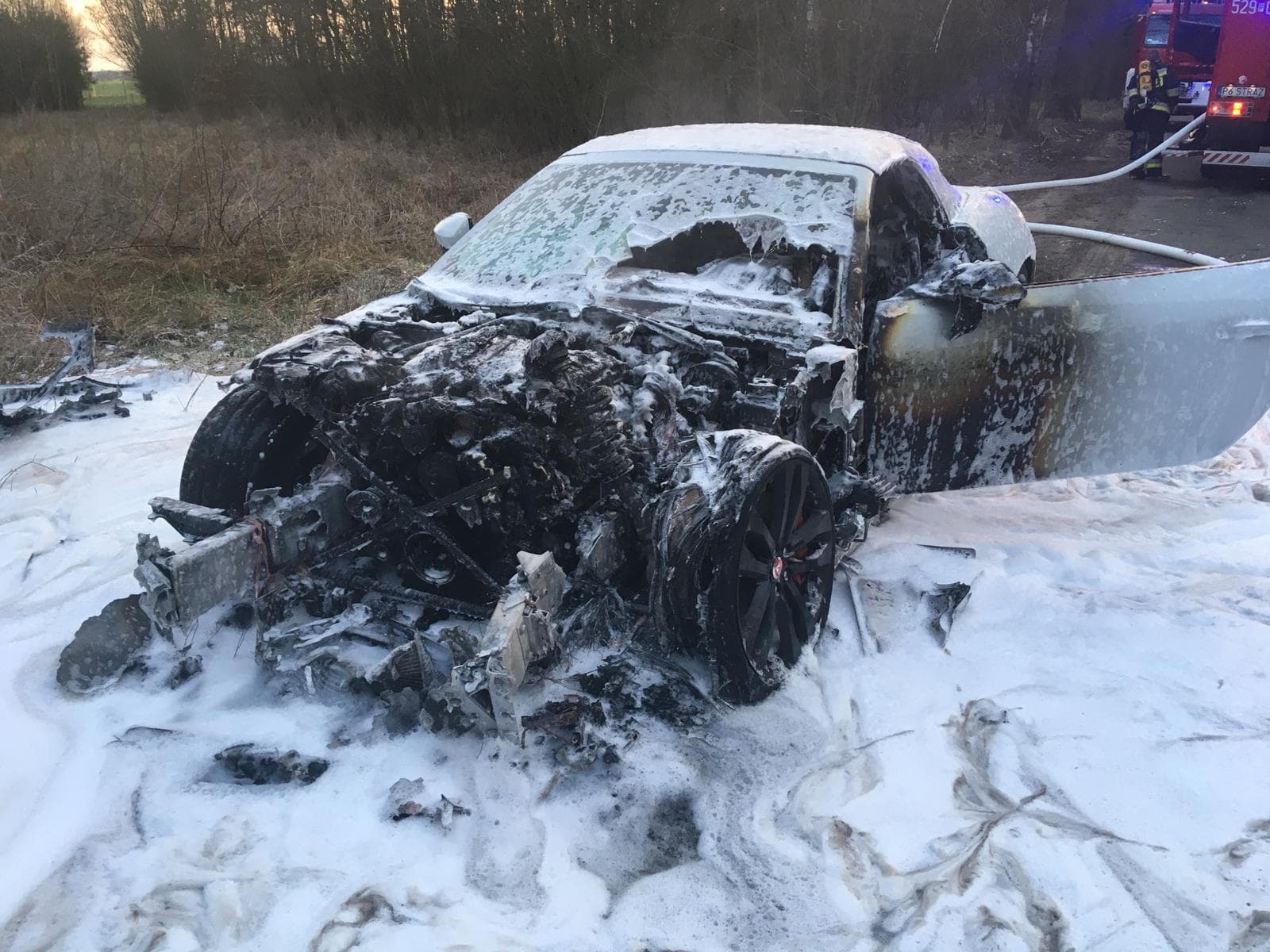 Po dojeździe na miejsce zdarzenia KDR stwierdził, że na poboczu drogi pali się samochód osobowy marki Jaguar. Kierujący pojazdem opuścił pojazd przed przybyciem JOP i nie wymagał udzielenia pomocy medycznej. Przed przybyciem Straży Pożarnej właściciel pojazdu podjął nieskuteczną próbę ugaszenia pożaru przy pomocy gaśnic.
