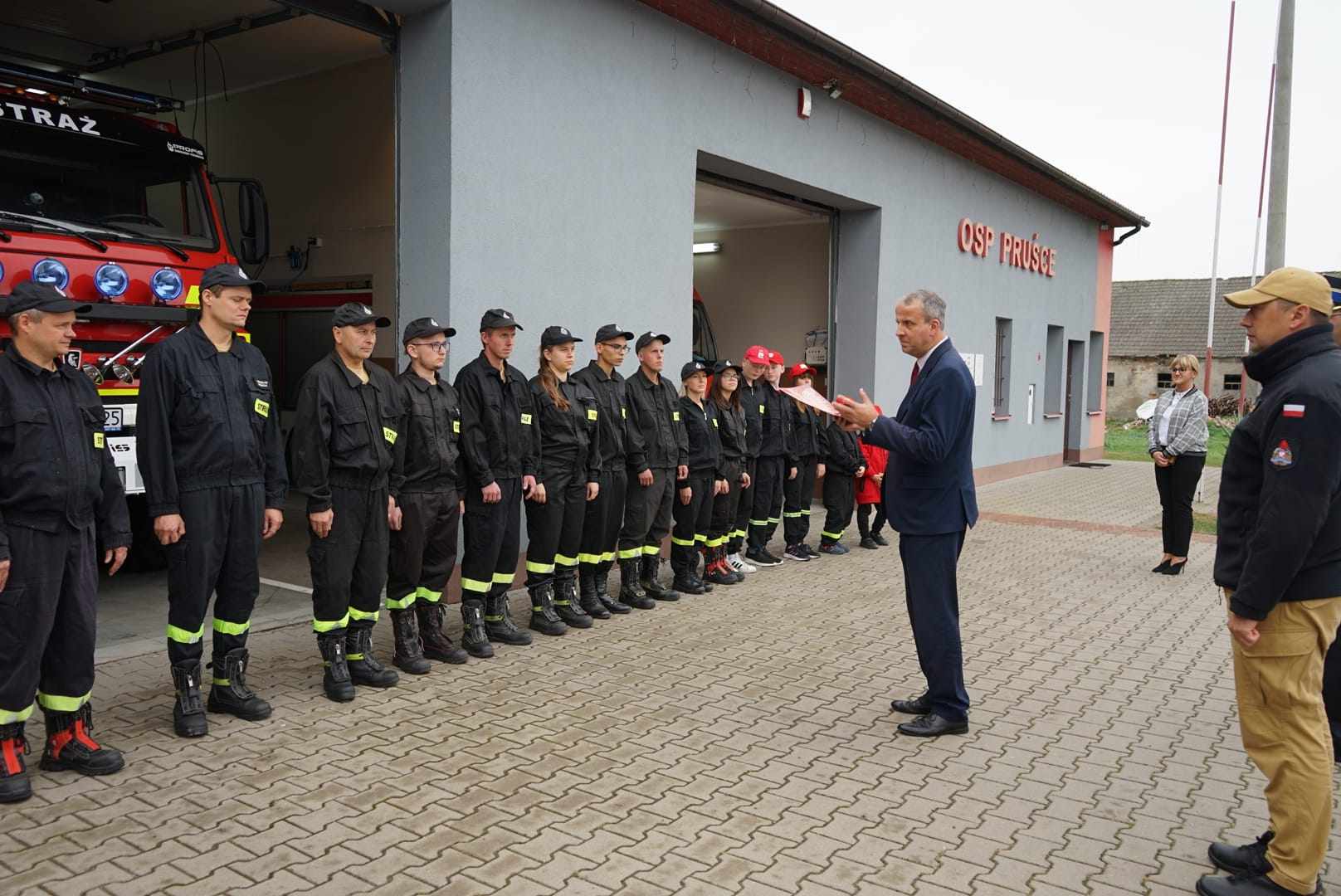Podczas spotkania Wojewoda Wielkopolski Michał Zieliński zapoznał się z wyposażeniem jednostki Ochotniczej Straży Pożarnej w Pruścach. Na ręce Naczelnika OSP Pruśce dh. Damiana Grabickiego przekazał od Komendanta Głównego Państwowej Straży Pożarnej gen. brygadiera Andrzeja Bartkowiaka promesę w wysokości 10 tys. zł. na zapewnienie gotowości bojowej jednostki.