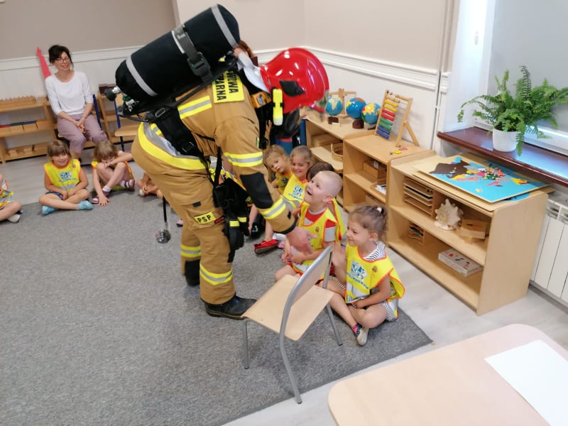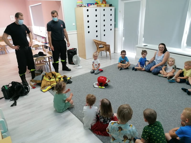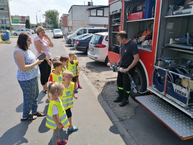 Celem spotkania było zapoznanie Maluchów ze specyfiką pracy strażaków i miejscem ich pracy, samochodami pożarniczymi oraz sprzętem będącym na ich wyposażeniu. Dzieci zostały zapoznane z zagrożeniami jakie mogą wystąpić podczas pożaru oraz zasadami zachowania podczas wystąpienia zagrożenia. Ponadto Przedszkolaki zostały zapoznane z zasadami wzywania straży pożarnej podczas występowania zagrożenia życia lub zdrowia i przekazywania informacji na międzynarodowy numer alarmowy 112. Na zakończenie wizyty strażacy zaprezentowali wyposażenie wozu strażackiego oraz sprzętu pożarniczego będącego na jego wyposażeniu. Przez chwile Dzieci mogły poczuć się jak prawdziwi strażacy przymierzając hełm, wsiadając do wozu strażackiego oraz podając prąd wody pod nadzorem funkcjonariuszy PSP. Mamy nadzieję, że informacje które zostały przekazane Maluchom na długo pozostaną w ich pamięci.