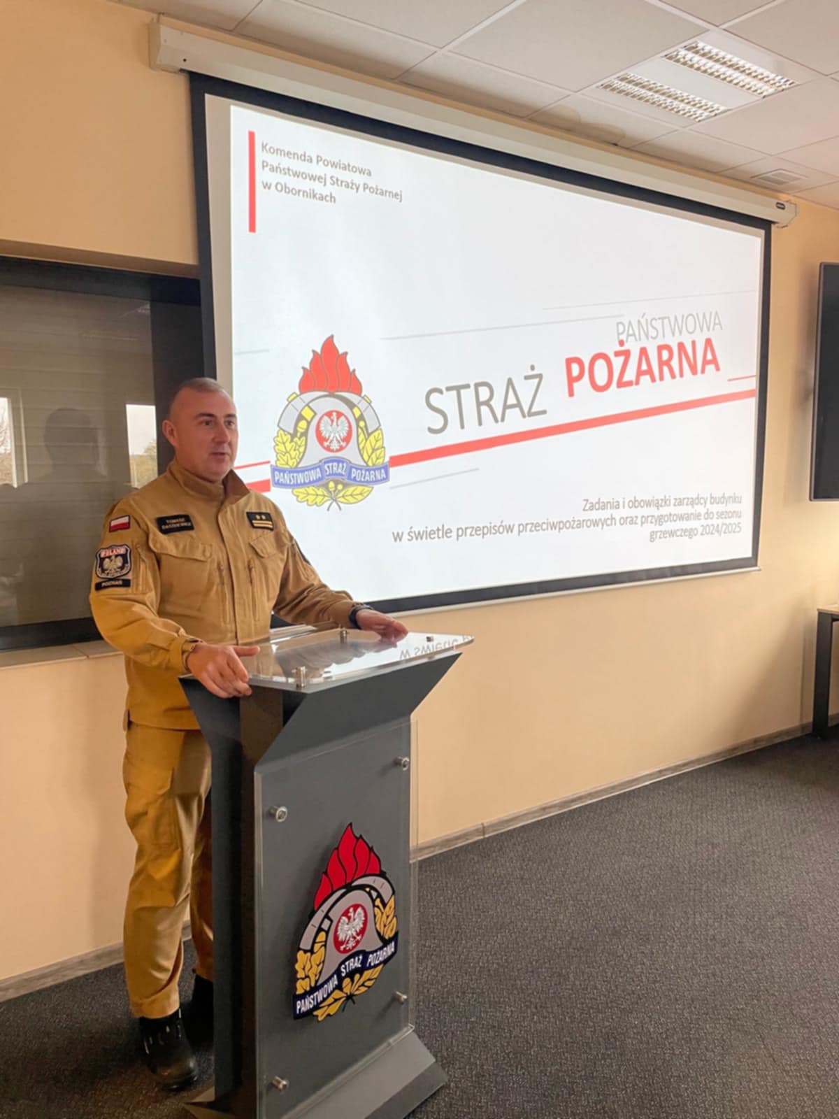 W dniu 07 listopada 2024 r. w siedzibie Komendy Powiatowej Państwowej Straży Pożarnej w Obornikach odbyło się szkolenie poświęcone tematyce „Zadań i obowiązków zarządcy budynku w świetle przepisów przeciwpożarowych oraz przygotowanie do sezonu grzewczego 2024/2025”.