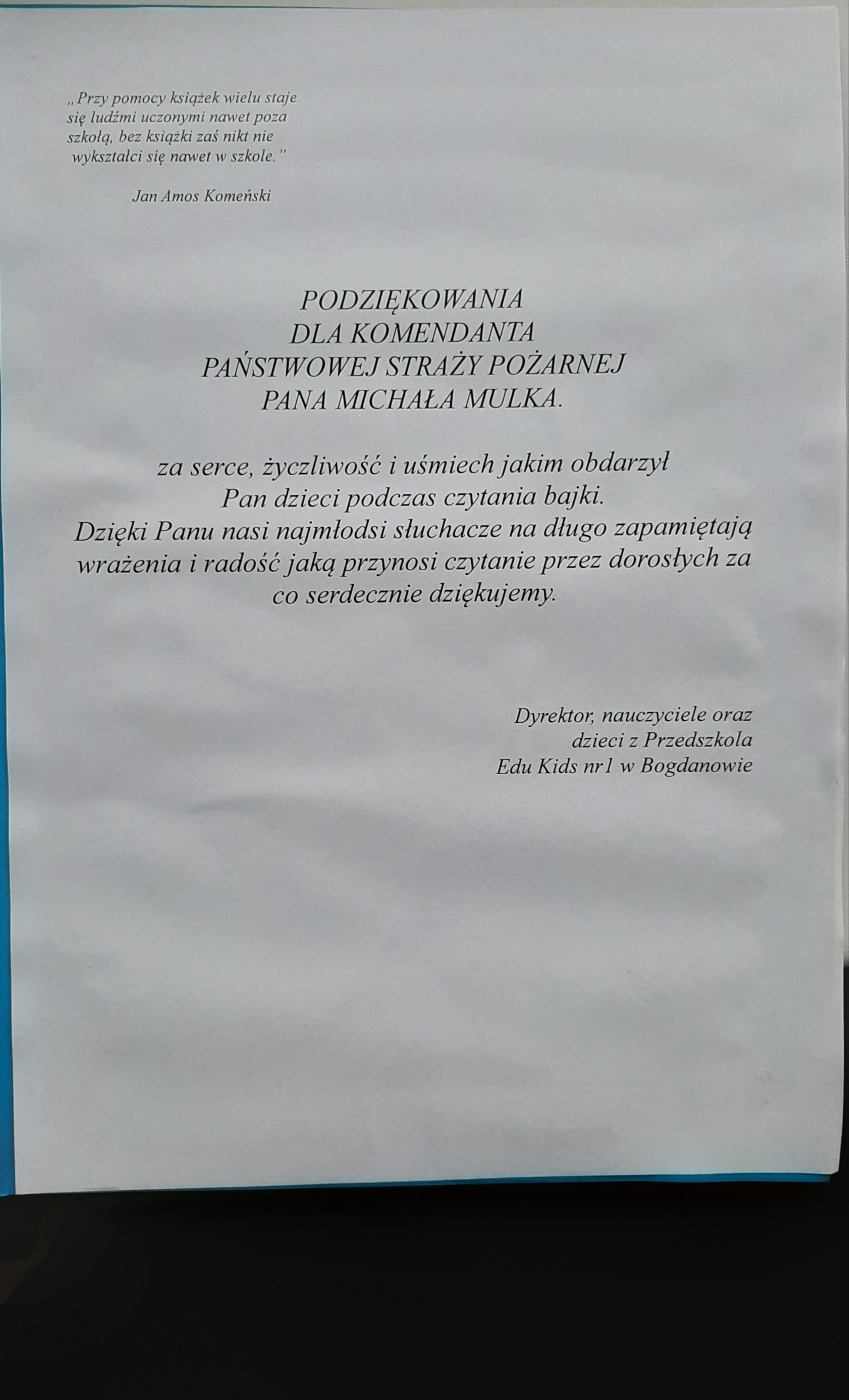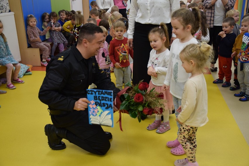 W środę, 16 listopada Komendant Powiatowy PSP w Obornikach - mł. bryg. Michał Mulka wraz z mł. kpt. Piotrem Królakiem byli gośćmi przedszkola Edu Kids w Bogdanowie. Ich wizyta odbyła się w ramach akcji promowania czytelnictwa wśród najmłodszych. Funkcjonariusze przeczytali kilku grupom przedszkolnym bajkę opowiadającą o pracy strażaków, sprzęcie pożarniczym oraz specyfice tego zawodu. Ponadto dzieci wzięły aktywny udział w pogadance z której dowiedziały się m. in. jak zostać strażakiem, co należy przekazać operatorowi numeru alarmowego przy zgłaszaniu zdarzenia i jak przebiega służba. Na koniec podopieczni przedszkola mogli przymierzyć ubranie specjalne wykorzystywane w działaniach. W ramach podziękowania strażacy otrzymali od dzieci bukiet kwiatów oraz laurkę.