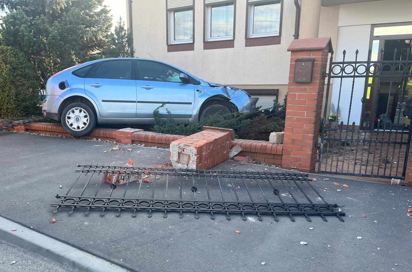 Po dojeździe na miejsce zdarzenia KDR stwierdził, że z niewyjaśnionych przyczyn na łuku drogi samochód osobowy marki FORD FOCUS wypadł z drogi i uderzył w betonowy plot prywatnej posesji. Kierująca pojazdem wraz z niemowleciem przed przybyciem JOP opuściła pojazd o własnych siłach i nie wymagala udzielenia pomocy medycznej. Na skutek zdarzenia, elementy konstrukcyjne płotu dostały się przez wybite okno do piwnicy budynku i raniły przebywająca w niej lokatorkę. Ranna mieszkanka posesji po zaopatrzeniu przez ratownika z PSP a przed przybyciem ZRM została przewieziona przez członka rodziny do szpitala w Obornikach. Po przebadaniu przez Zespół Ratownictwa Medycznego kierująca Fordem wraz dzieckiem również została przetransportowana do szpitala w Obornikach. Na czas prowadzonych działań na drodze gminnej wprowadzono ruch wahadłowy. Na miejscu obecny był Zespół Ratownictwa Medycznego oraz Policja.