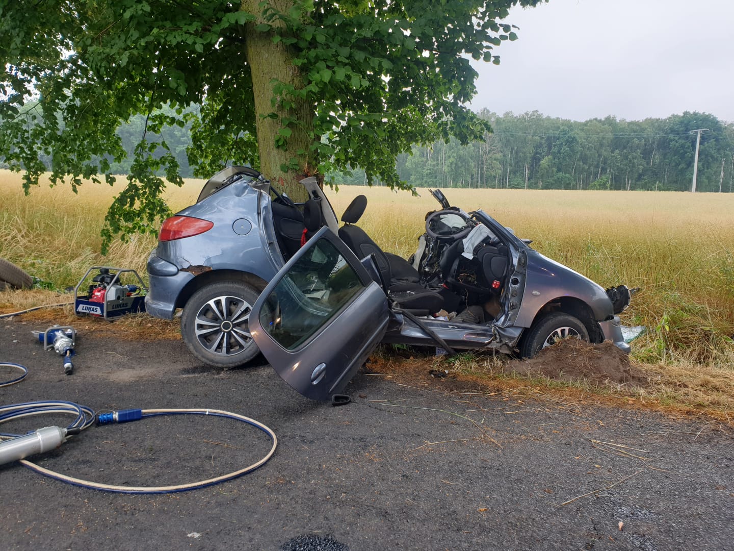 Po dojeździe na miejsce zdarzenia KDR stwierdził, że na prostym odcinku drogi prowadzącej ze Studzieńca do Budziszewka samochód osobowy marki Peugeot 206 uderzył w przydrożne drzewo. Zakleszczony 43 – letni kierujący samochodem wymagał udzielenia pomocy medycznej. Osoba poszkodowana po wydobyciu z pojazdu przy użyciu narzędzi hydraulicznych została przekazana Zespołowi Ratownictwa Medycznego a następnie przetransportowana do Szpitala Powiatowego w Wągrowcu. Na czas prowadzonych działań droga powiatowa była zablokowana w obu kierunkach. Na miejscu obecny był Zespół Ratownictwa Medycznego oraz Policja.