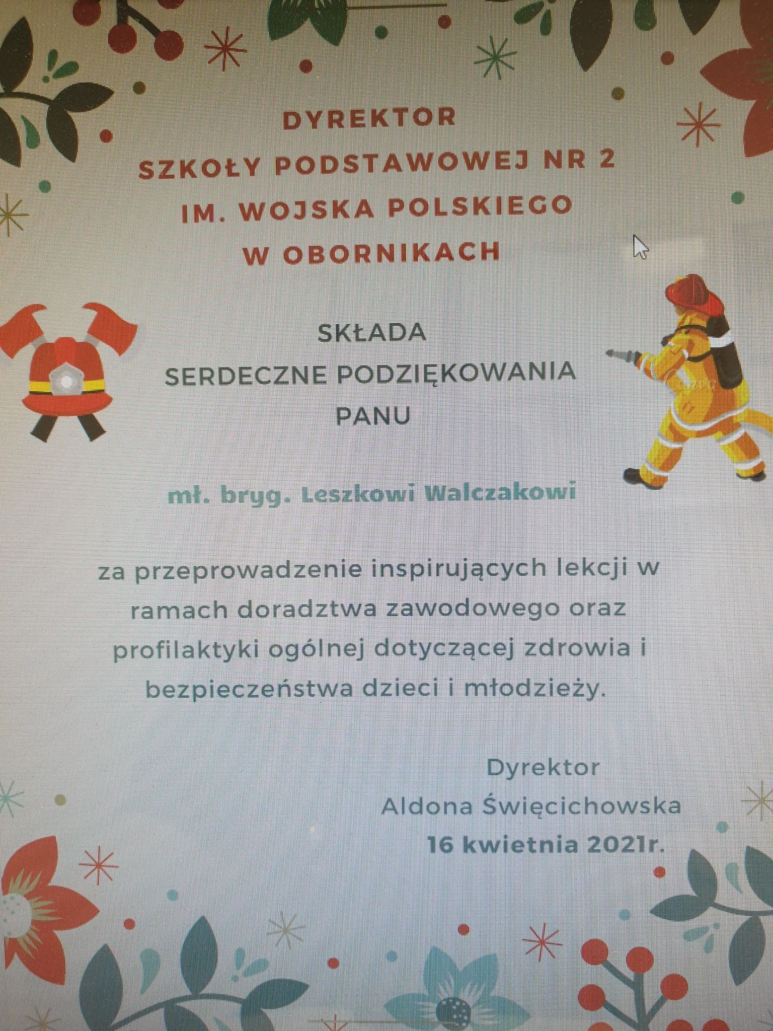 Wszyscy wiedzą, że każdy mały chłopiec marzy o tym, by zostać strażakiem. Dlatego wiele emocji i radości sprawiła w dniu 15 i 16 kwietnia br. uczniom Szkoły Podstawowej nr 2 im. Wojska Polskiego w Obornikach nietypowa lekcja on – line. W ramach doradztwa zawodowego oraz profilaktyki ogólnej dotyczącej zdrowia i bezpieczeństwa dzieci i młodzieży adresowanego dla klas 1 – 3, których tematem była charakterystyka oraz specyfika służby w zawodzie strażak uczestniczył dowódca JRG Oborniki – mł. bryg. Leszek Walczak. W zajęciach udział wzięło około 120 dzieci wraz z nauczycielami.