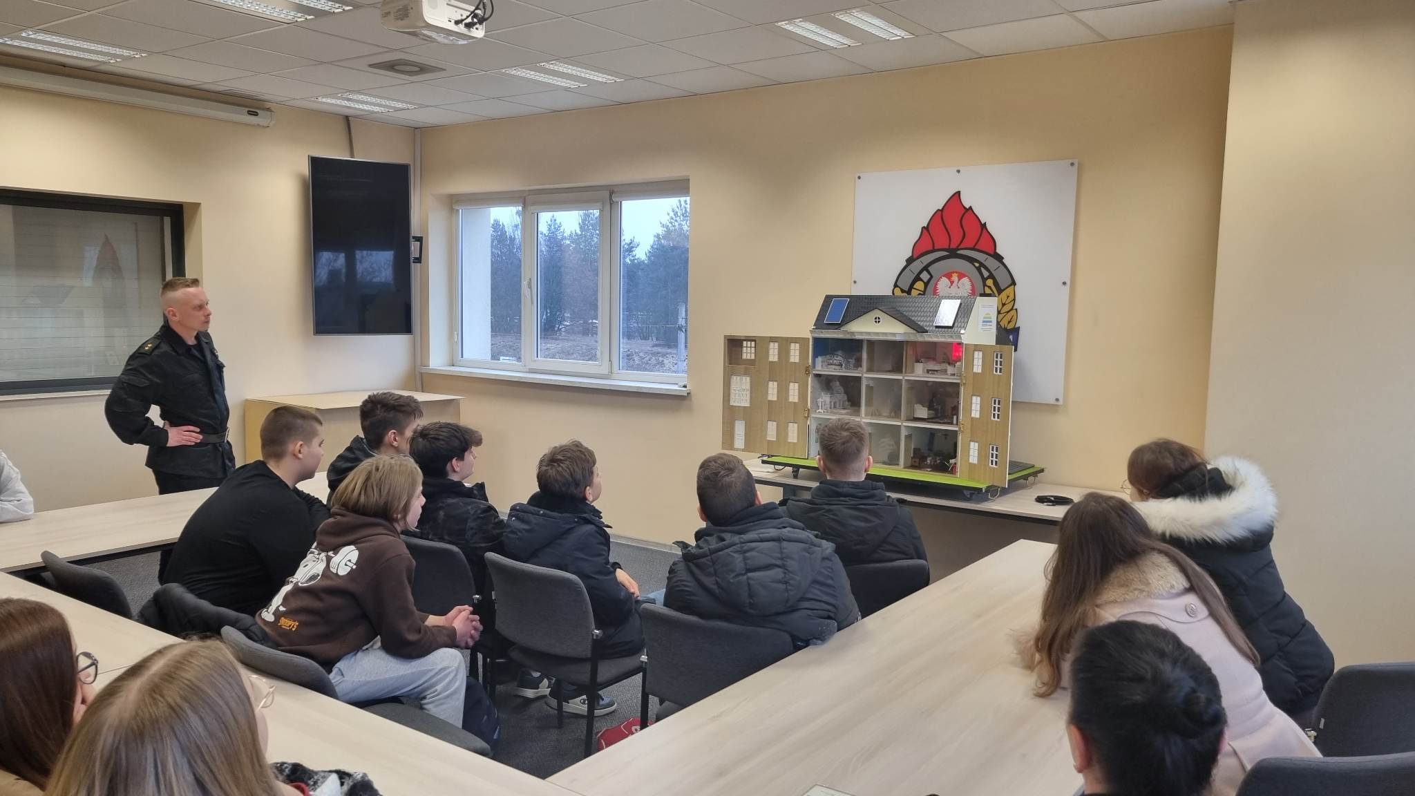 Na koniec wizyty Młodzieży został pokazany Mobilny Symulator Zagrożeń w postaci domku jednorodzinnego będącego na wyposażeniu tut. Komendy. Dzięki poszczególnym scenariuszom można było im zaprezentować zagrożenia pożarowe i inne niebezpieczne zdarzenia, jakie mogą mieć miejsce w domu. Efekty świetlne, dźwiękowe oraz wydobywający się dym realnie oddały grozę sytuacji, pobudzając wyobraźnię Uczniów.