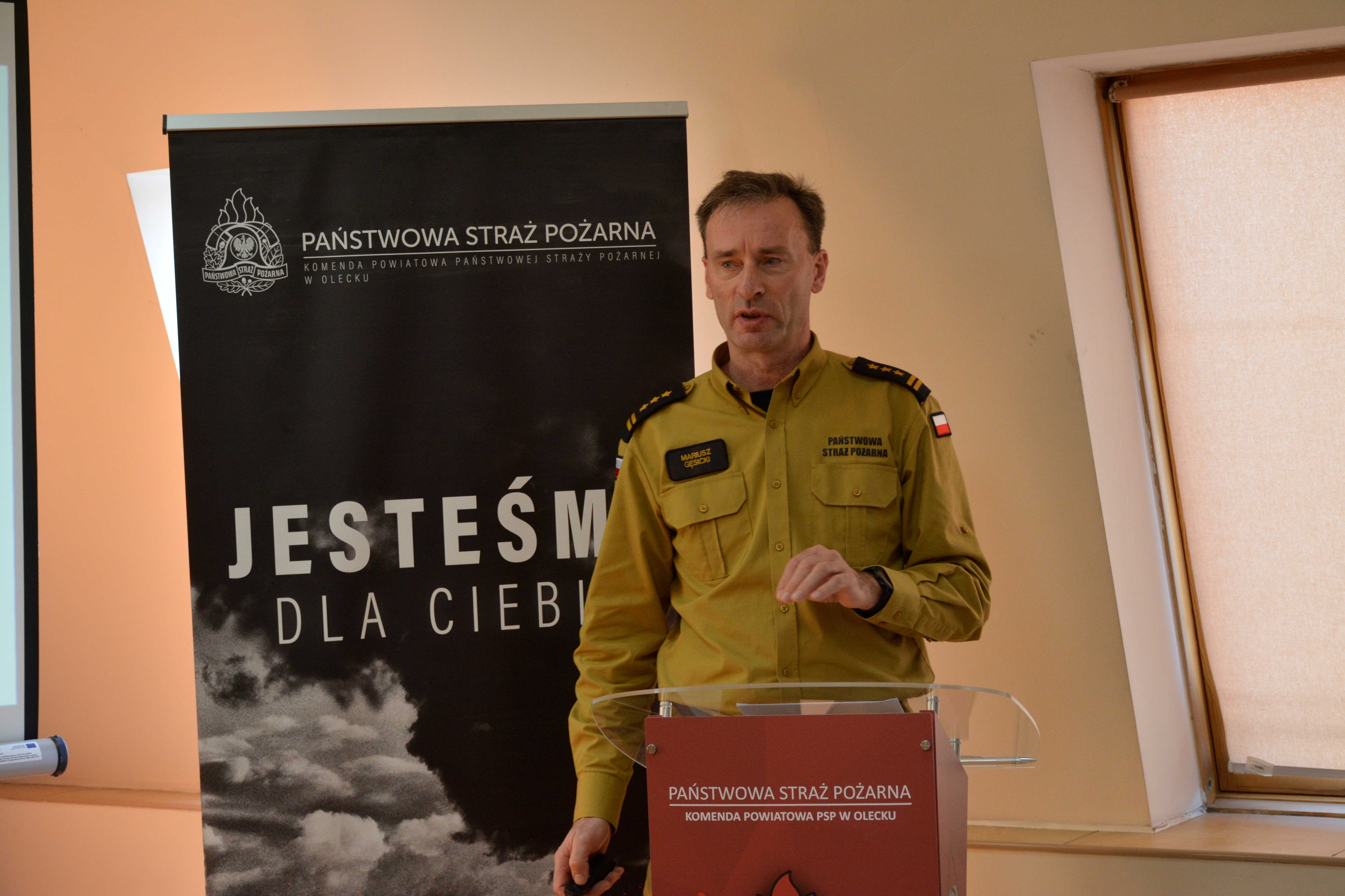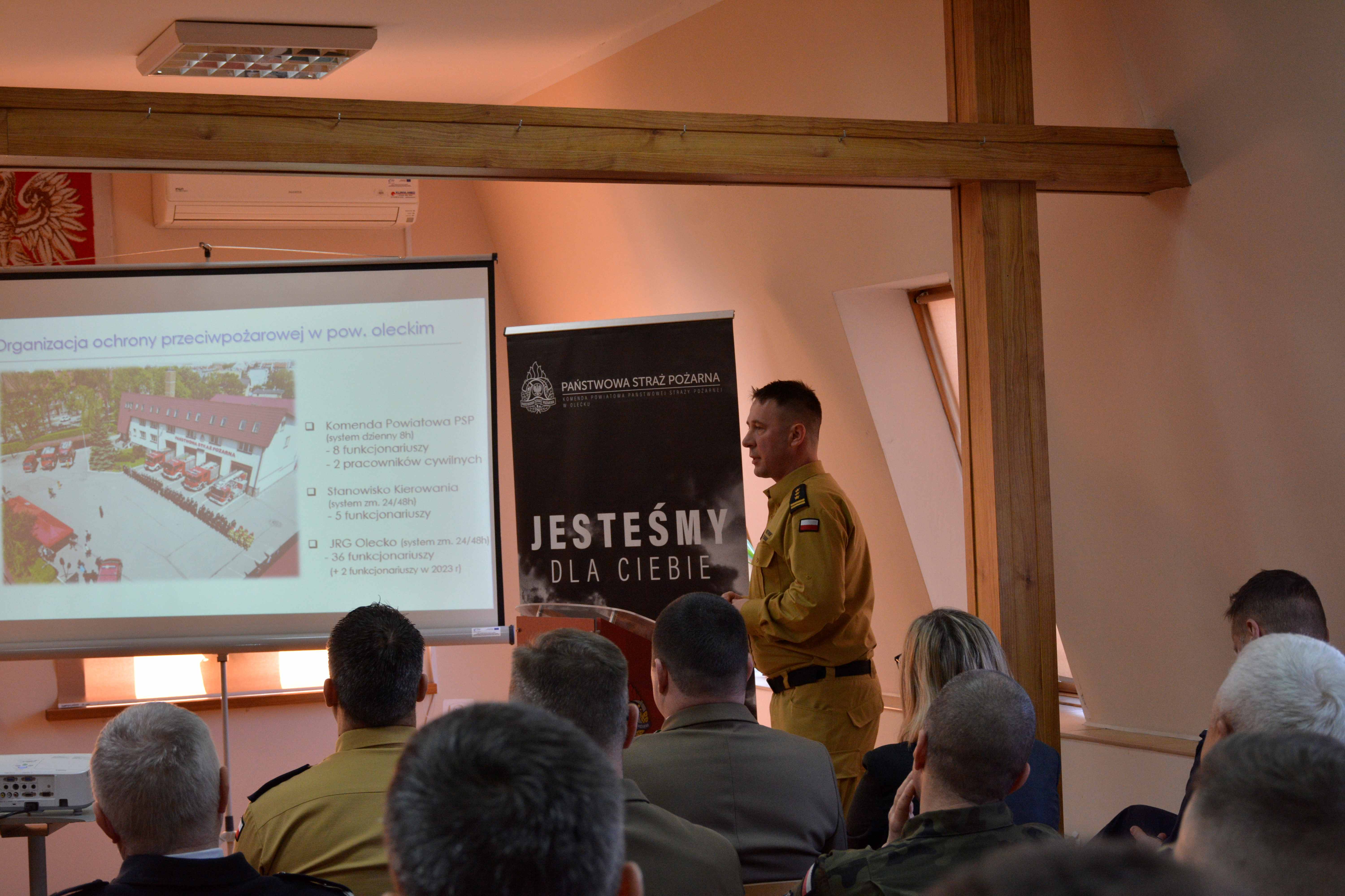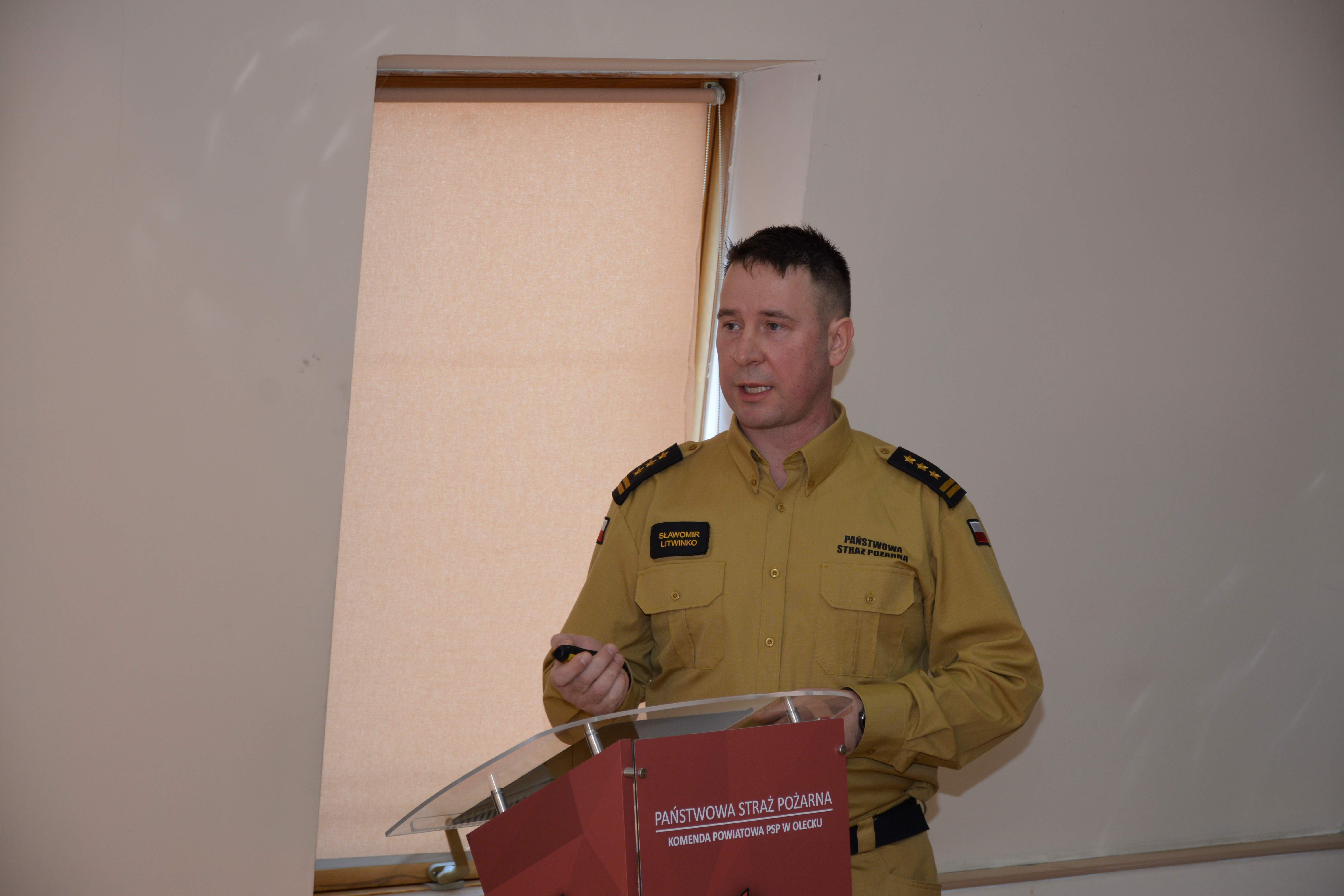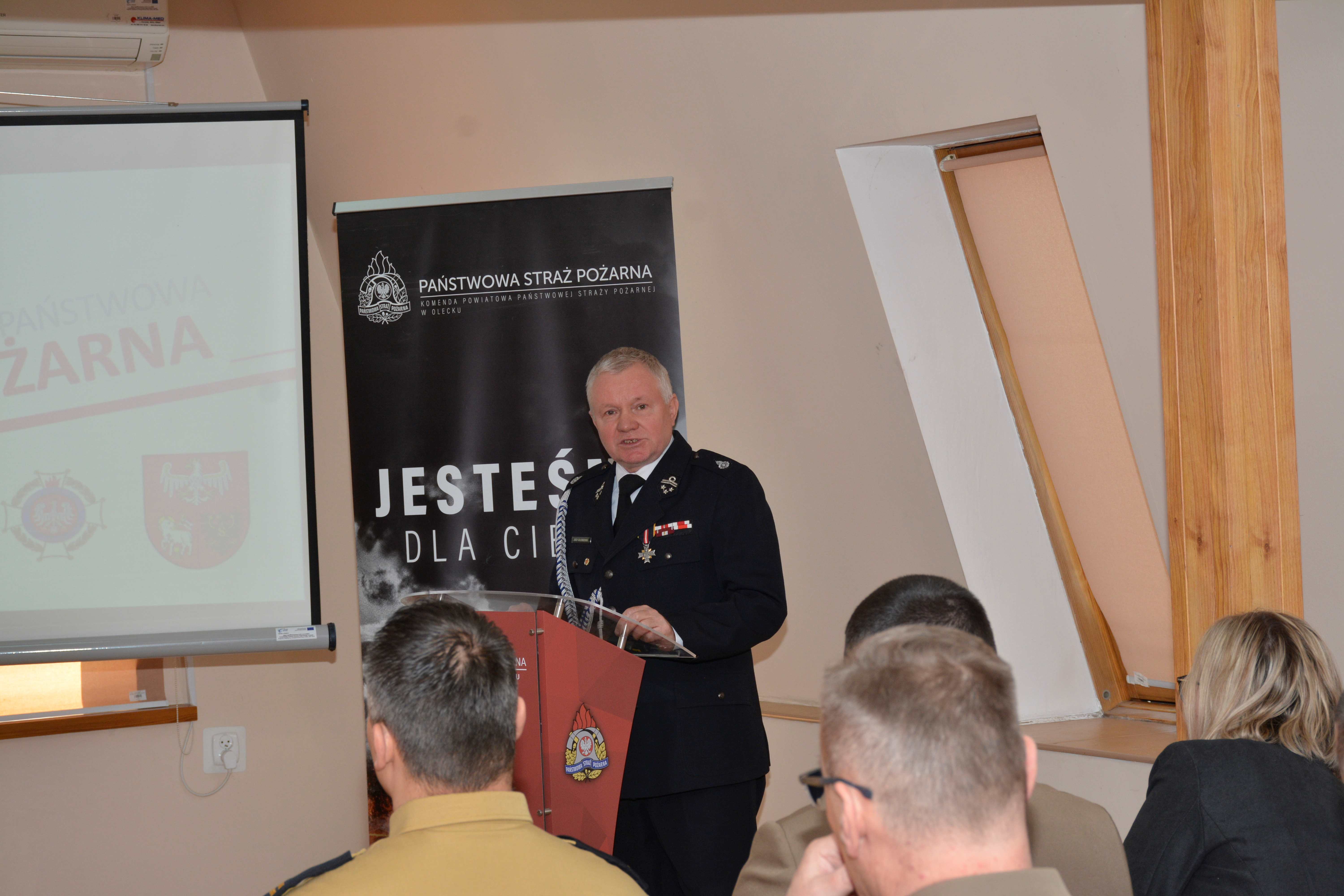 Meldunek o rozpoczęciu narady przyjął Zastępca Warmińsko-Mazurskiego Komendanta Wojewódzkiego PSP, st. bryg. Mariusz Gęsicki. Następnie Komendant Powiatowy PSP w Olecku, st. bryg. Sławomir Litwinko, przedstawił prezentację podsumowującą całoroczną działalność Komendy Powiatowej PSP w Olecku.