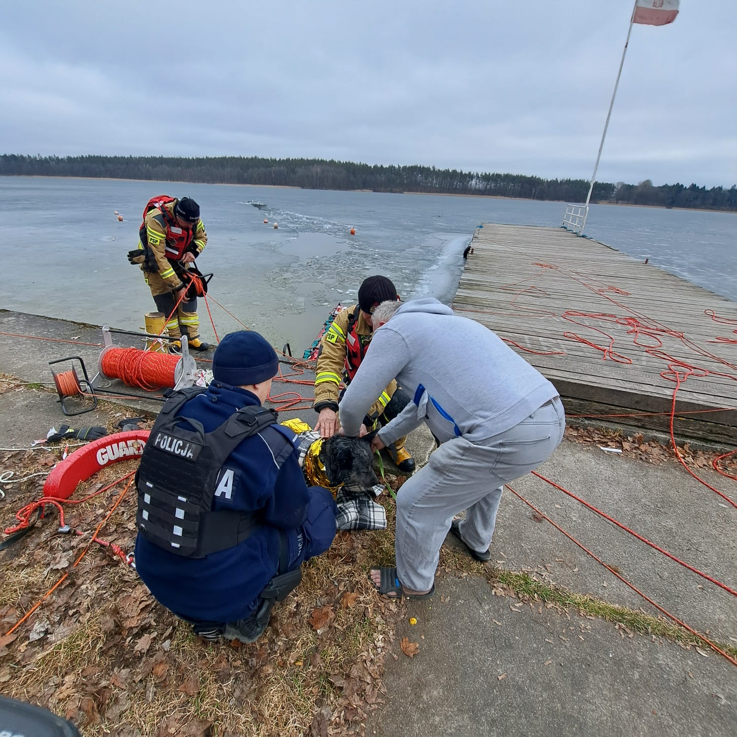 Na miejsce natychmiast zadysponowano zastępy Komendy Powiatowej PSP w Olecku i Policję. Strażacy błyskawicznie rozpoczęli działania ratownicze, wykorzystując specjalistyczny sprzęt przeznaczony do akcji na zamarzniętych akwenach. Dzięki sprawnej i profesjonalnej interwencji ratownicy dotarli do zwierzęcia i bezpiecznie ewakuowali je z wody.