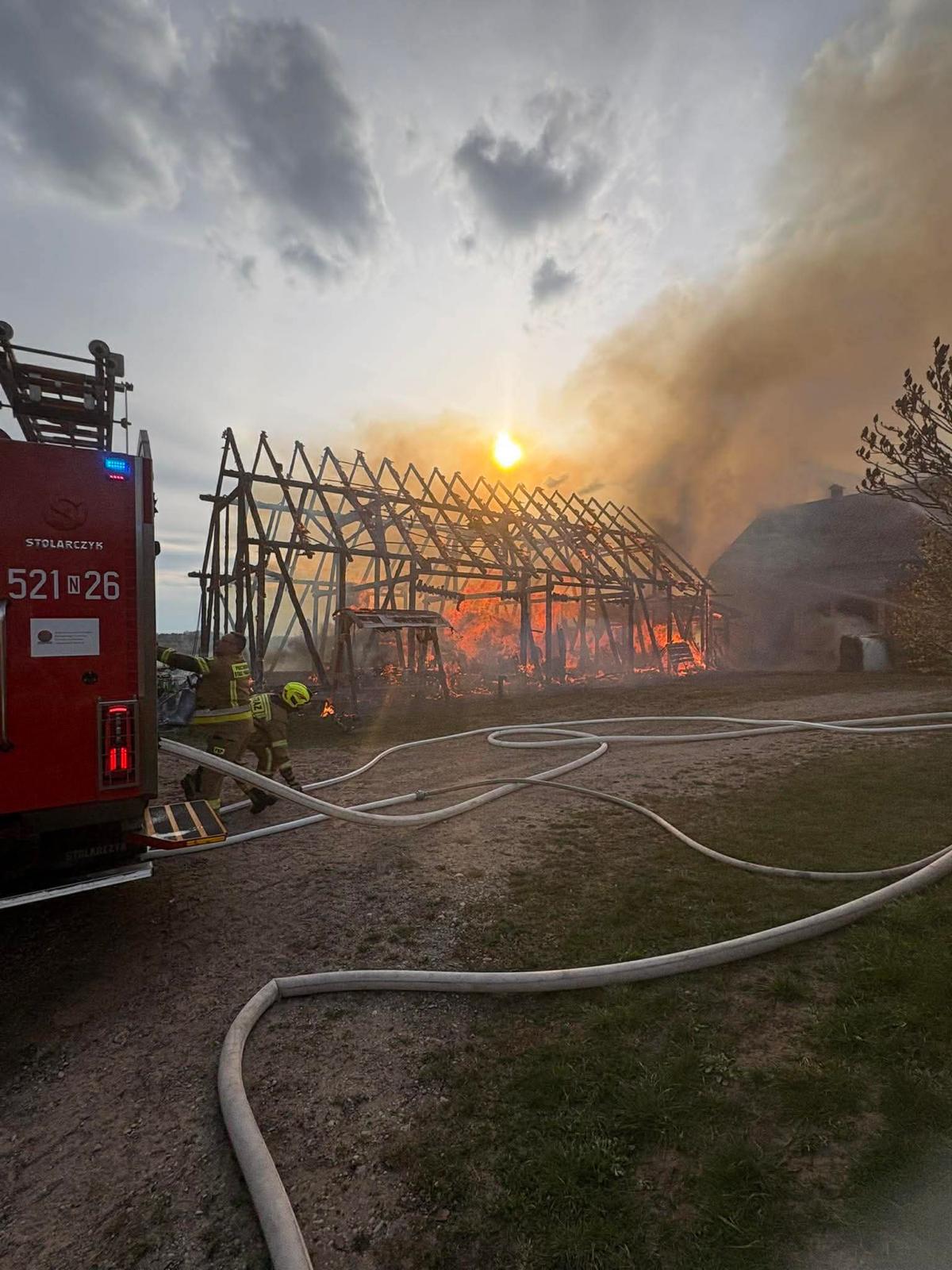 W dniu 14 kwietnia 2026 roku, około godziny 17:12, do Stanowiska Kierowania Komendanta Powiatowego Państwowej Straży Pożarnej w Olecku wpłynęło zgłoszenie o pożarze budynku gospodarczego o konstrukcji drewnianej w miejscowości Giże.