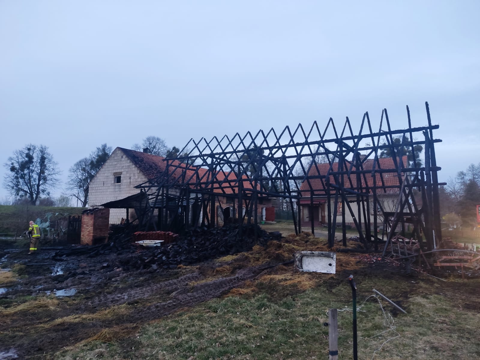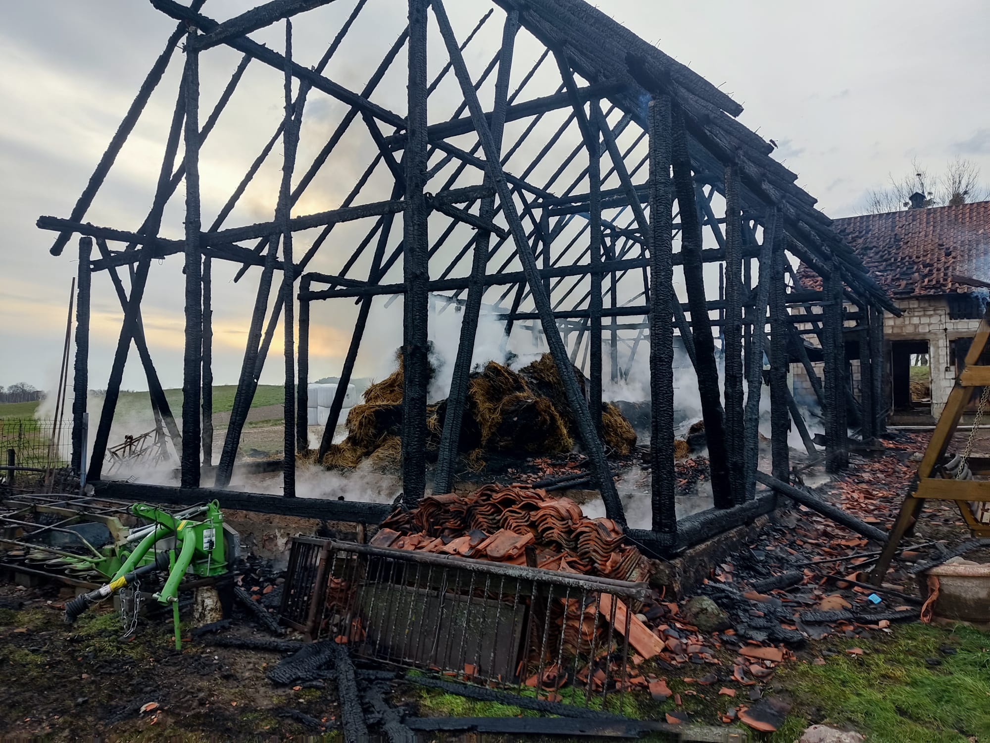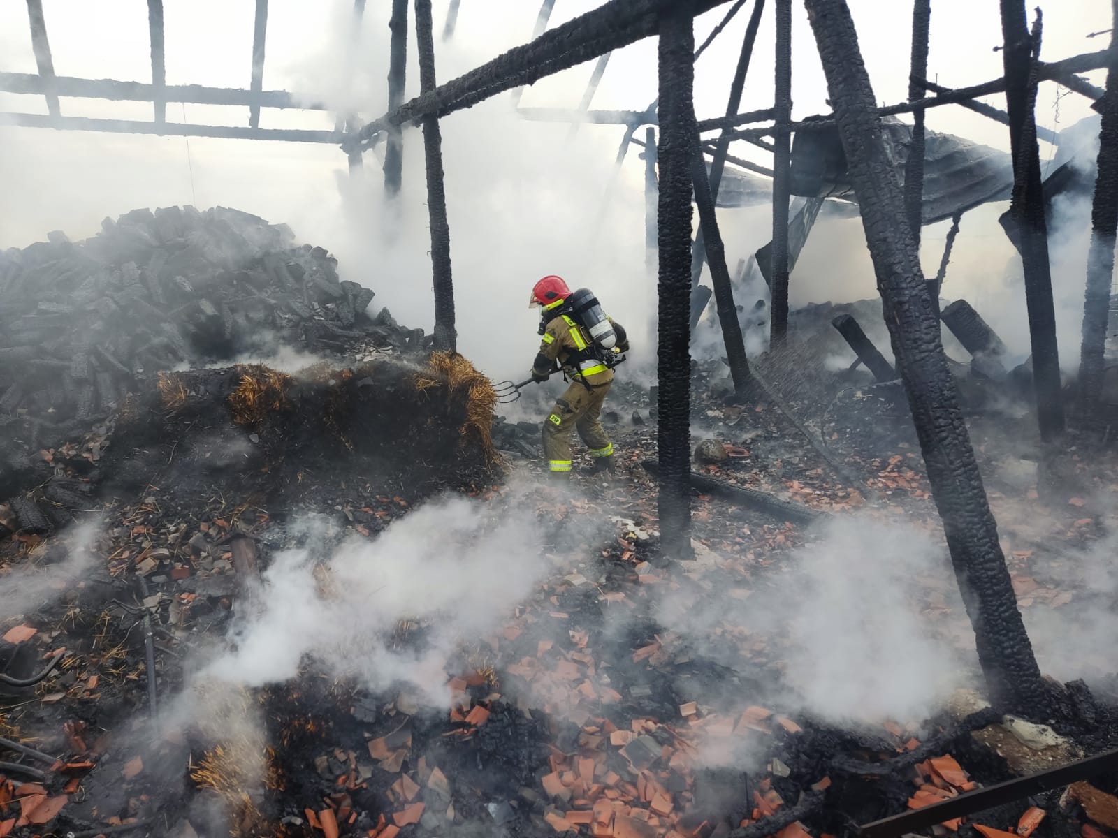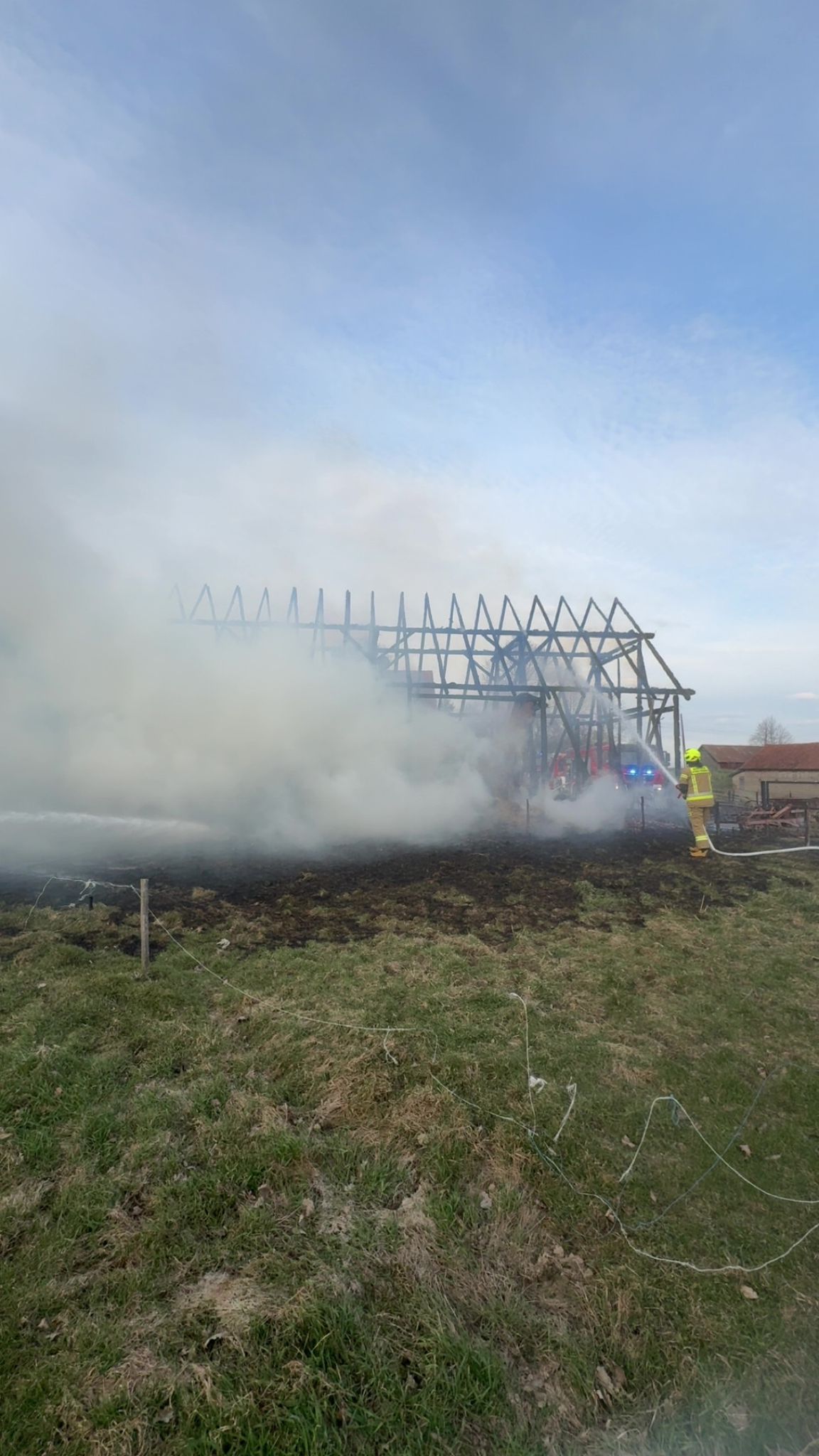 Po przybyciu pierwszych zastępów straży pożarnej potwierdzono, że ogniem objęty jest cały budynek gospodarczy. Sytuacja wymagała natychmiastowego podjęcia działań gaśniczych oraz zabezpieczenia pobliskich obiektów.